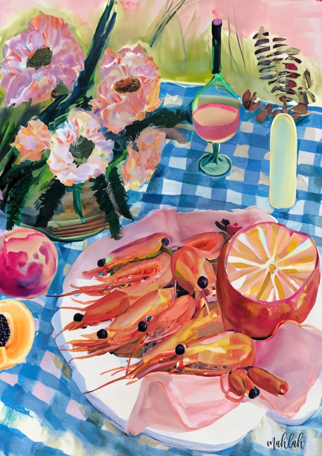 Prawn Lunch by Inkheart Designs captures a refined moment of coastal dining with meticulous artistic detail. This illustration presents an elegantly composed scene featuring succulent prawns arranged on fine china, accompanied by a refreshing pink beverage and delicate floral accents, all set against a classic checkered tablecloth. The artwork combines sophisticated colour palettes with precise linework, making it an ideal choice for kitchen spaces, dining areas, or culinary-themed interiors. Perfect for those who appreciate both gastronomic aesthetics and quality illustration work.