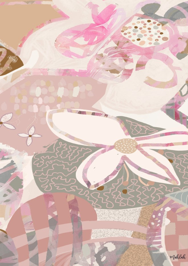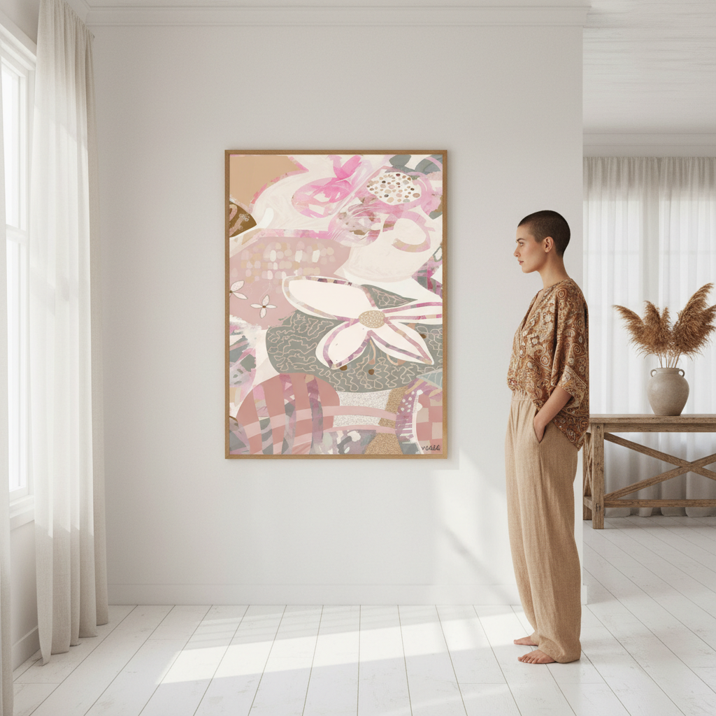 Sacred Bloom by Inkheart Designs brings contemporary artistry to your space with a sophisticated composition of botanical and geometric elements. This striking piece features vibrant florals interwoven with clean linear shapes, all set against a serene light pink backdrop that grounds the composition. The interplay between organic and structured forms creates visual depth, making it an ideal choice for modern interiors seeking both colour and refinement. Perfect for adding personality to living spaces, bedrooms, or creative studios.