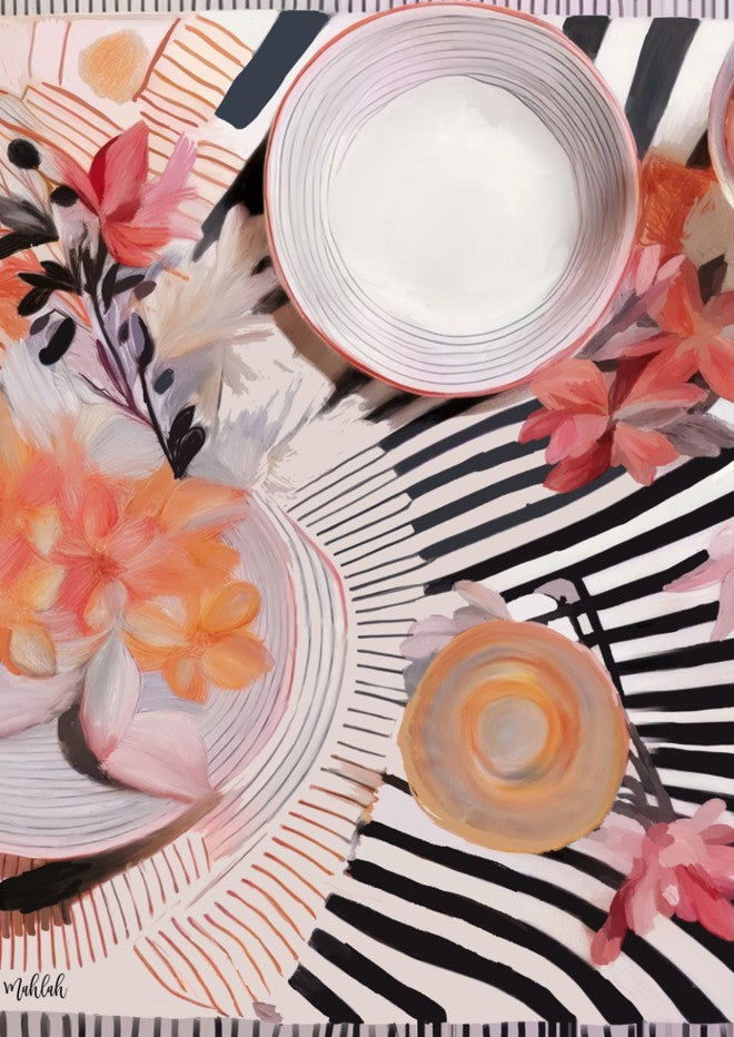 Stripe Breakfast by Inkheart Designs brings contemporary artistry to your table with a striking collection of dinnerware featuring vibrant floral and abstract motifs set against crisp striped backgrounds. Each plate showcases thoughtfully layered patterns that blend botanical elements with geometric precision, creating visual interest that complements both modern and eclectic table settings. Crafted for everyday elegance, these pieces transform ordinary meals into curated dining experiences while maintaining the durability needed for regular use. Perfect for those who appreciate design-forward tableware that doesn't compromise on functionality.