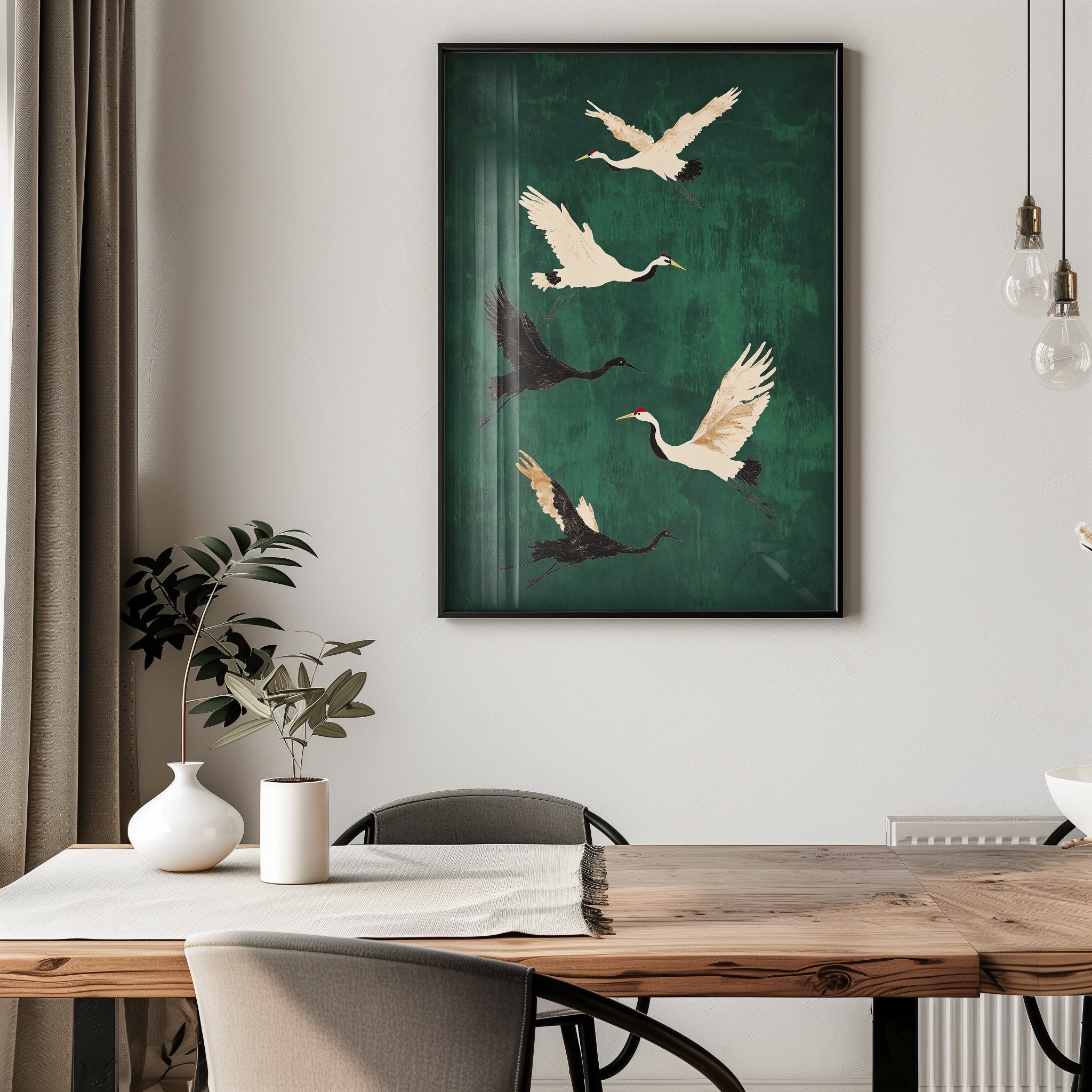 Elevate your living space with the Five Crane Emerald Flying poster, a sophisticated art piece that brings a touch of elegance and movement to any room. Its vibrant emerald hues and graceful crane design create a serene atmosphere, perfect for living rooms, kitchens, or bedrooms. This artwork adds a refined yet lively accent, enhancing your décor with timeless beauty and subtle charm.