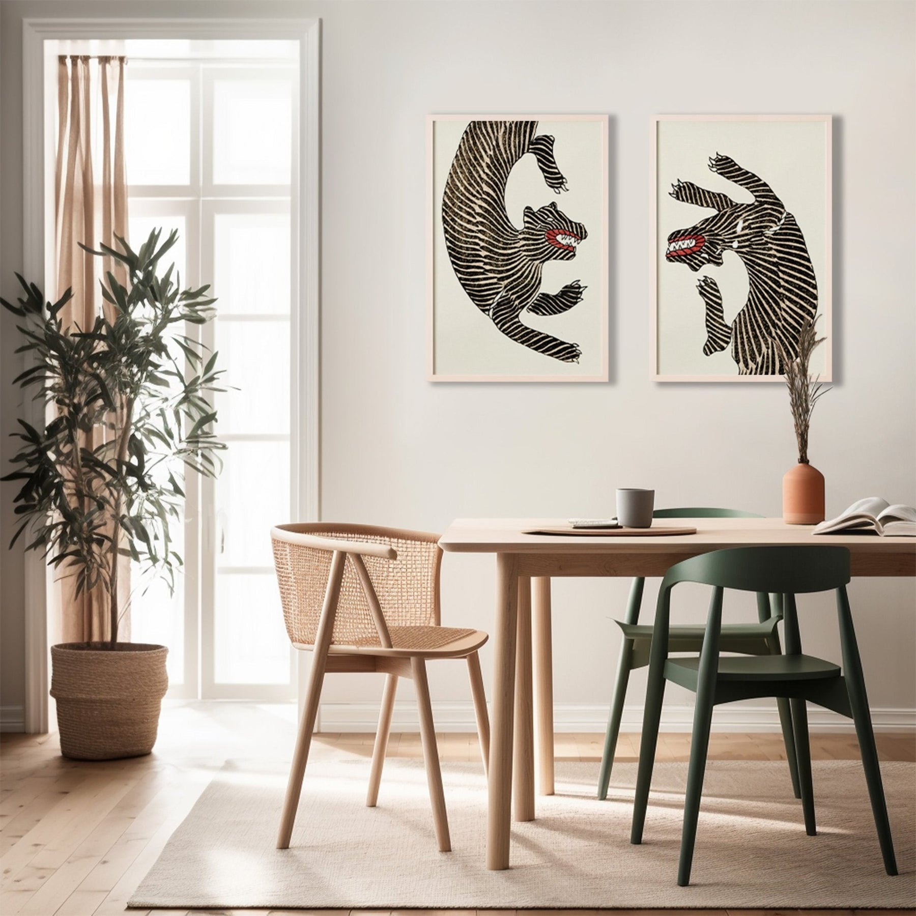 Transform any space into a roaring good time with this Japanese Tigers Pair! Perfect for adding a touch of fun to your kitchen, study, bedroom, living room, or dining room. These playful tigers are sure to bring some quirky flair to your home!