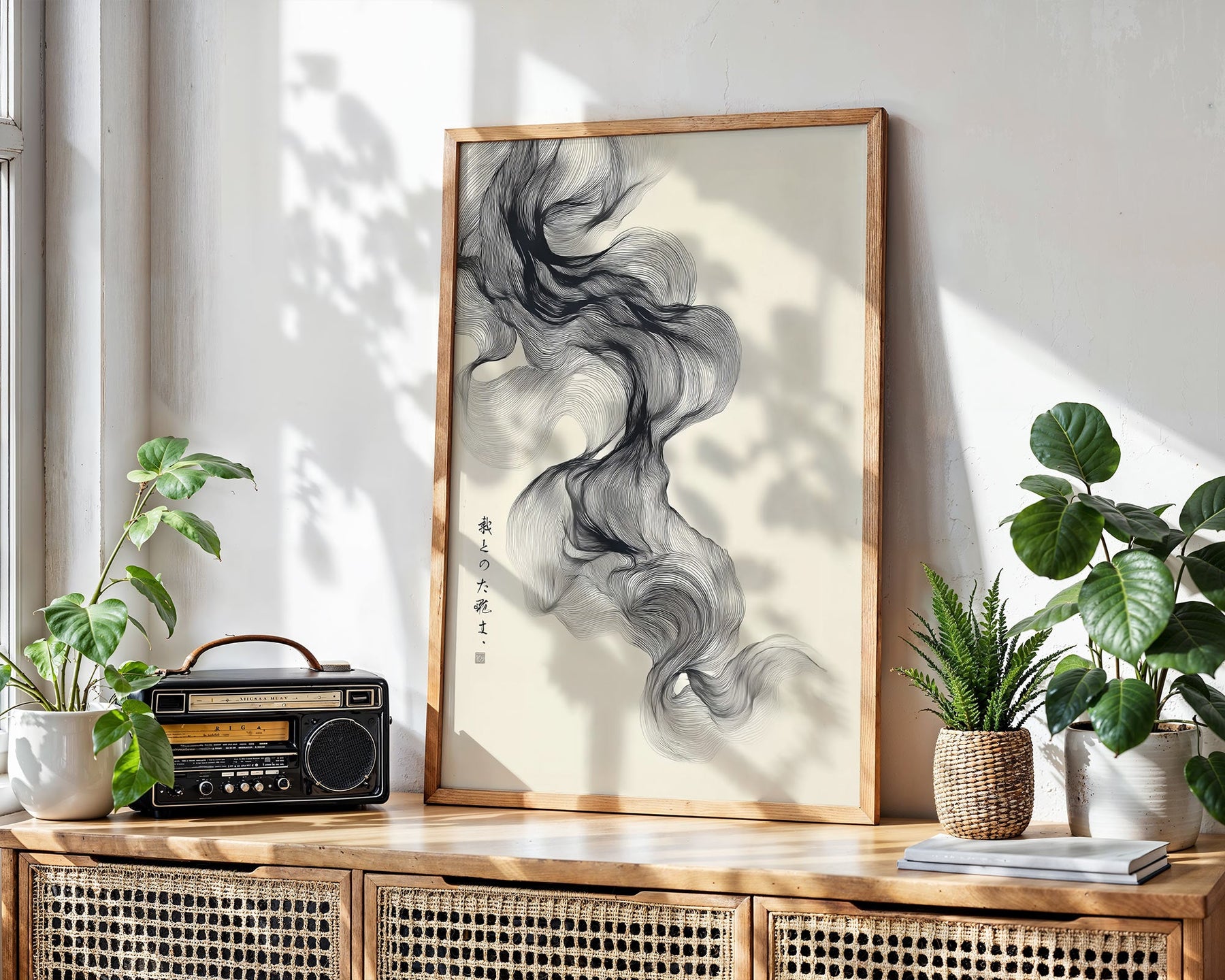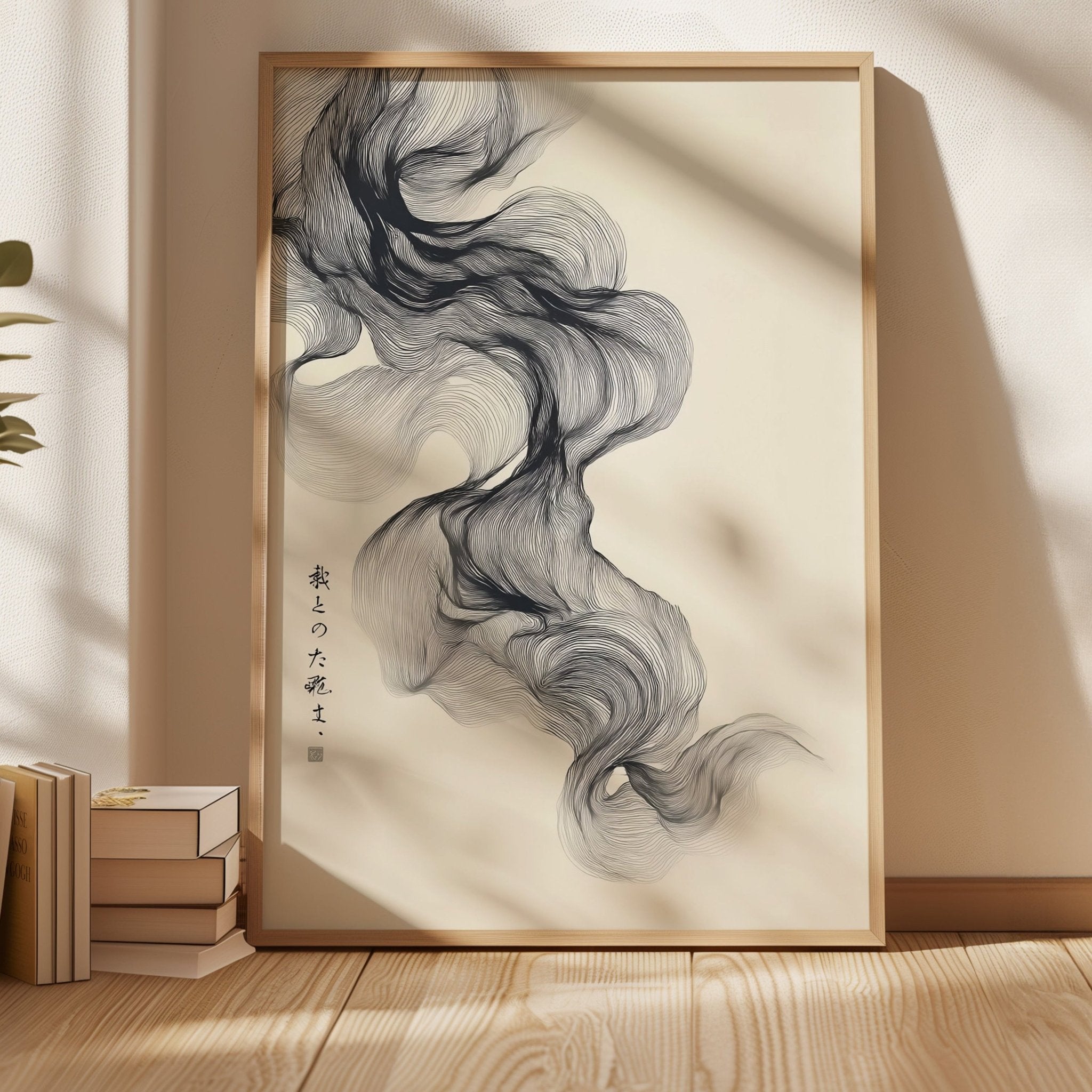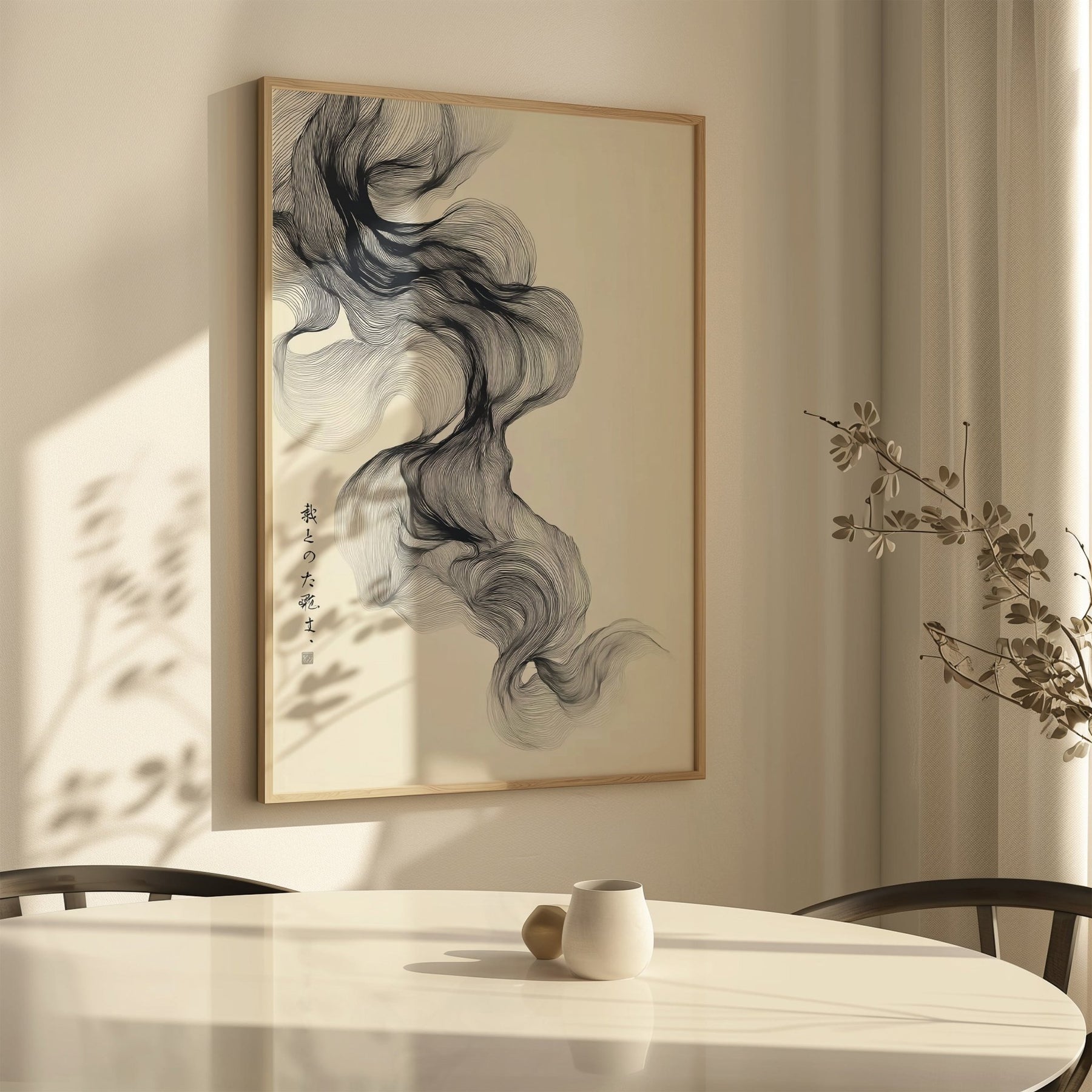 Whispers of Ink Japanese Print captures the essence of minimalist line art through flowing brushwork inspired by traditional Japanese aesthetics. This striking wall art features delicate ink strokes that dance across the canvas, creating an understated yet sophisticated focal point for any interior. The monochromatic palette and organic linework evoke the contemplative beauty of classical Japanese design, making it an ideal choice for those seeking to infuse their space with cultural refinement and artistic depth. Perfect for modern, contemporary, or zen-inspired interiors.