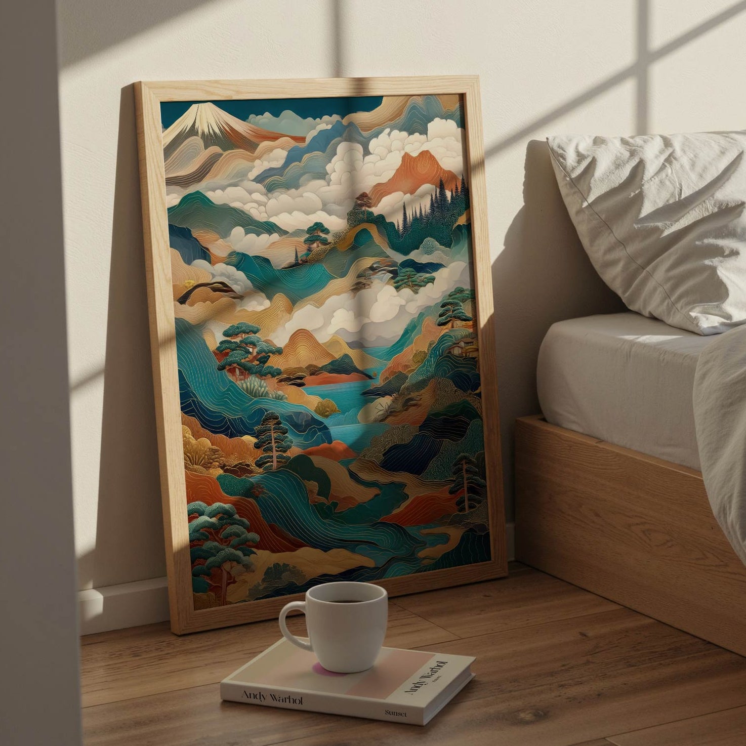Whispers of the Peaks captures the serene essence of Japanese landscape tradition with a contemporary artistic sensibility. This evocative print draws inspiration from classical ukiyo-e aesthetics, presenting misty mountain vistas rendered in soft, harmonious tones. The composition invites contemplation, making it an ideal choice for spaces seeking understated elegance and cultural depth. Perfect for creating a focal point in living areas, bedrooms, or meditation spaces, this illustration brings the tranquility of nature indoors. The refined design complements both minimalist and eclectic interiors, offering a sophisticated addition to your wall art collection.