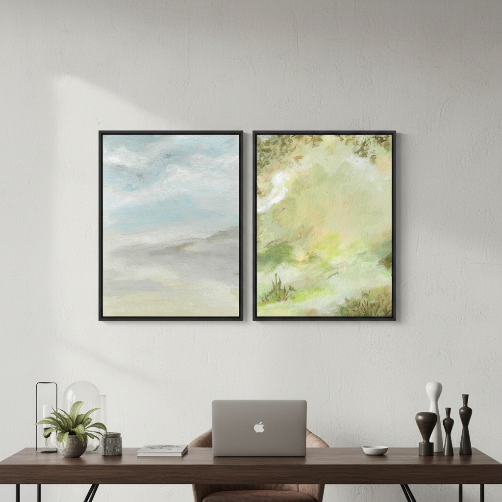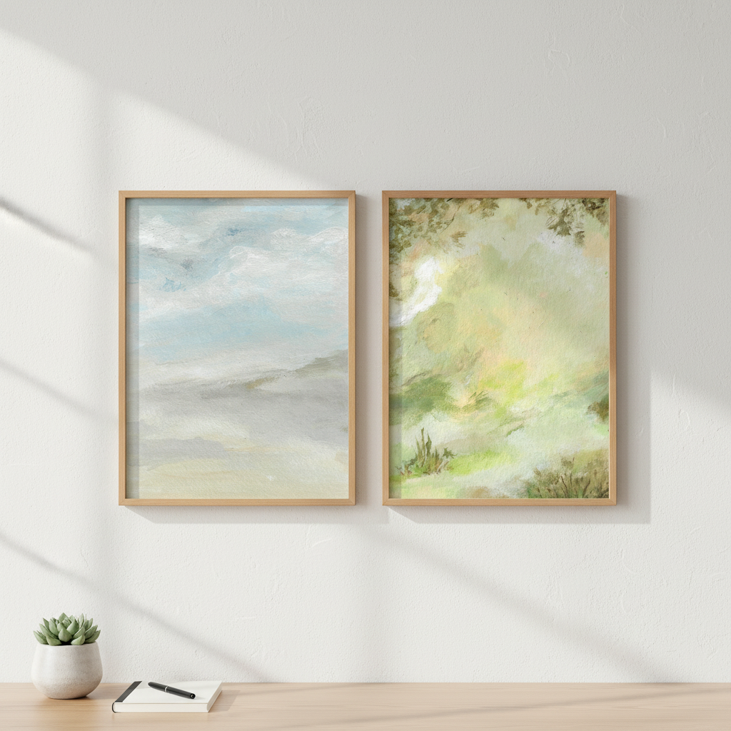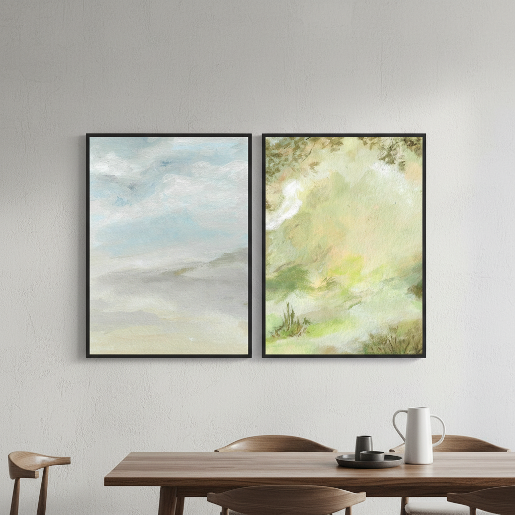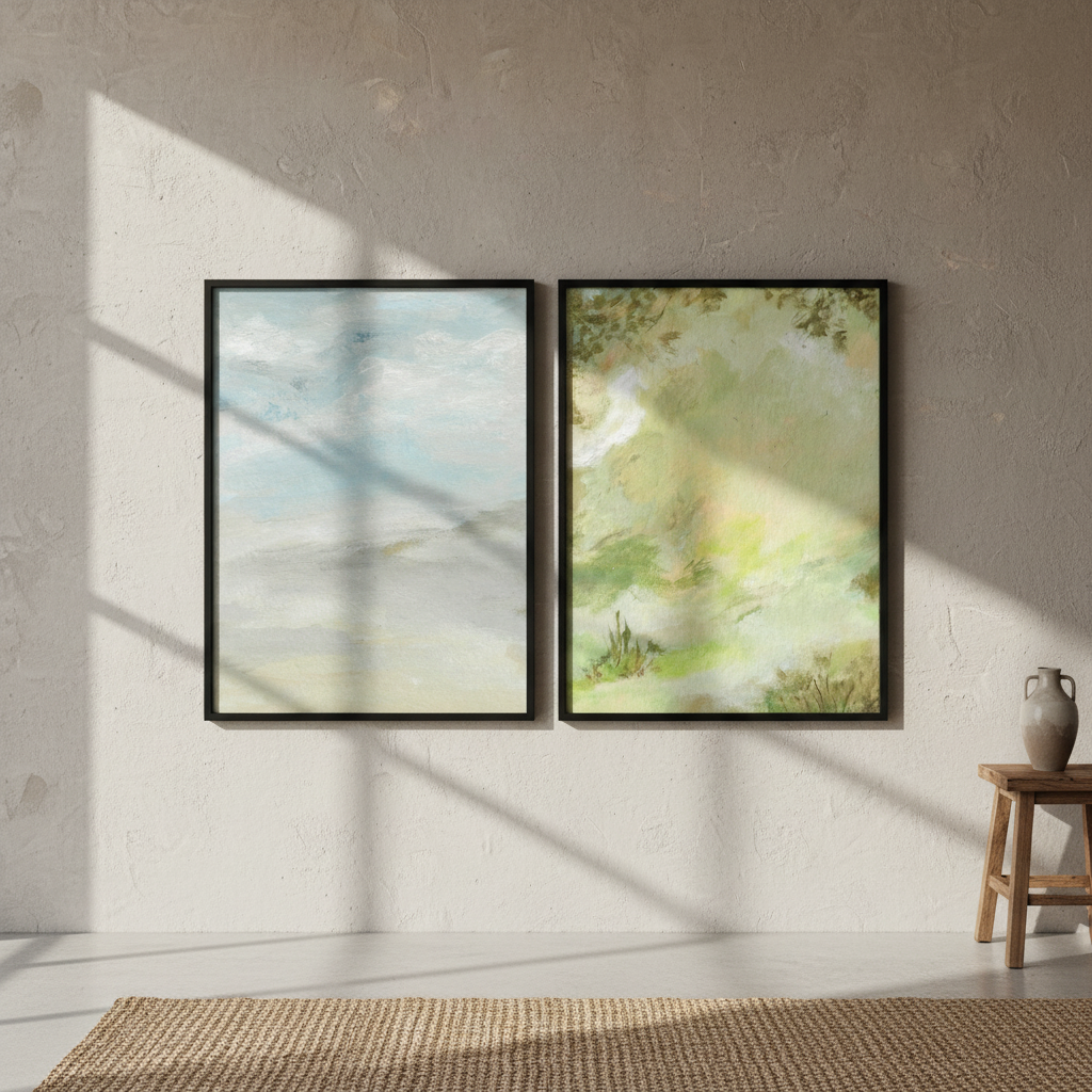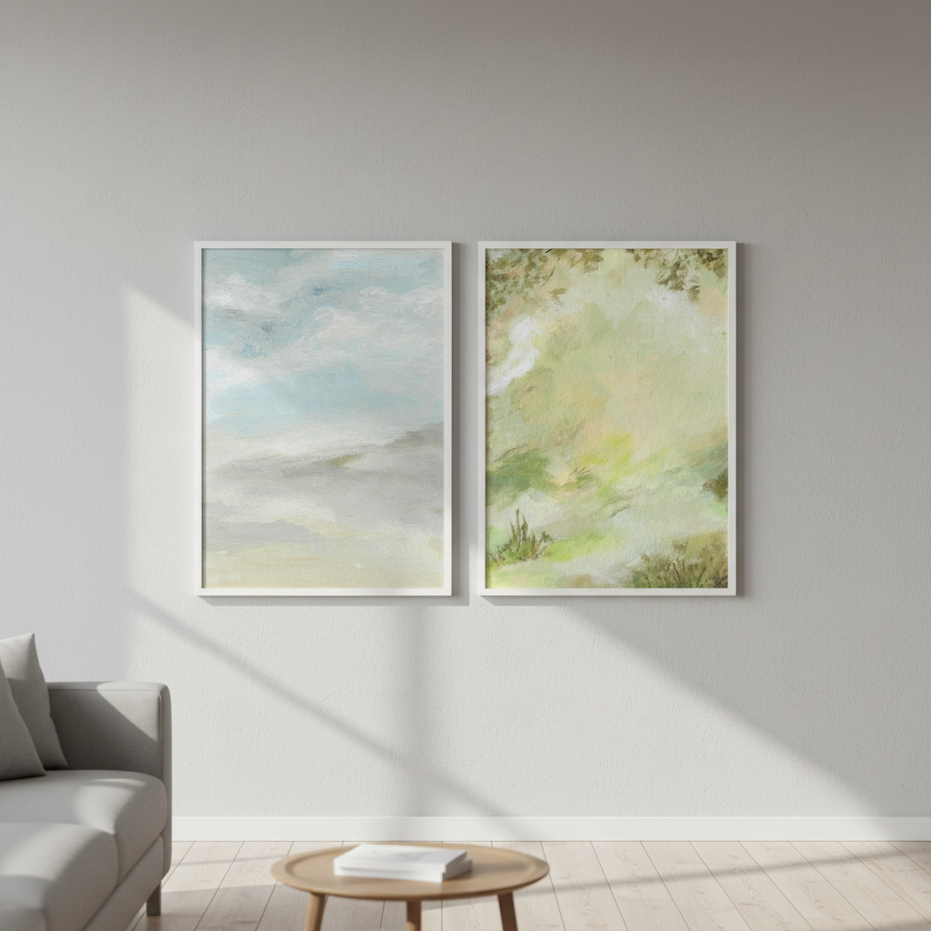 A Starking Duo by Josephine Wianto presents a compelling two-piece collection that merges contemporary aesthetics with sophisticated colour palettes. The first artwork showcases delicate watercolour techniques in soft green and beige tones, creating an ethereal, contemplative mood. The second piece features a marble-inspired surface with grey, white, and blue hues, delivering a modern, textural element. Together, these works offer versatile styling options for curated interiors, whether displayed as a cohesive gallery wall or positioned separately to anchor different spaces. Ideal for those seeking refined, understated elegance with artistic depth.