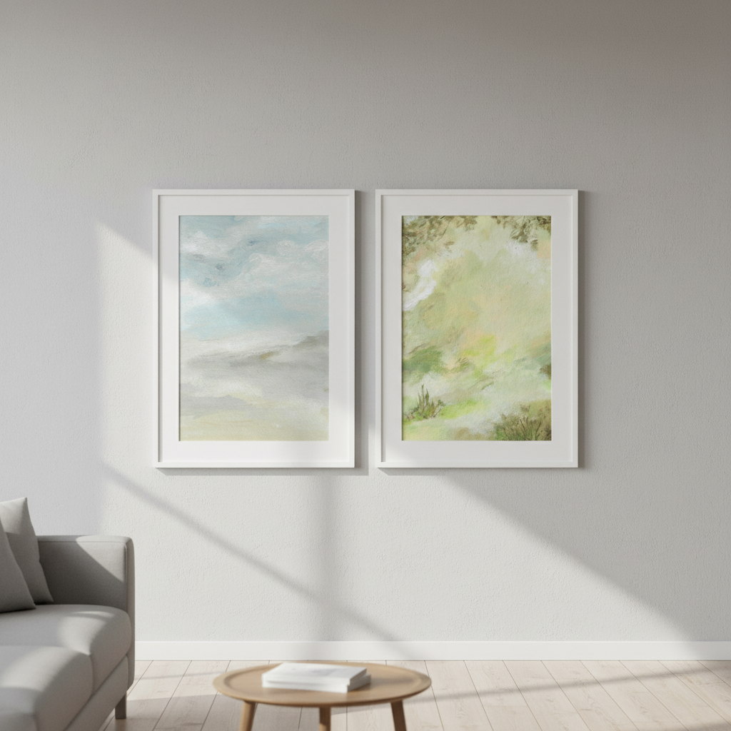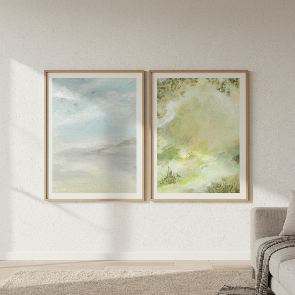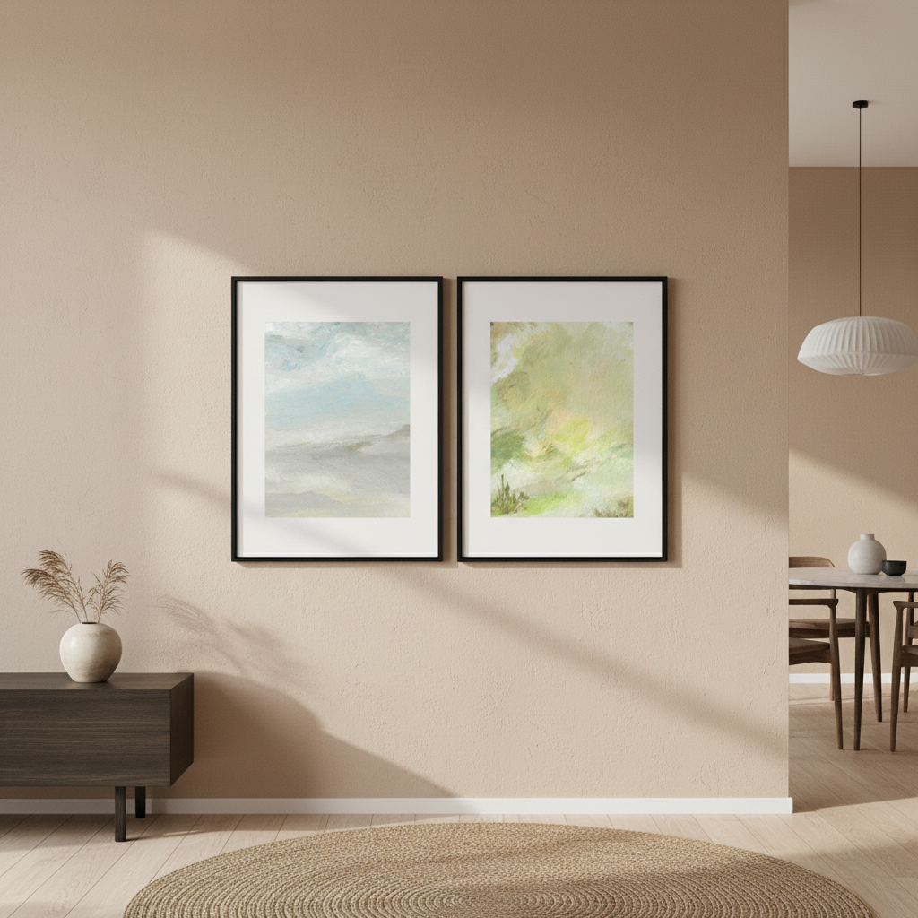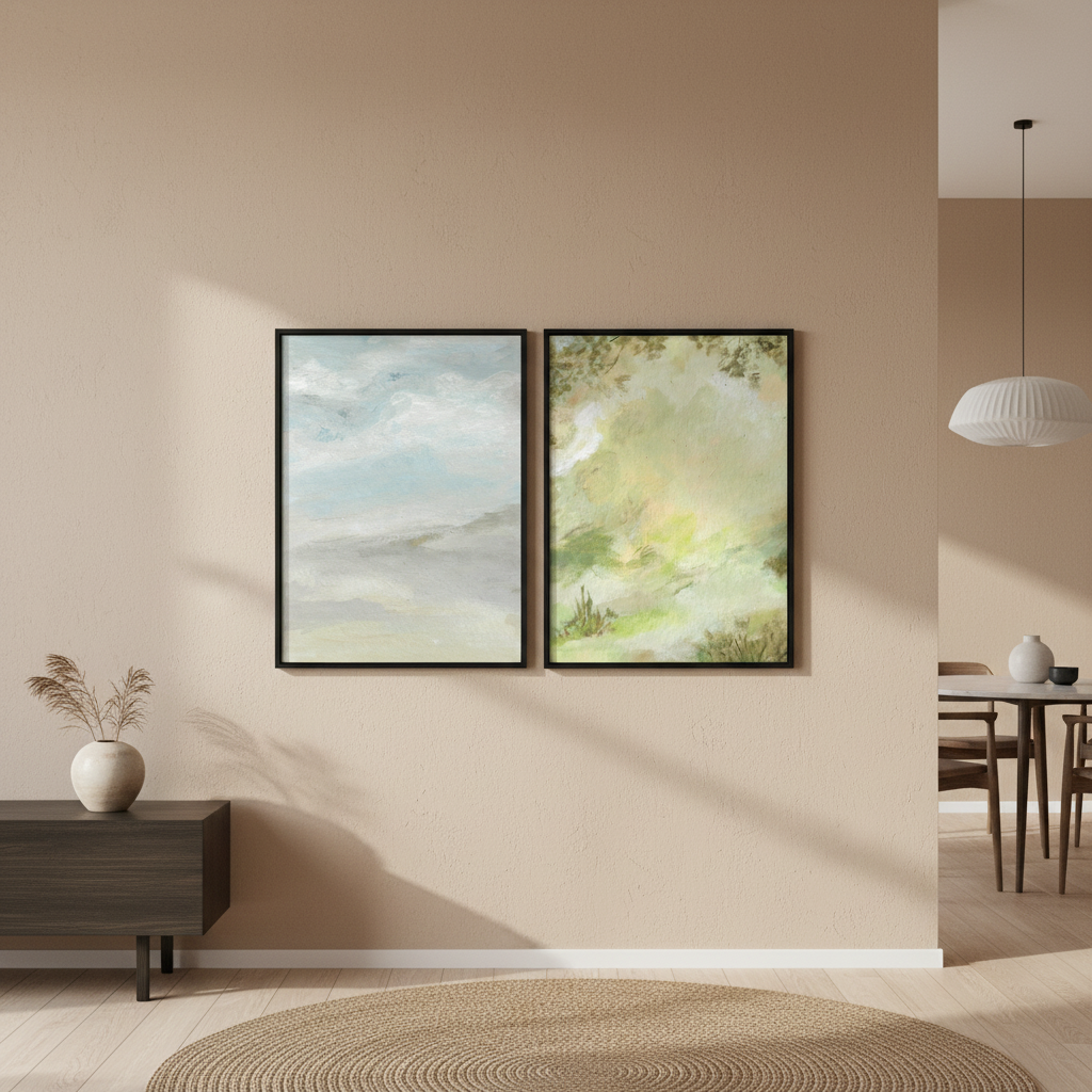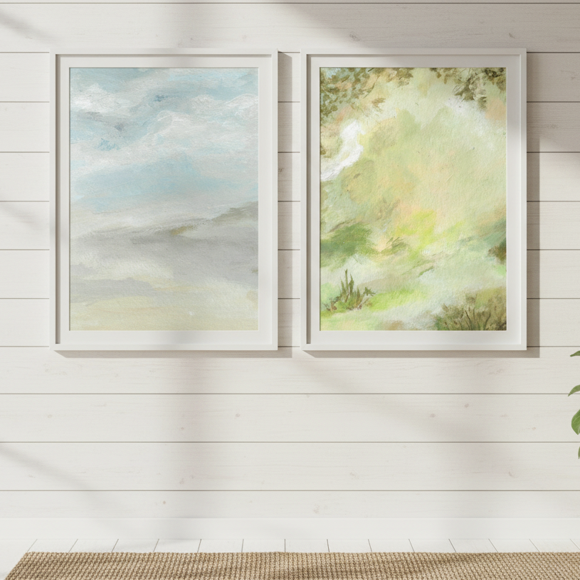 A Starking Duo by Josephine Wianto presents a compelling two-piece collection that merges contemporary aesthetics with sophisticated colour palettes. The first artwork showcases delicate watercolour techniques in soft green and beige tones, creating an ethereal, contemplative mood. The second piece features a marble-inspired surface with grey, white, and blue hues, delivering a modern, textural element. Together, these works offer versatile styling options for curated interiors, whether displayed as a cohesive gallery wall or positioned separately to anchor different spaces. Ideal for those seeking refined, understated elegance with artistic depth.