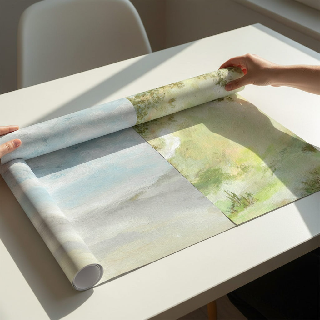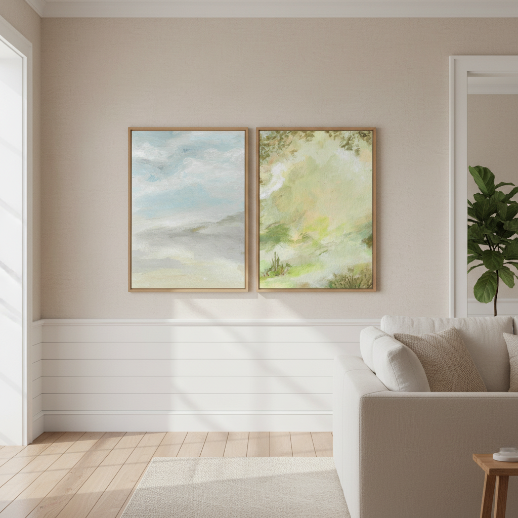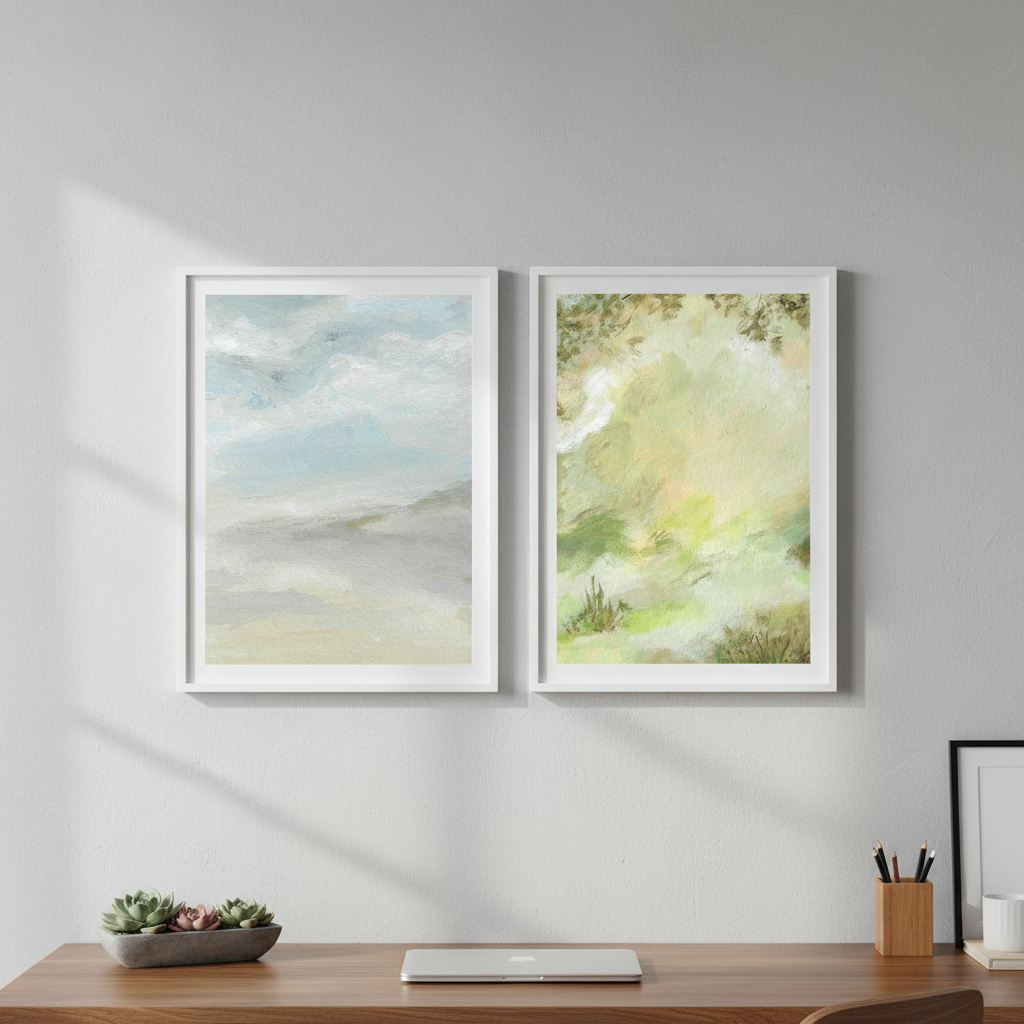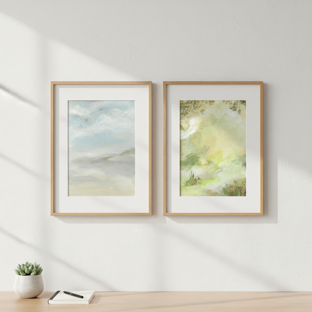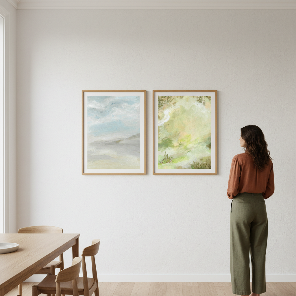 A Starking Duo by Josephine Wianto presents a compelling two-piece collection that merges contemporary aesthetics with sophisticated colour palettes. The first artwork showcases delicate watercolour techniques in soft green and beige tones, creating an ethereal, contemplative mood. The second piece features a marble-inspired surface with grey, white, and blue hues, delivering a modern, textural element. Together, these works offer versatile styling options for curated interiors, whether displayed as a cohesive gallery wall or positioned separately to anchor different spaces. Ideal for those seeking refined, understated elegance with artistic depth.
