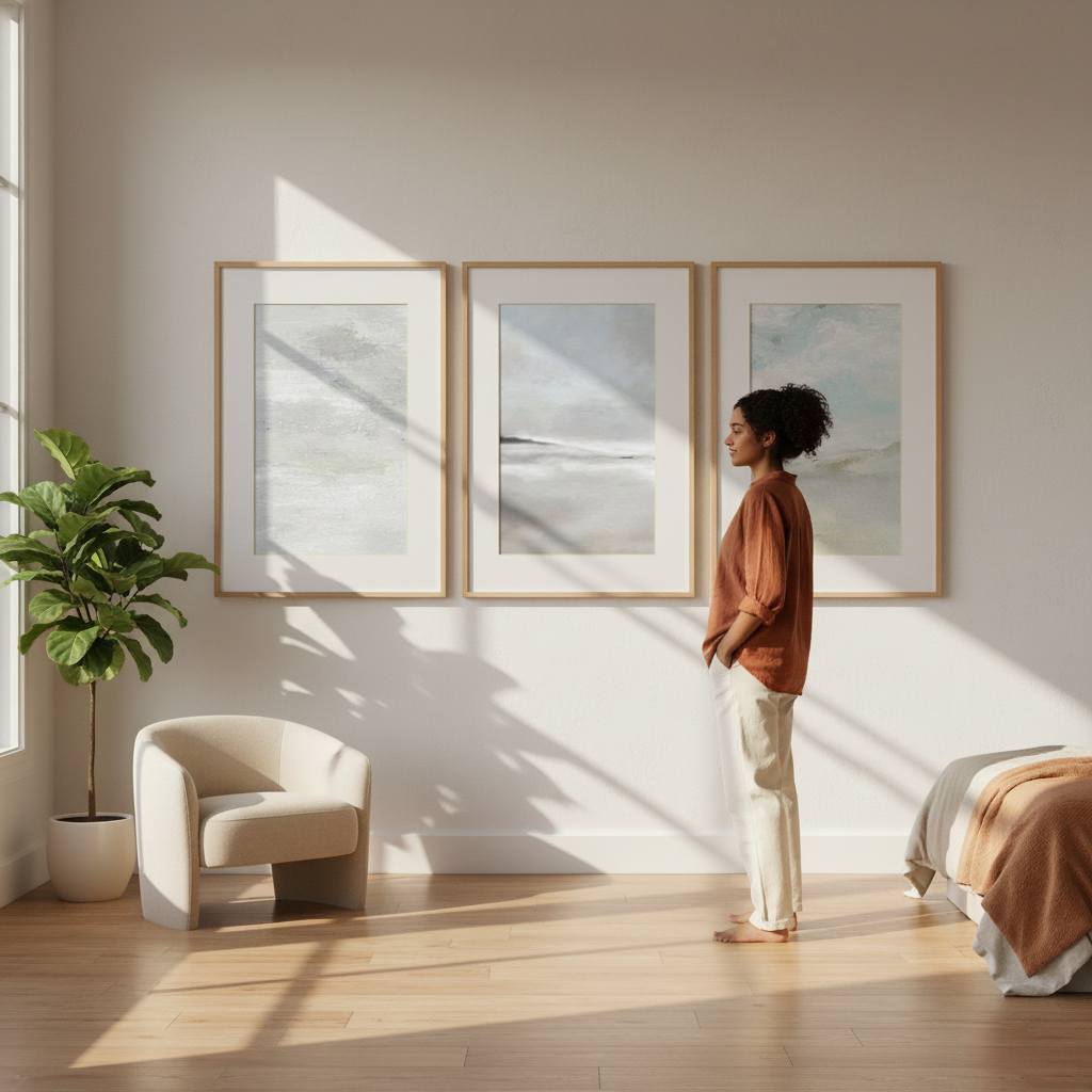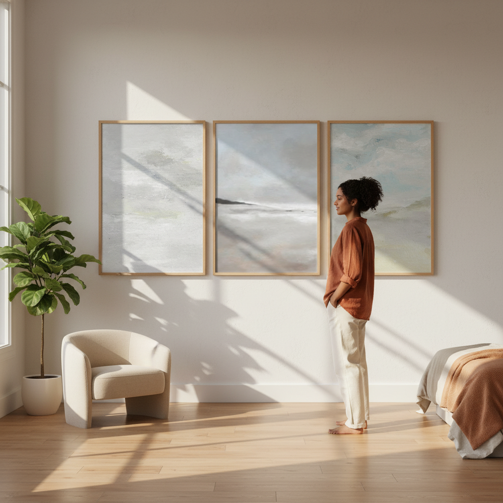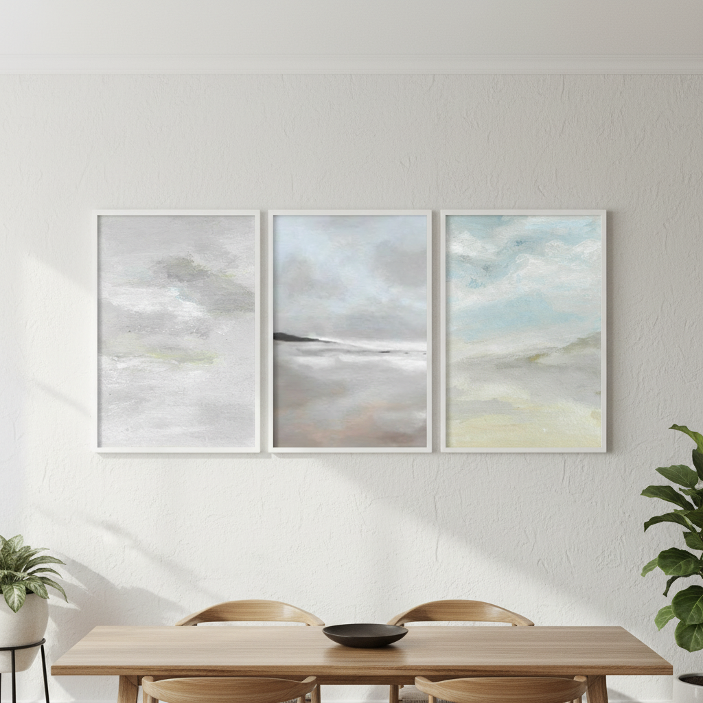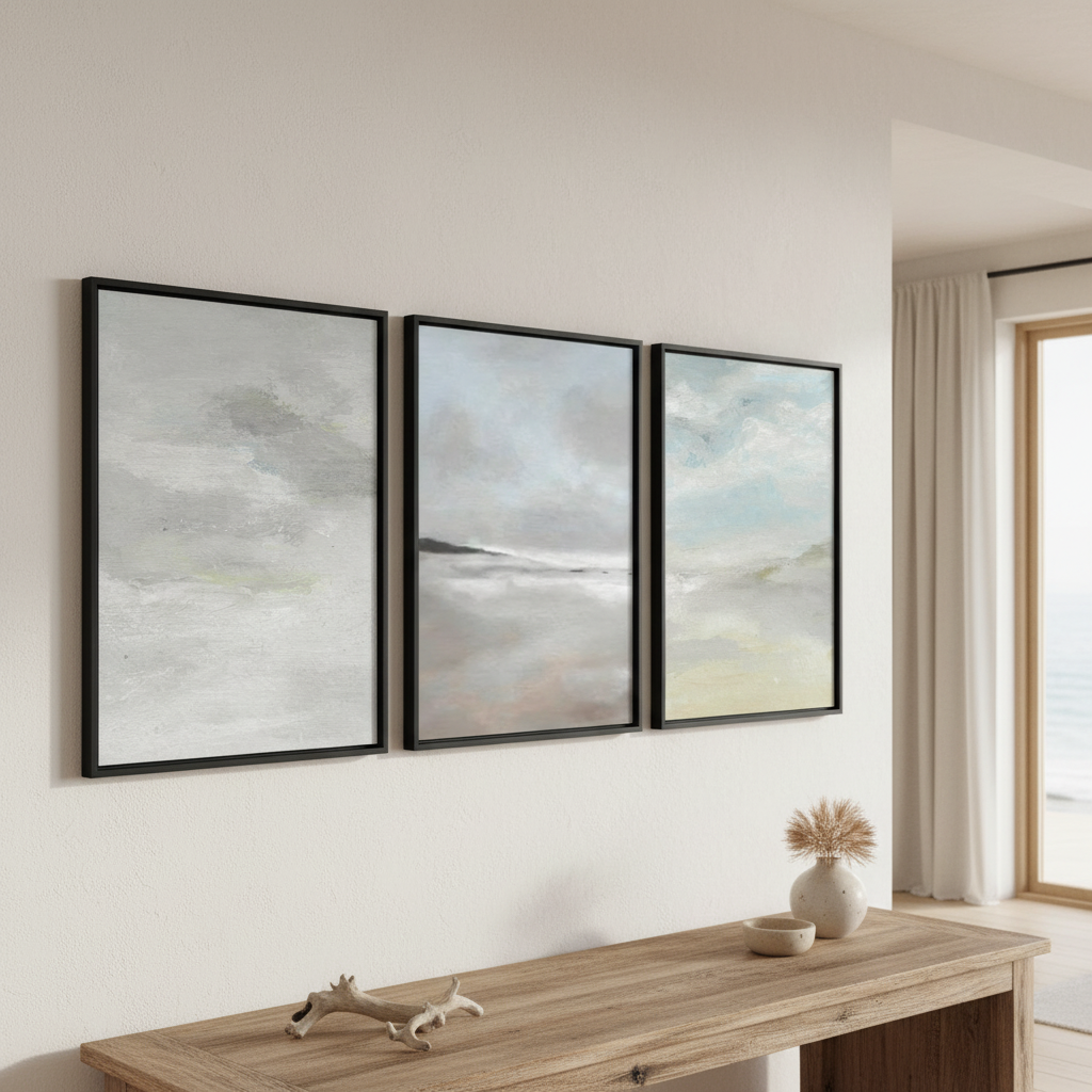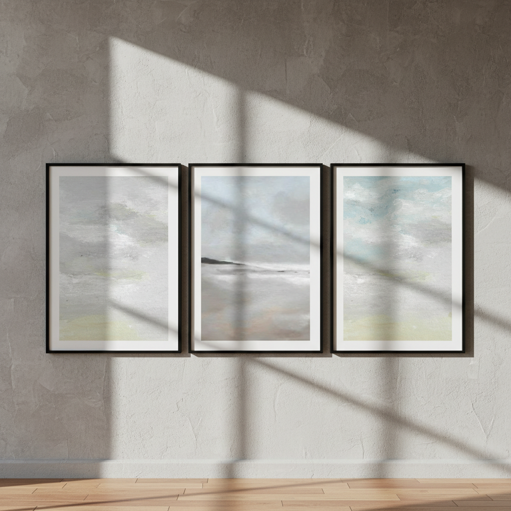 Elevate your space with this sophisticated trio of seascapes by Josephine Wianto. Each piece captures the interplay between water and sky through a refined palette of greys and blues. The collection features three distinct compositions: two studies in grey cloud formations and one luminous seascape where azure skies meet calm waters. Perfect for creating a cohesive gallery wall or anchoring a coastal-inspired interior, these artworks bring contemplative elegance and atmospheric depth to any room. Ideal for collectors seeking understated, nature-inspired wall art with professional artistic merit.