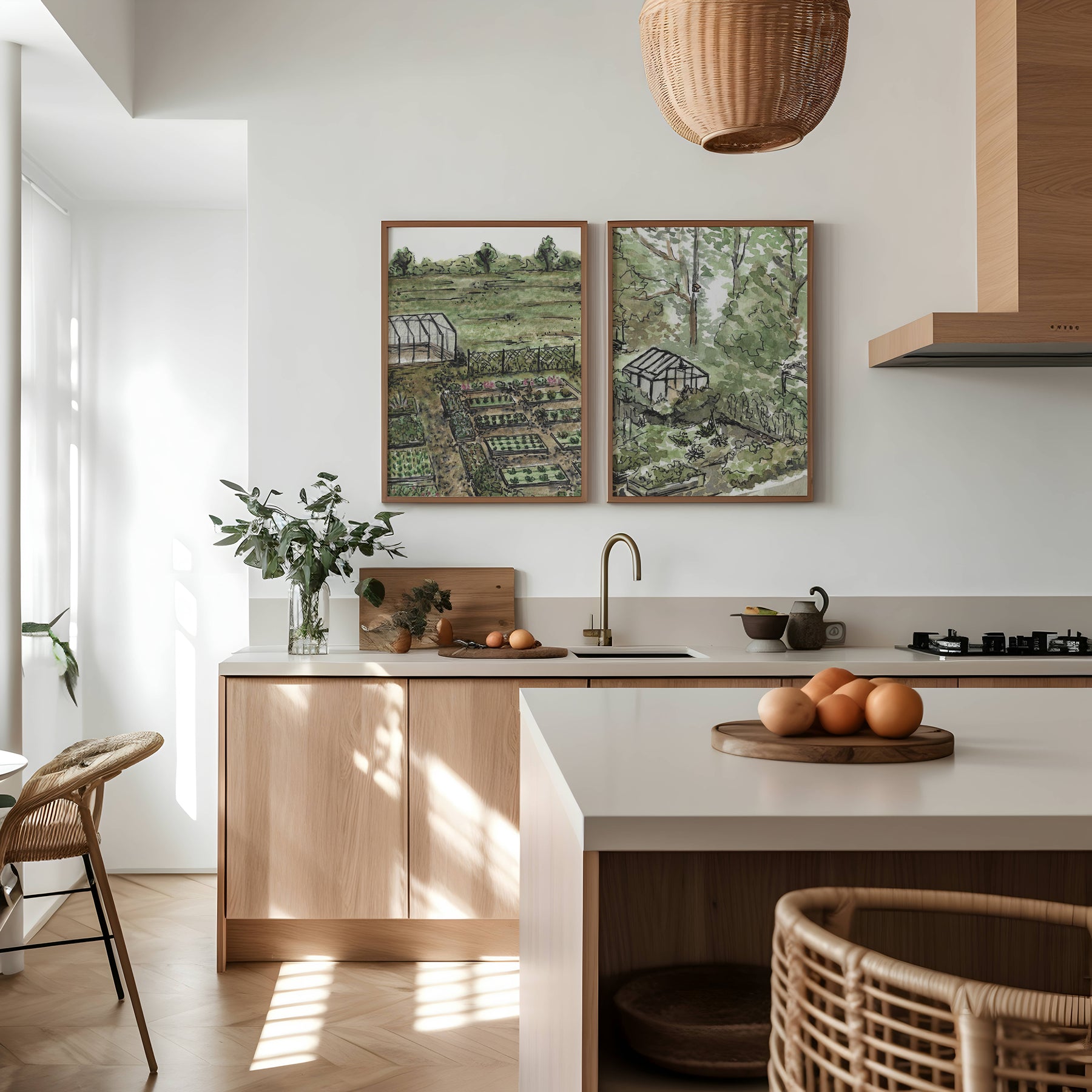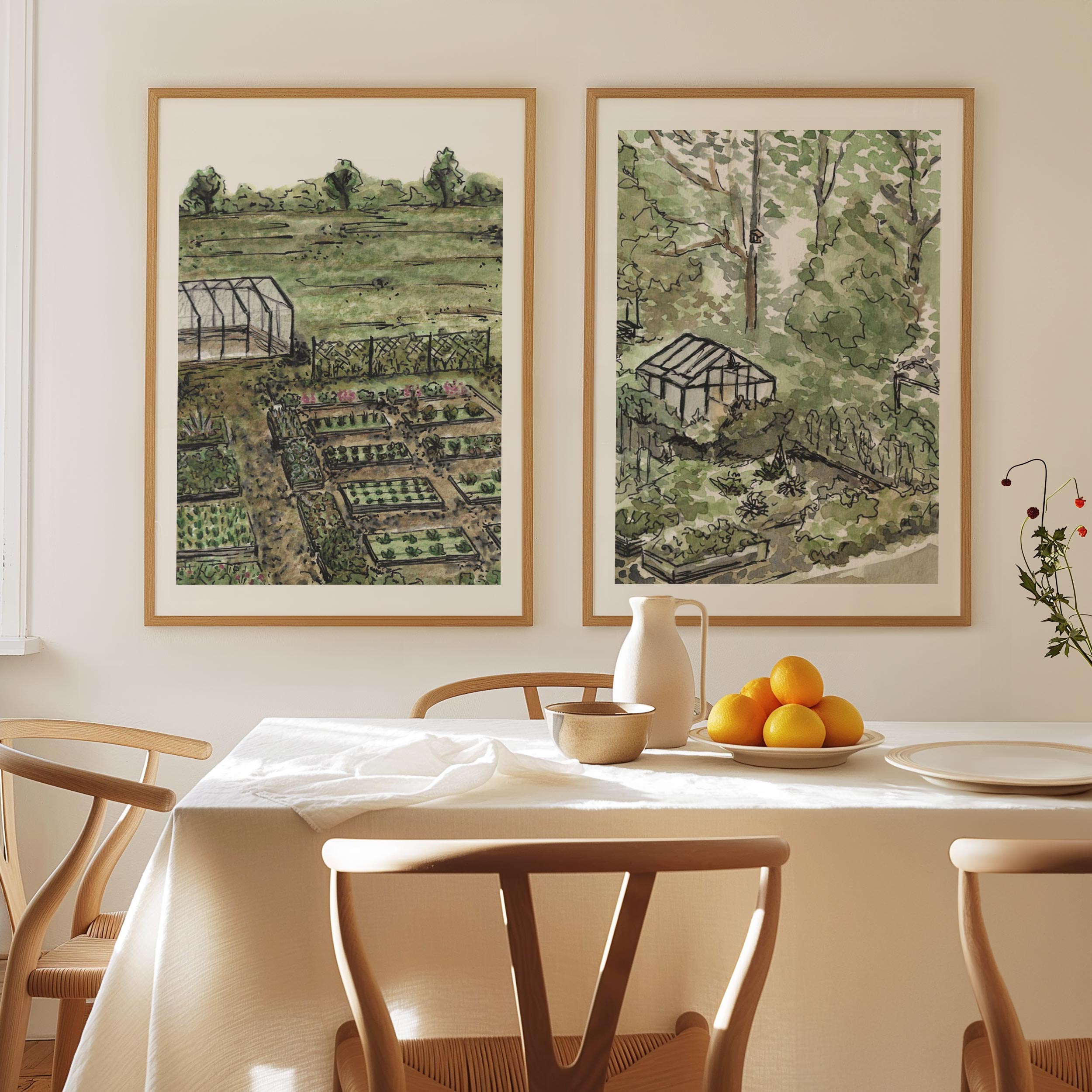 Transform your space with this curated set of two botanical illustrations by Josephine Wianto. The first features a lush greenhouse nestled within a verdant garden, surrounded by flourishing trees and diverse plantings. The second showcases a meticulously planned garden layout with organized plant rows and a functional greenhouse structure. Together, these pieces celebrate the art of cultivation and garden design, bringing natural beauty and horticultural inspiration to any room. Perfect for plant enthusiasts, gardeners, or those seeking to infuse their décor with botanical elegance and thoughtful landscape imagery.