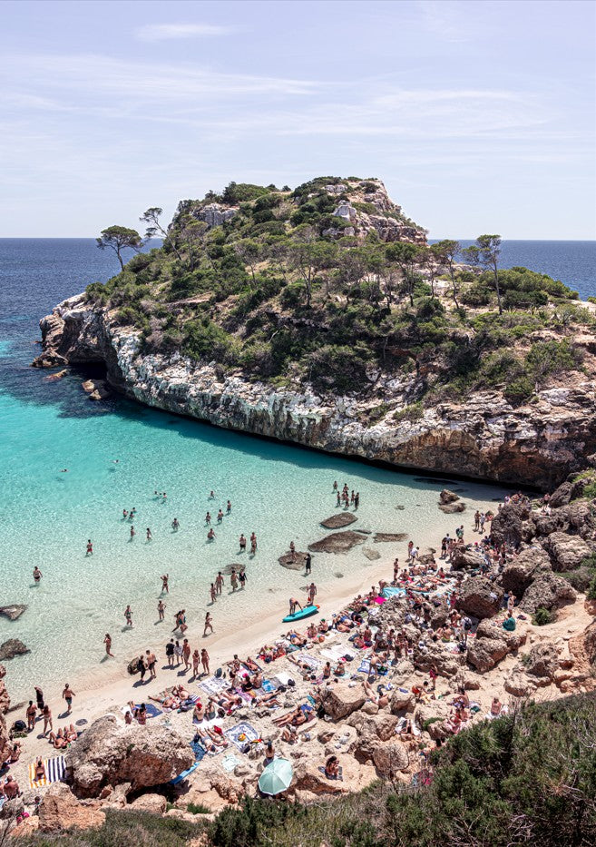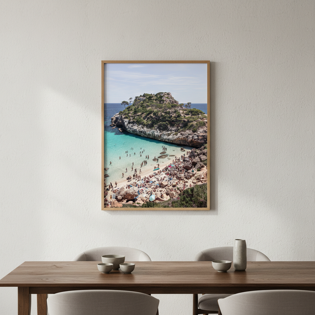 Caló des Moro II captures a quintessential Mediterranean moment where azure waters meet dramatic limestone cliffs. This striking composition showcases beachgoers immersed in leisure, their figures animated against crystalline seas while verdant vegetation frames the rugged coastal landscape. Josh Wilson's expert eye transforms this idyllic scene into a compelling visual narrative—the interplay of natural rock formations, lush greenery, and human presence creates compelling depth and dimension. Perfect for those seeking to evoke the serene sophistication of coastal living, this artwork brings the essence of Mediterranean escape directly into your space.