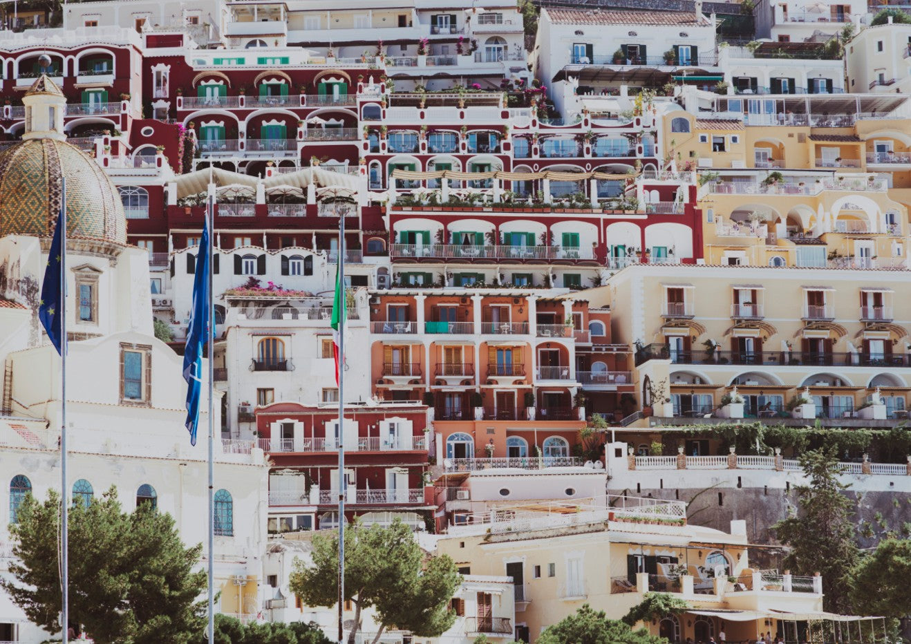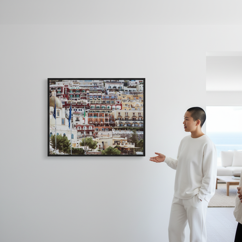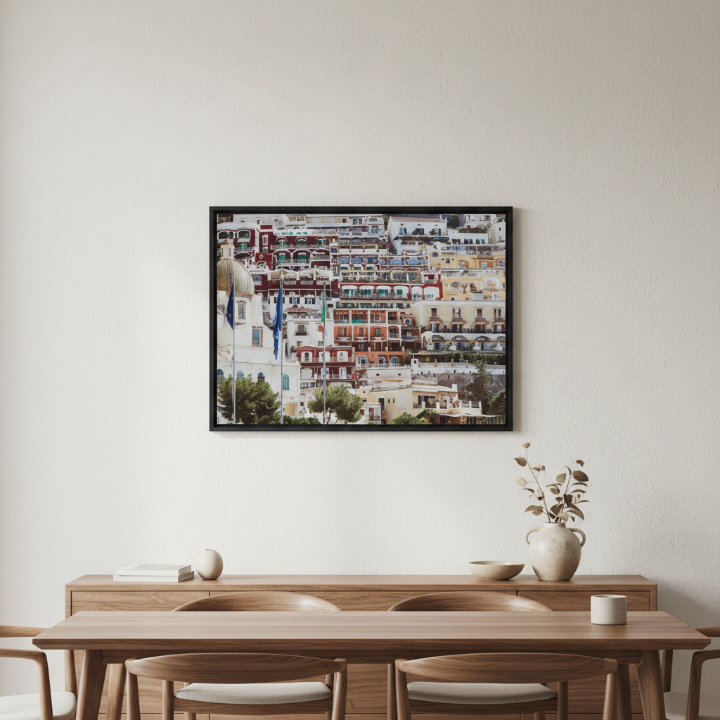 Positano Hills III captures the vibrant essence of Italy's Amalfi Coast with its striking composition of stacked Mediterranean architecture. Artist Josh Wilson renders sun-drenched buildings in warm ochres, terracottas, and creams, punctuated by fluttering flags that add movement and cultural authenticity. This piece evokes the romantic charm of coastal Italian villages, bringing warmth and European sophistication to any interior. Perfect for those seeking to infuse their space with travel-inspired elegance and artistic depth.
