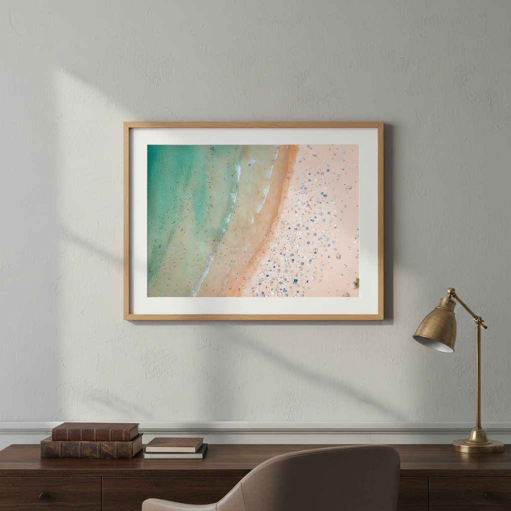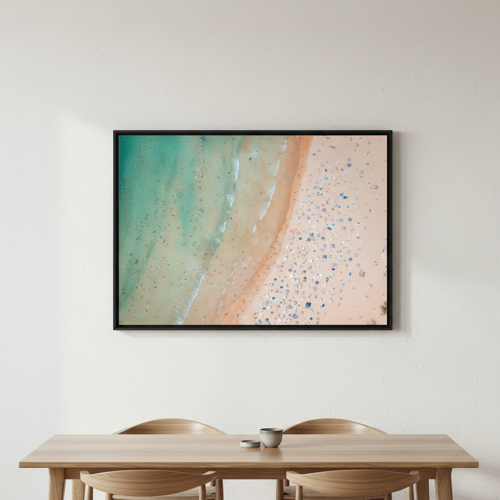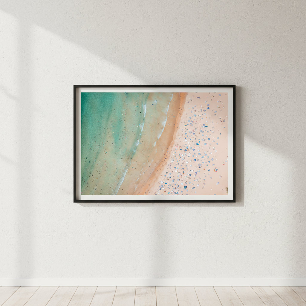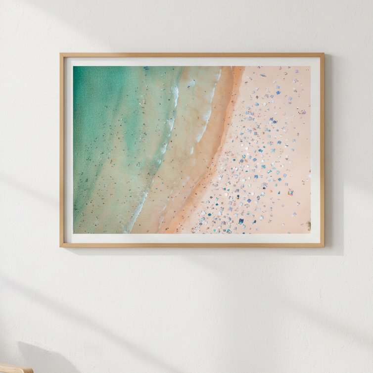 Capture the essence of coastal beauty with this striking aerial landscape by Josh Wilson. This photograph showcases the pristine meeting point where golden sand transitions seamlessly into crystalline water, revealing the natural textures and colour gradations that define Sydney's summer coastline. The close-up perspective emphasises fine details—ripples in the sand, water patterns, and the interplay of light across the shore—creating a mesmerising composition that brings the beach experience directly into your space. Perfect for those seeking to infuse their walls with the tranquility and visual richness of Australia's iconic coastal landscapes.