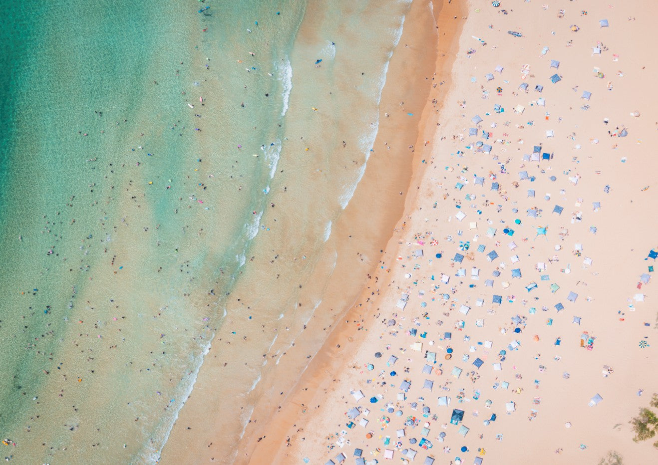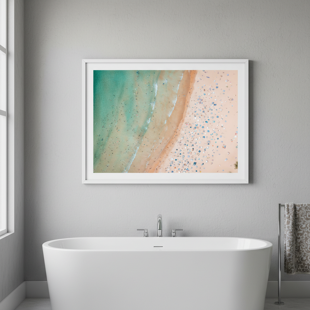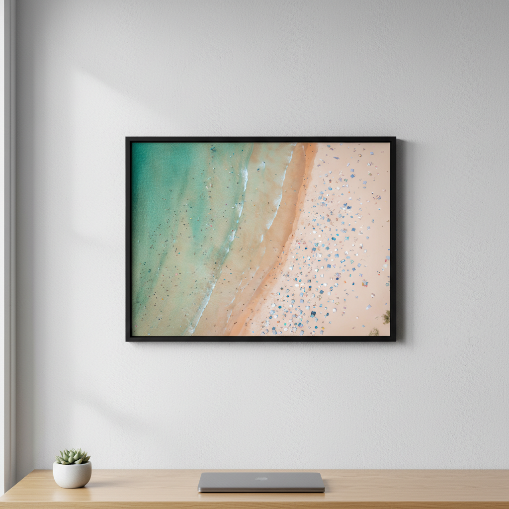 Capture the essence of coastal beauty with this striking aerial landscape by Josh Wilson. This photograph showcases the pristine meeting point where golden sand transitions seamlessly into crystalline water, revealing the natural textures and colour gradations that define Sydney's summer coastline. The close-up perspective emphasises fine details—ripples in the sand, water patterns, and the interplay of light across the shore—creating a mesmerising composition that brings the beach experience directly into your space. Perfect for those seeking to infuse their walls with the tranquility and visual richness of Australia's iconic coastal landscapes.