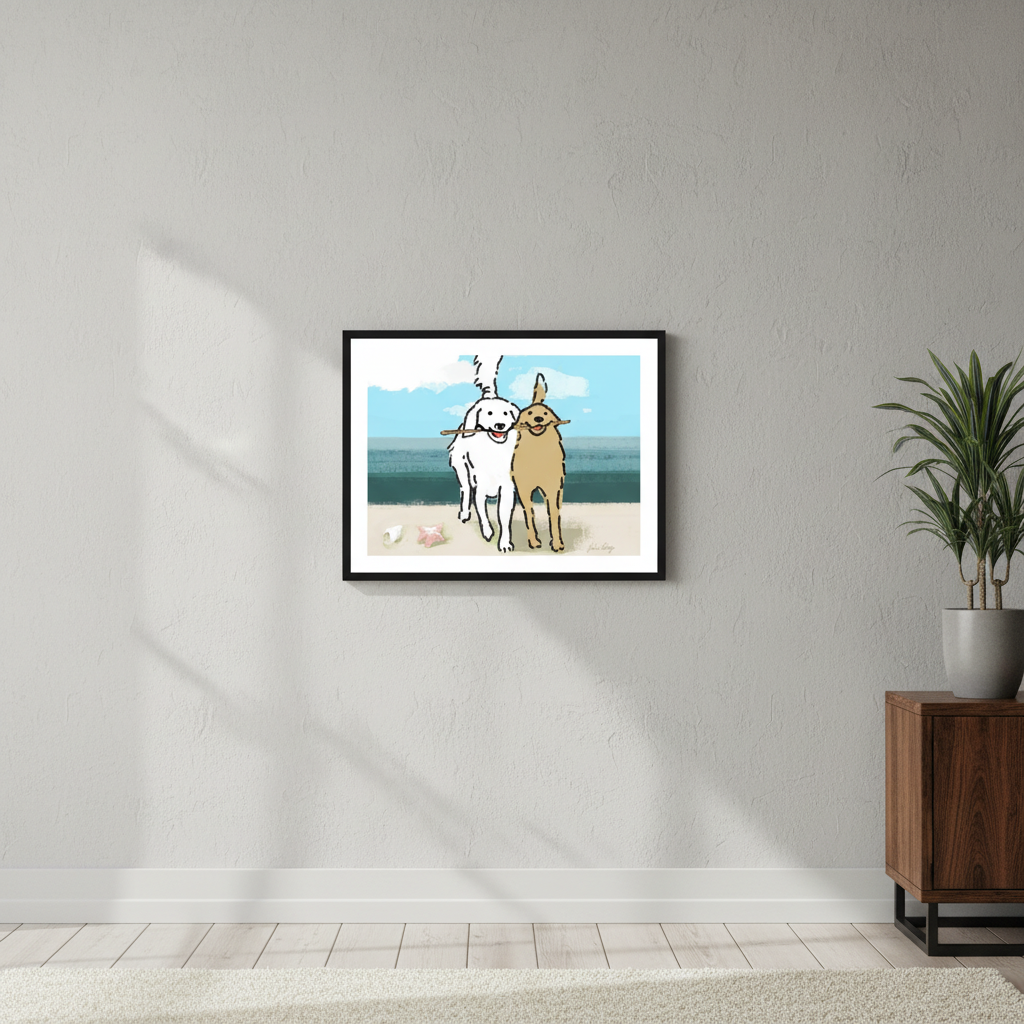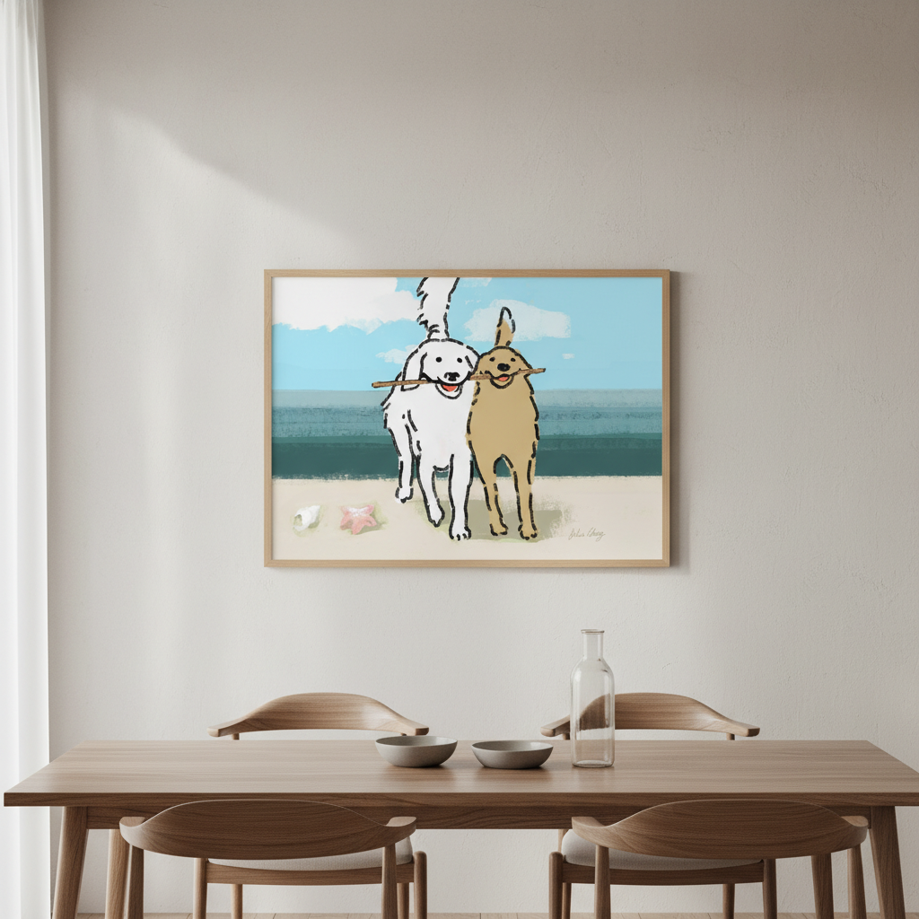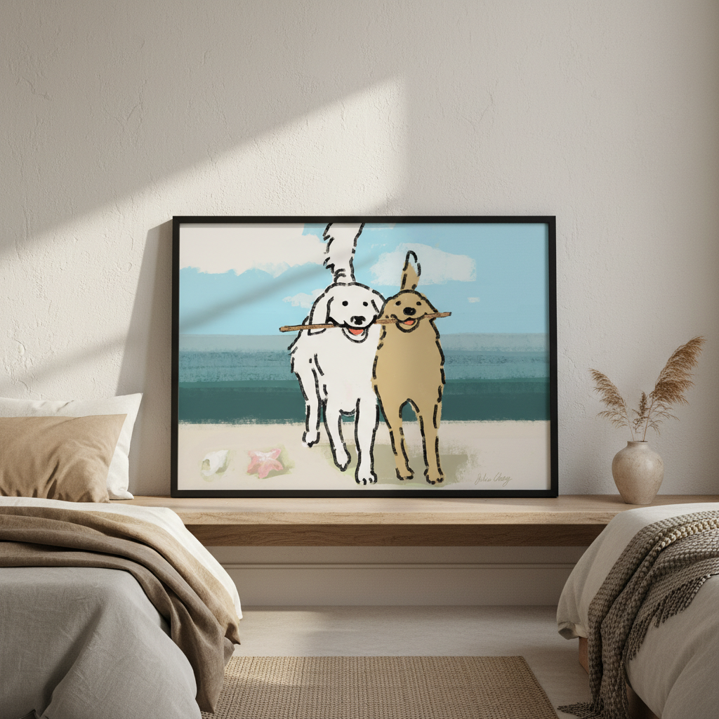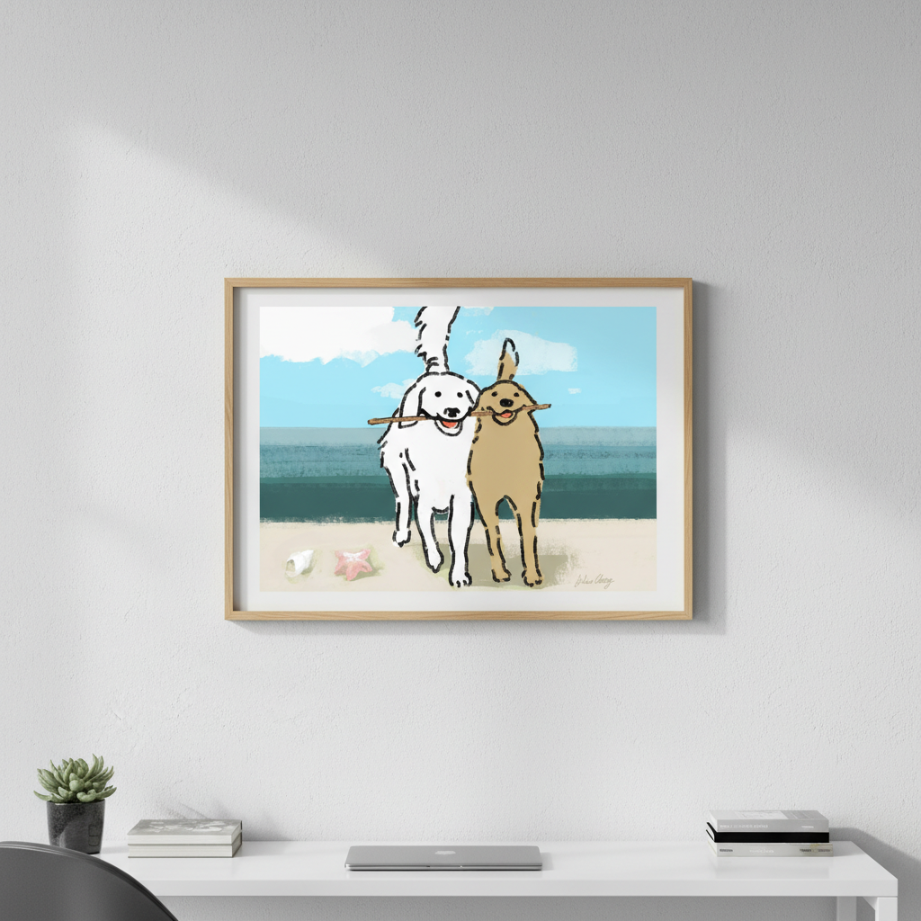 Bring a splash of seaside fun to your space with this charming artwork featuring two cartoon dogs having the time of their lives on the beach. Watch as they playfully tug at a stick, their joyful energy practically leaping off the canvas. Perfect for dog lovers and beach enthusiasts alike, this delightful piece by Julia Cheney captures that carefree summer spirit and adds a cheerful, lighthearted vibe to any room. A feel-good artwork that'll make you smile every time you pass by.