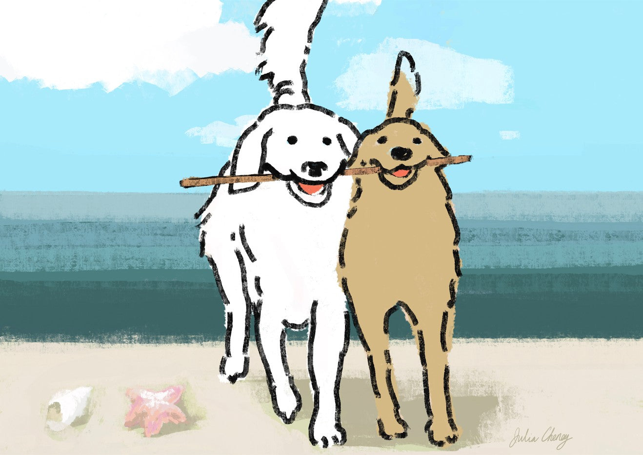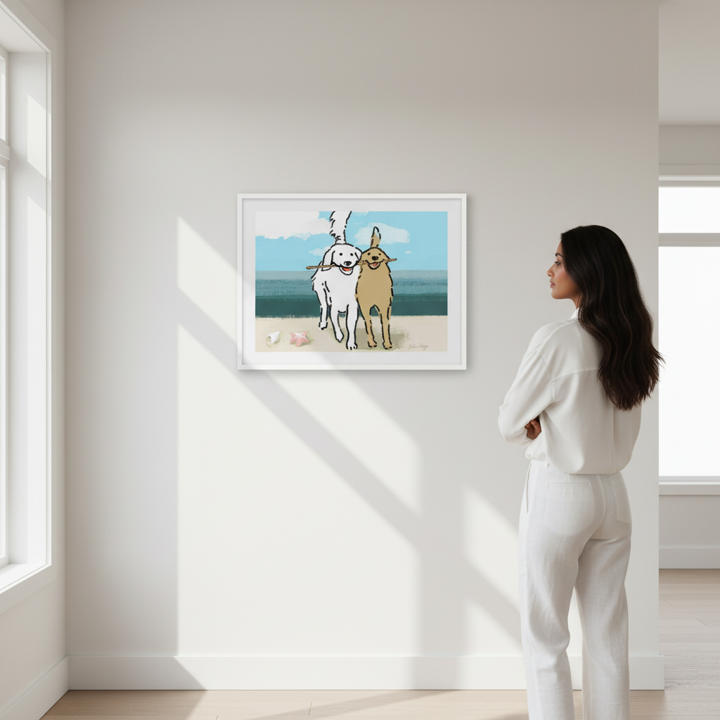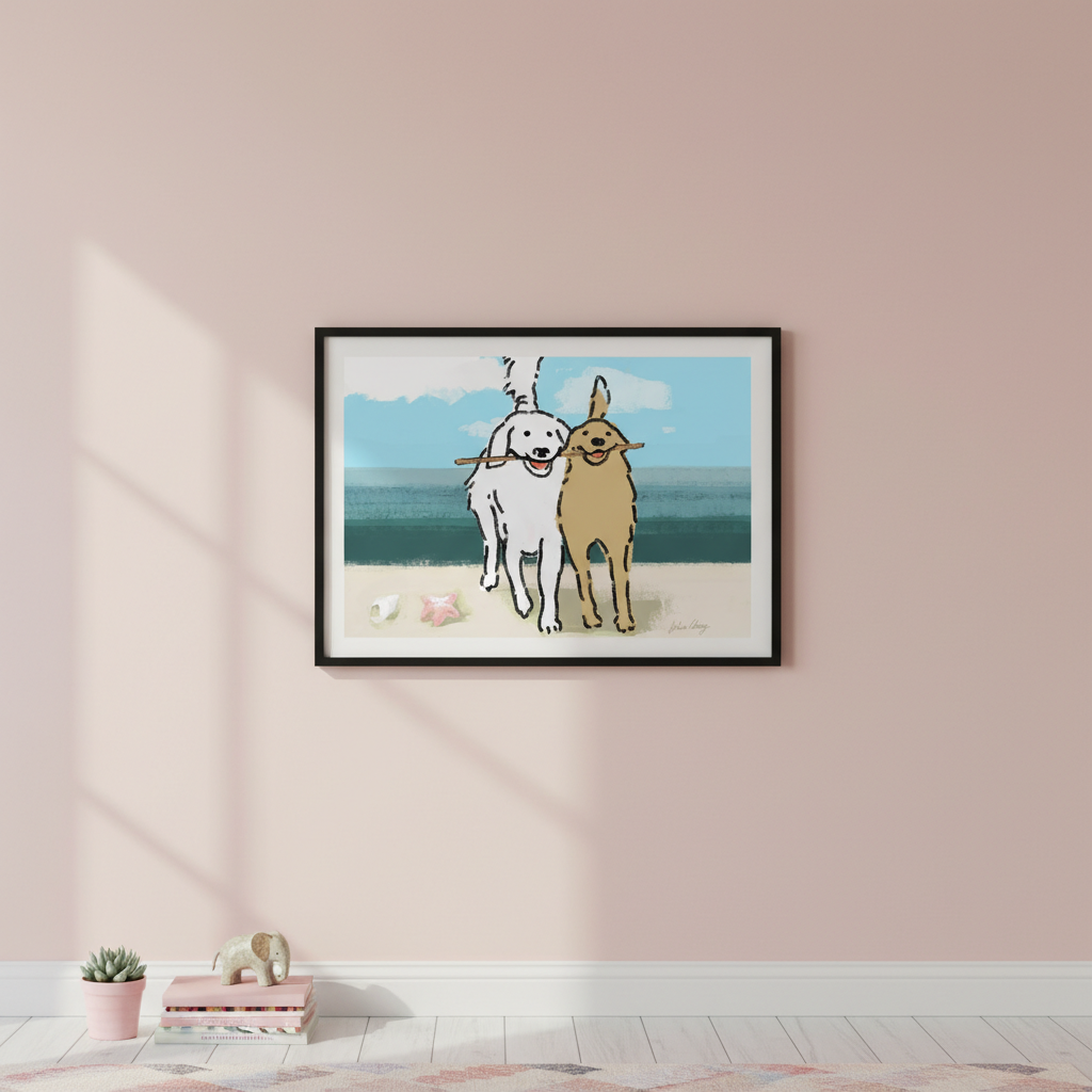 Bring a splash of seaside fun to your space with this charming artwork featuring two cartoon dogs having the time of their lives on the beach. Watch as they playfully tug at a stick, their joyful energy practically leaping off the canvas. Perfect for dog lovers and beach enthusiasts alike, this delightful piece by Julia Cheney captures that carefree summer spirit and adds a cheerful, lighthearted vibe to any room. A feel-good artwork that'll make you smile every time you pass by.