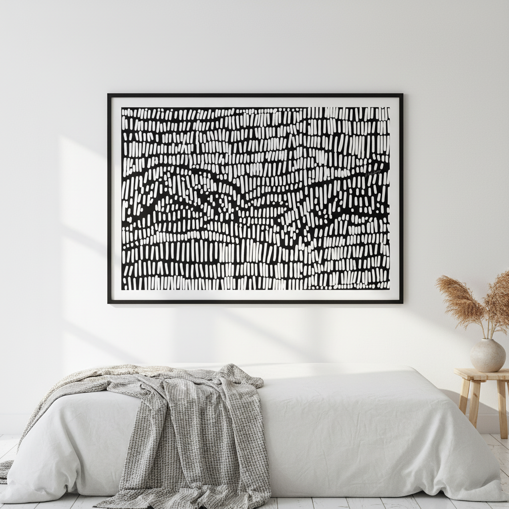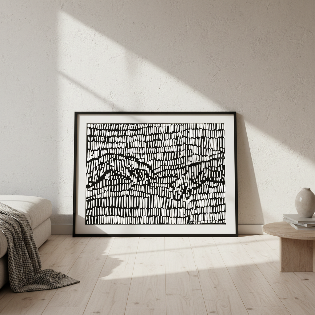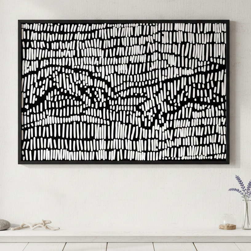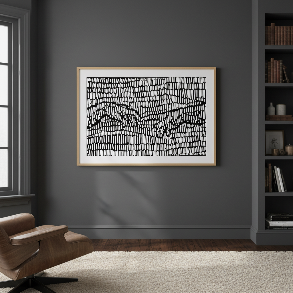 Connected by Julia Cheney captures the essence of contemporary abstraction through a striking black and white composition. This piece features an intricate geometric pattern that draws the eye across interconnected lines and shapes, creating visual movement and depth. The monochromatic palette ensures versatility, complementing both modern and eclectic interiors while making a sophisticated design statement. Perfect for those seeking artwork that balances artistic complexity with timeless elegance, this piece transforms any space into a gallery-worthy environment.