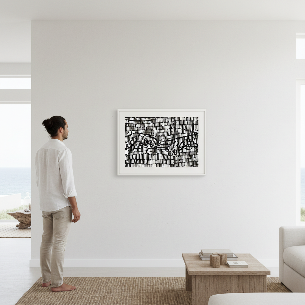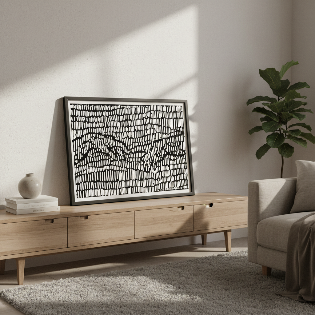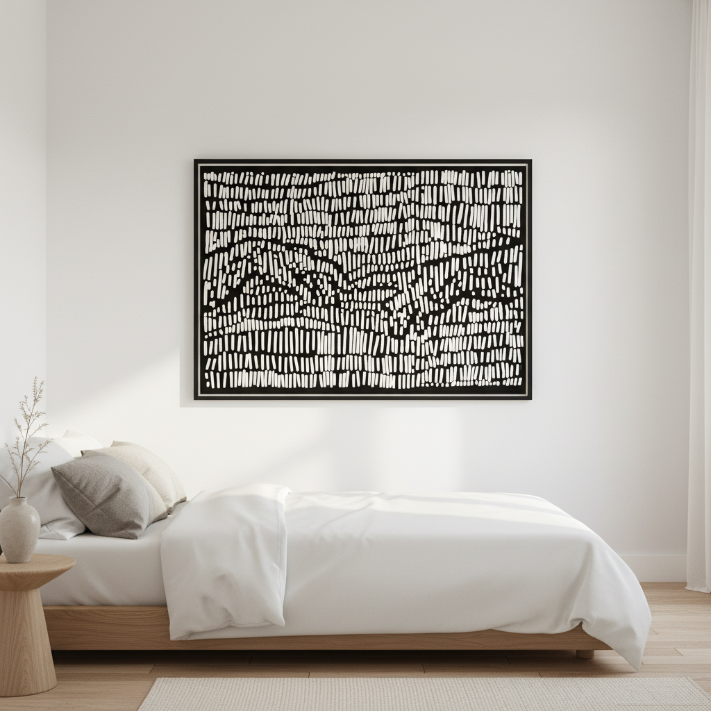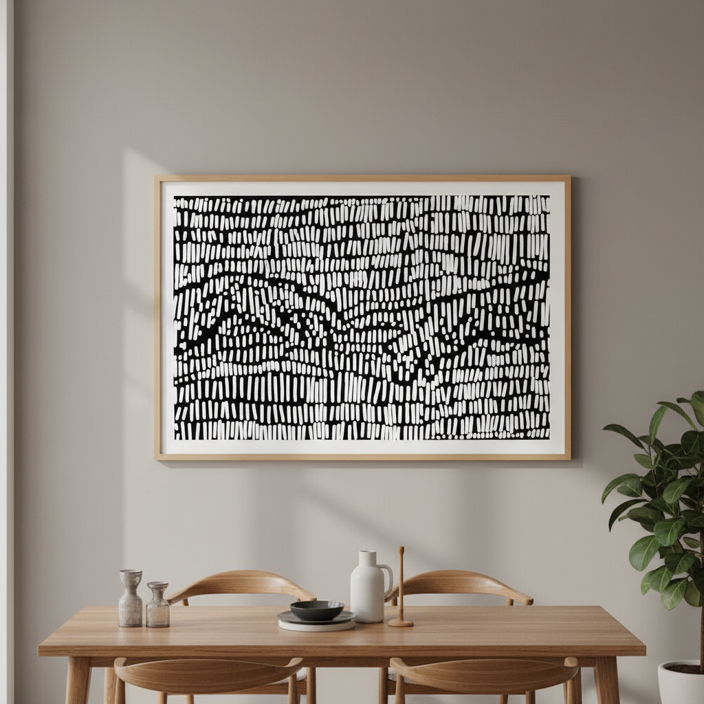 Connected by Julia Cheney captures the essence of contemporary abstraction through a striking black and white composition. This piece features an intricate geometric pattern that draws the eye across interconnected lines and shapes, creating visual movement and depth. The monochromatic palette ensures versatility, complementing both modern and eclectic interiors while making a sophisticated design statement. Perfect for those seeking artwork that balances artistic complexity with timeless elegance, this piece transforms any space into a gallery-worthy environment.