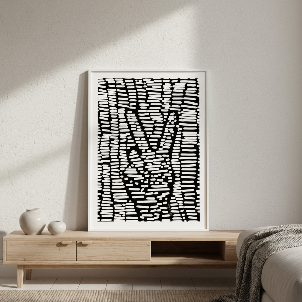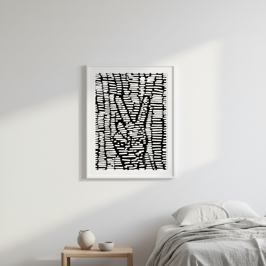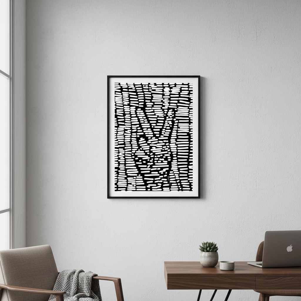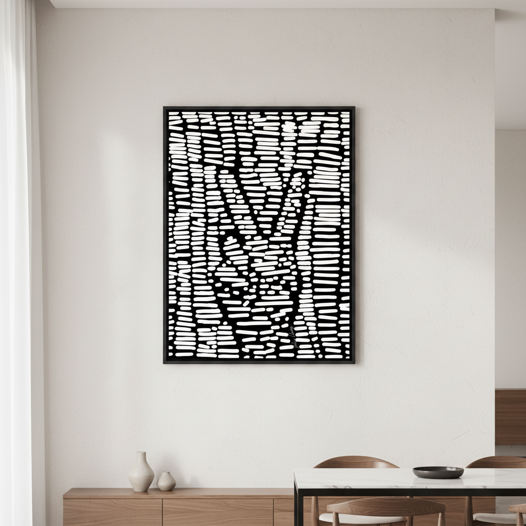Peace by Julia Cheney presents a sophisticated composition of vertical lines rendered in striking black and white against a richly textured surface. The geometric precision of the linear pattern creates visual rhythm and movement, while the underlying texture adds depth and tactile interest. This contemporary design balances minimalist aesthetics with dimensional complexity, making it an ideal choice for modern interiors seeking understated elegance. The monochromatic palette ensures versatility across diverse décor schemes, complementing both neutral and accent-colour environments with refined restraint.