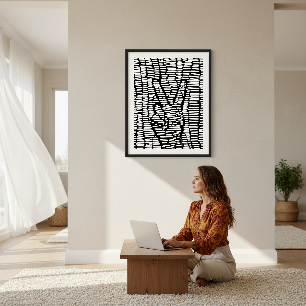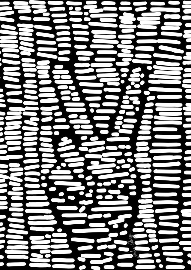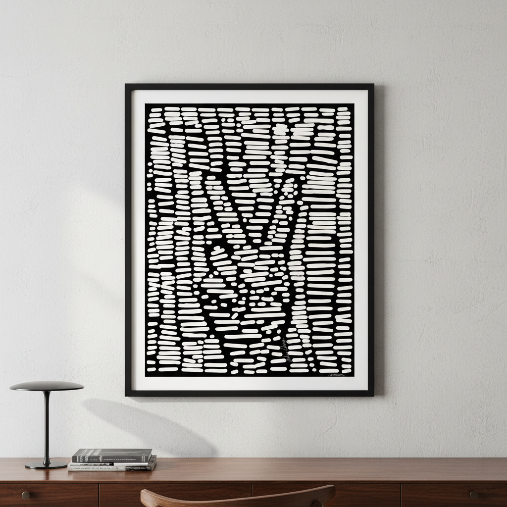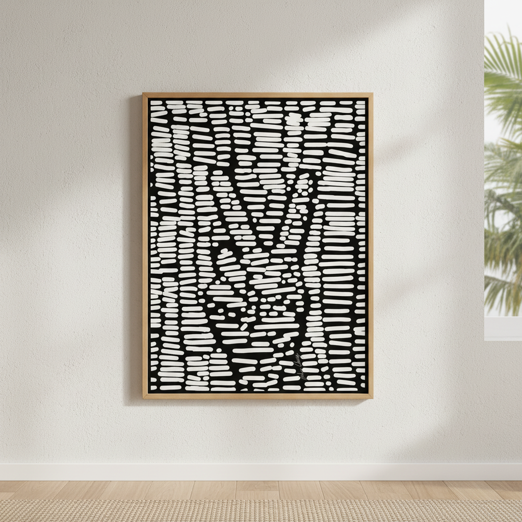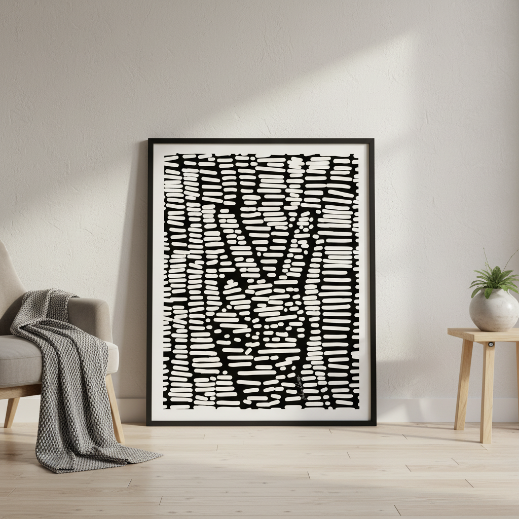 Peace by Julia Cheney presents a sophisticated composition of vertical lines rendered in striking black and white against a richly textured surface. The geometric precision of the linear pattern creates visual rhythm and movement, while the underlying texture adds depth and tactile interest. This contemporary design balances minimalist aesthetics with dimensional complexity, making it an ideal choice for modern interiors seeking understated elegance. The monochromatic palette ensures versatility across diverse décor schemes, complementing both neutral and accent-colour environments with refined restraint.
