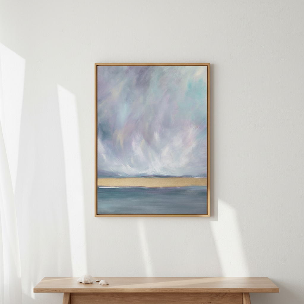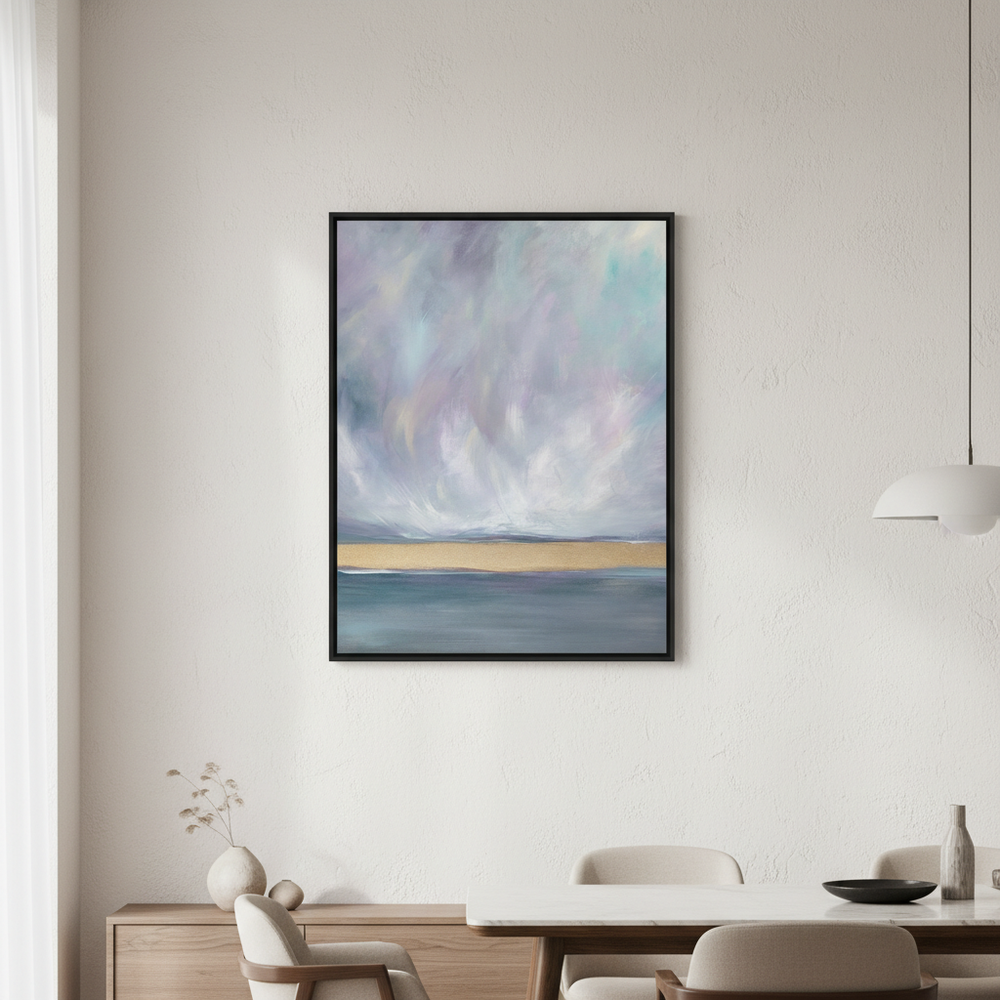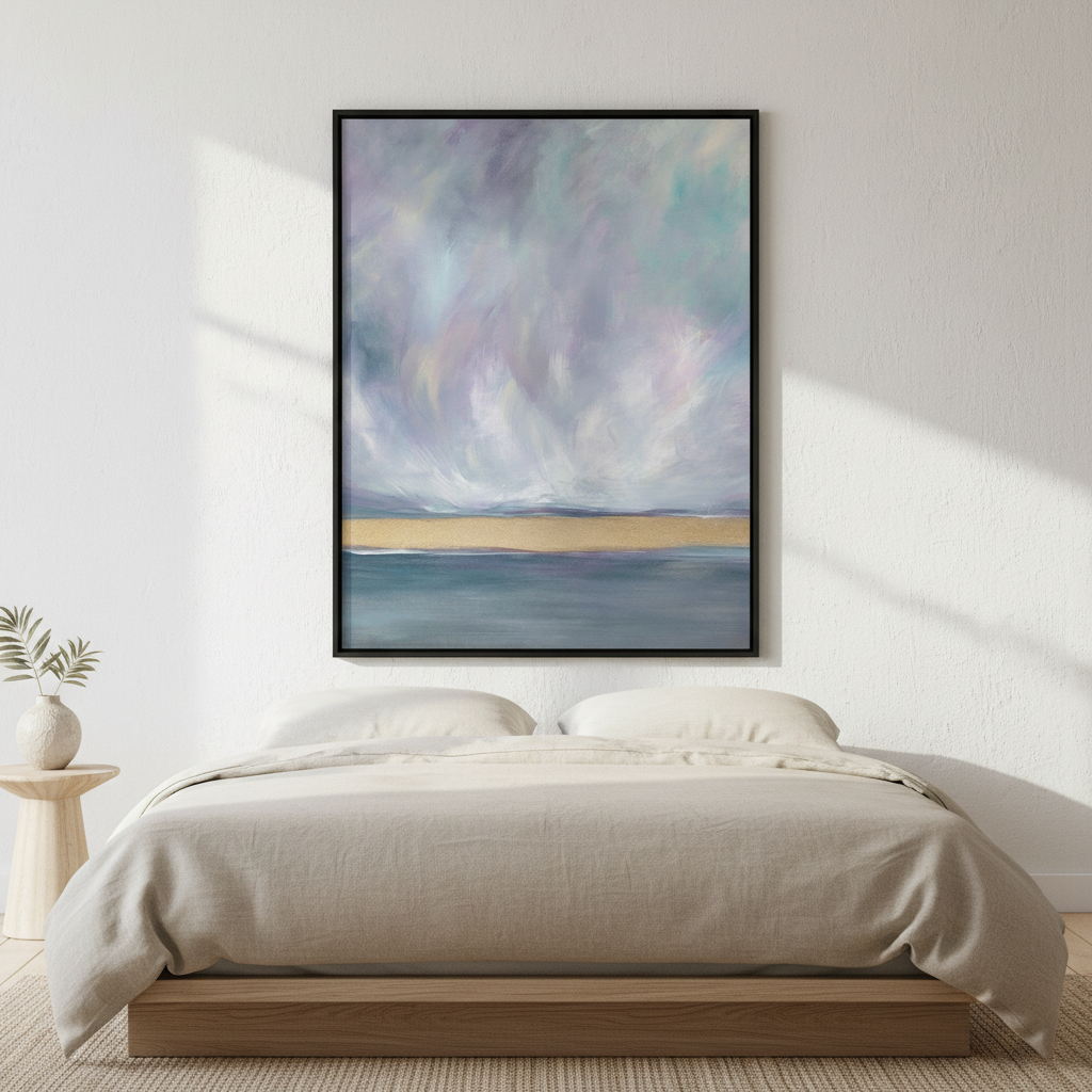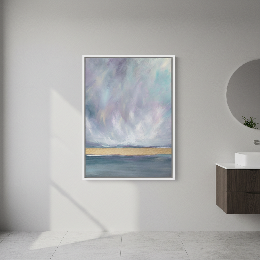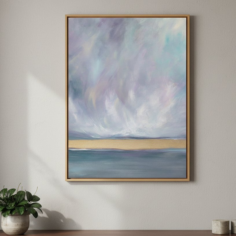 Velvet Blush captures the essence of contemporary abstraction through dynamic, swirling color compositions that draw the eye across the canvas. A distinctive horizontal band anchors the composition at the base, creating visual balance and depth. This piece exemplifies modern artistic technique, where layered hues and fluid forms converge to create movement and sophistication. Julia Contacessi's masterful use of color creates an engaging focal point suitable for contemporary interiors seeking statement artwork with refined aesthetic appeal.