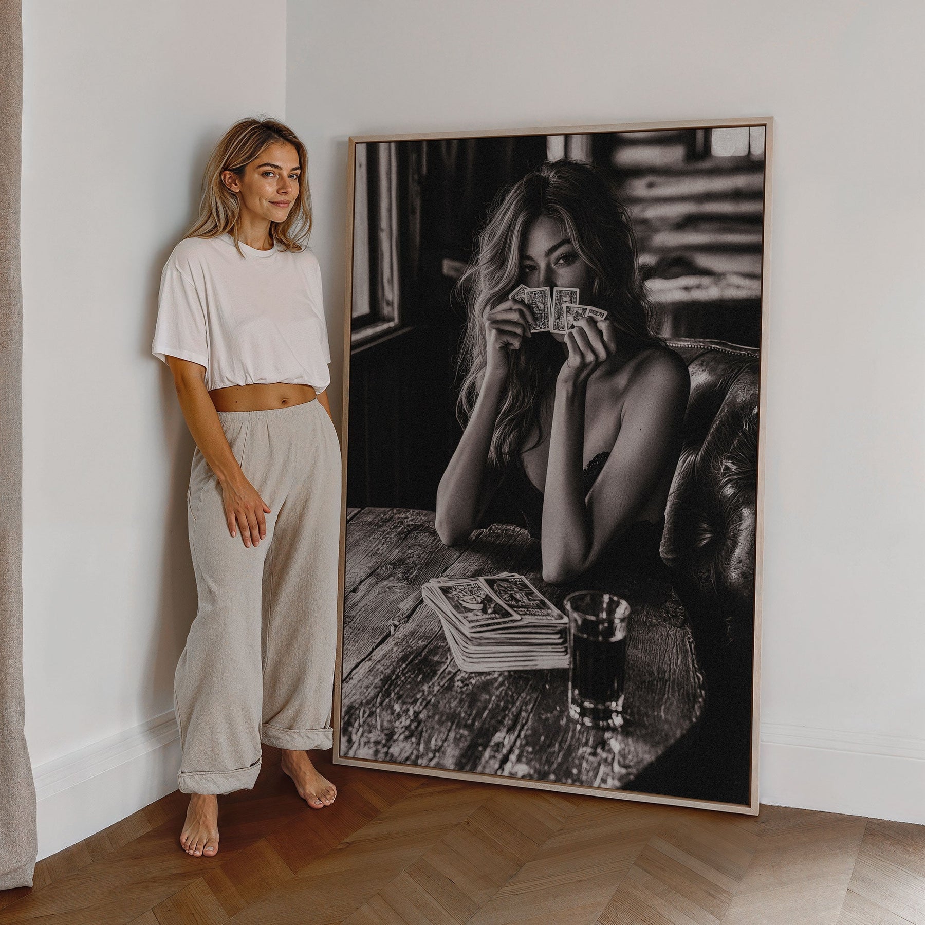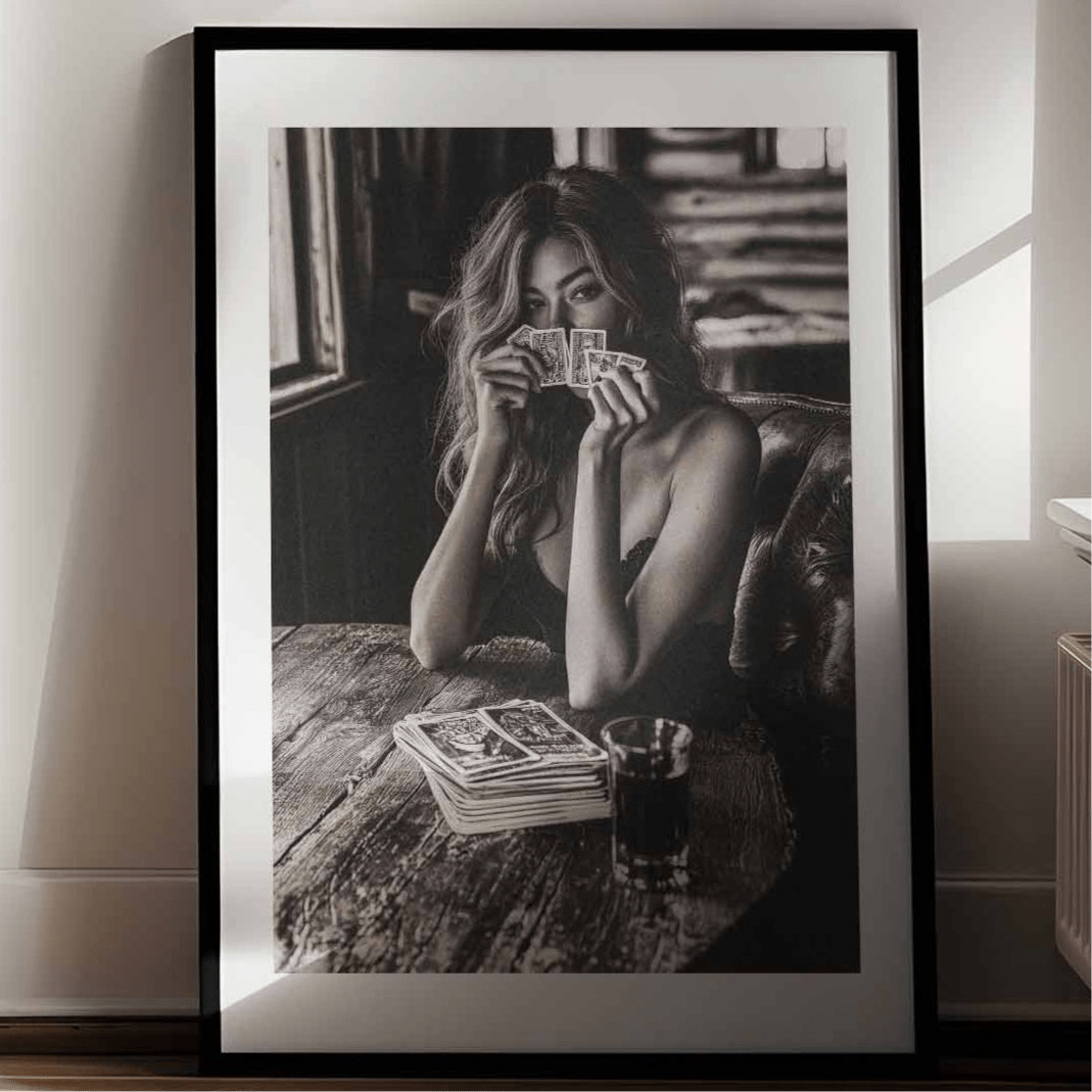 Ace of Her Sleeve by Julian Van Bausch captures a woman’s confident allure as she plays poker with sophistication and grace. This exclusive photographic print brings daring elegance to your space, making a bold statement on any wall. Perfect for those who appreciate art that combines mystery and style.