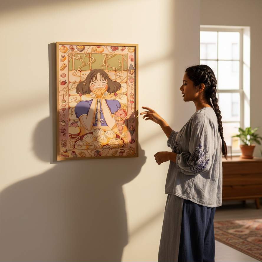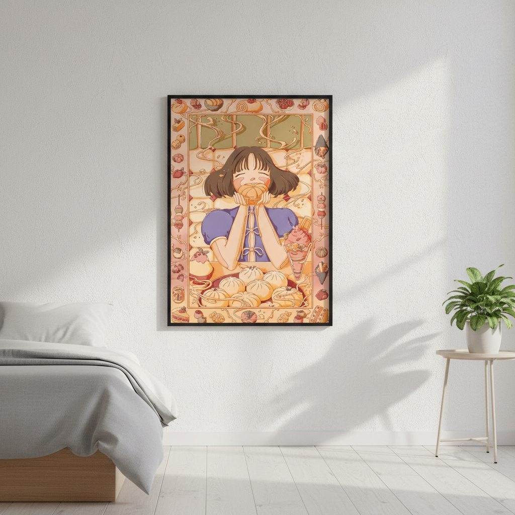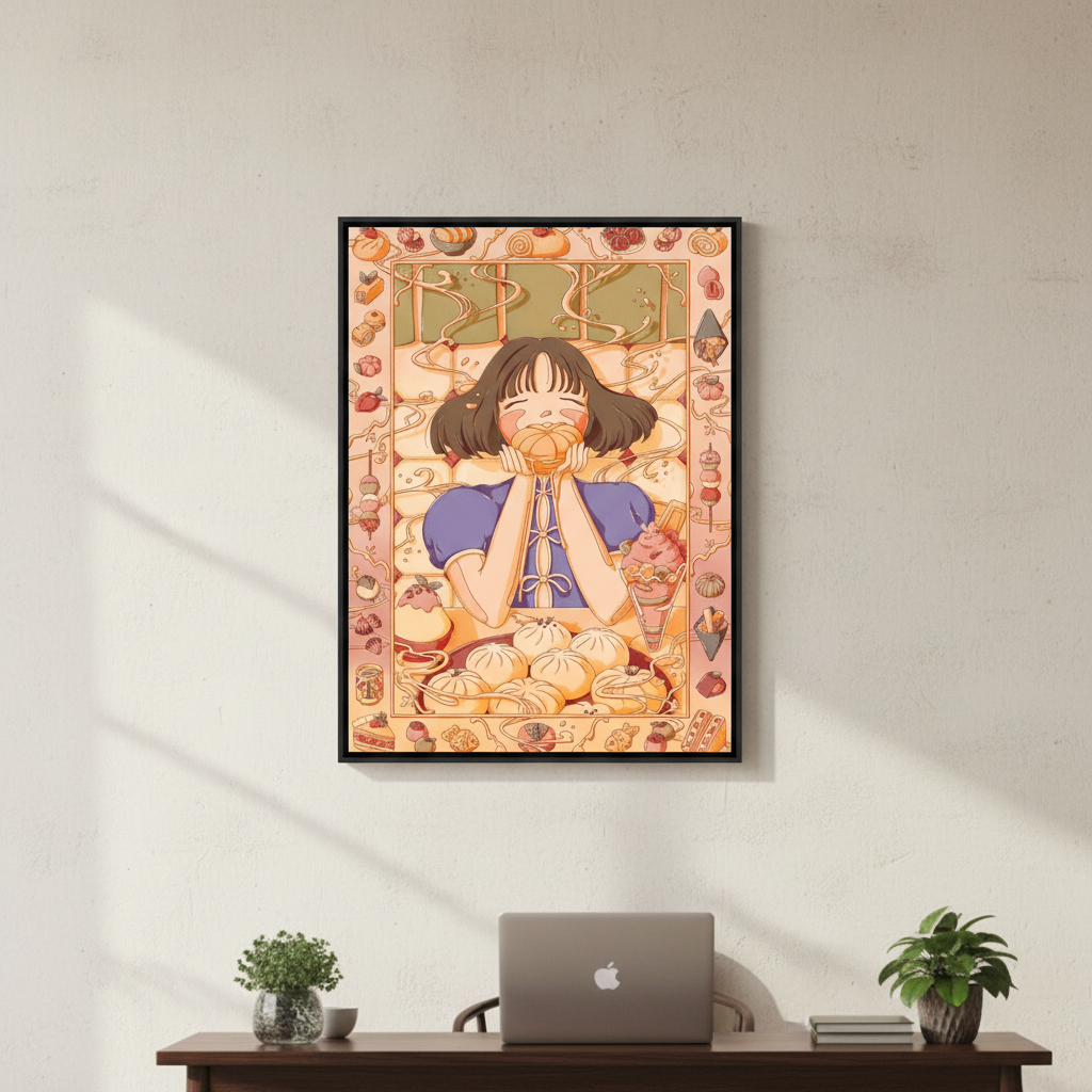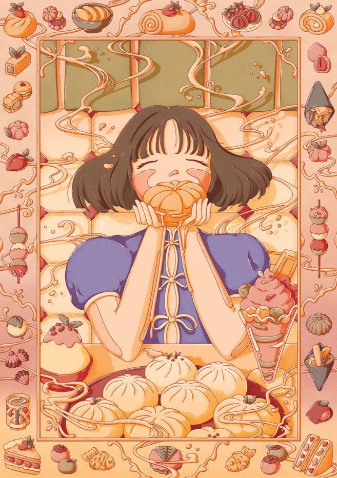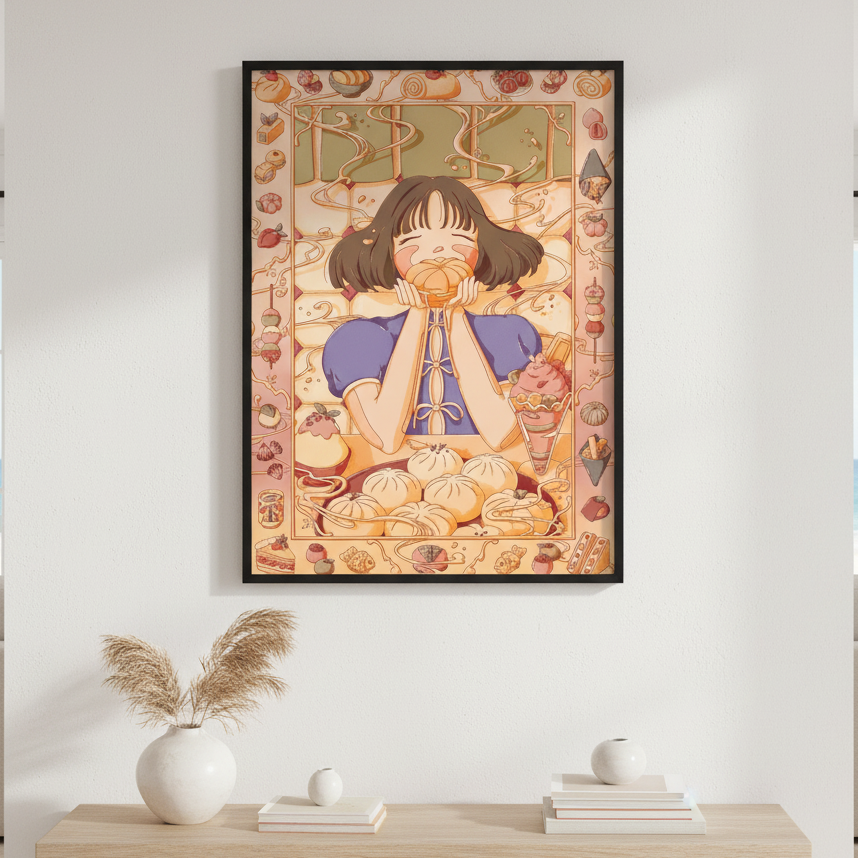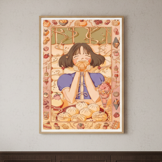 Custard Dreams by Lauren Ly captures the essence of autumn through a charming illustration featuring a girl cradling a pumpkin, surrounded by seasonal foliage and harvest motifs. This artwork celebrates the warmth and nostalgia of fall, blending whimsical character design with rich, autumnal aesthetics. Perfect for adding a touch of seasonal charm to any space, this piece brings together contemporary illustration techniques with timeless autumn appeal. Ideal for those seeking to infuse their walls with cosy, thematic artwork that resonates with the beauty of the season.