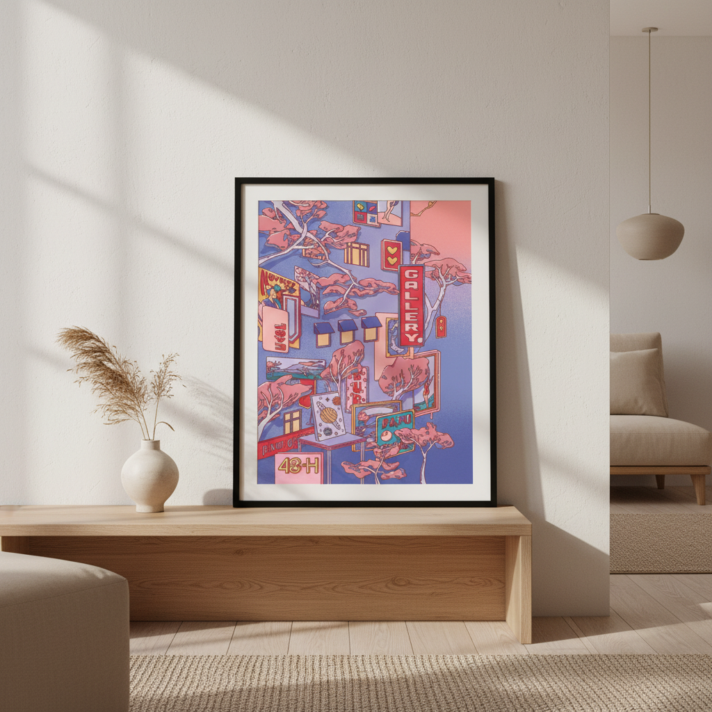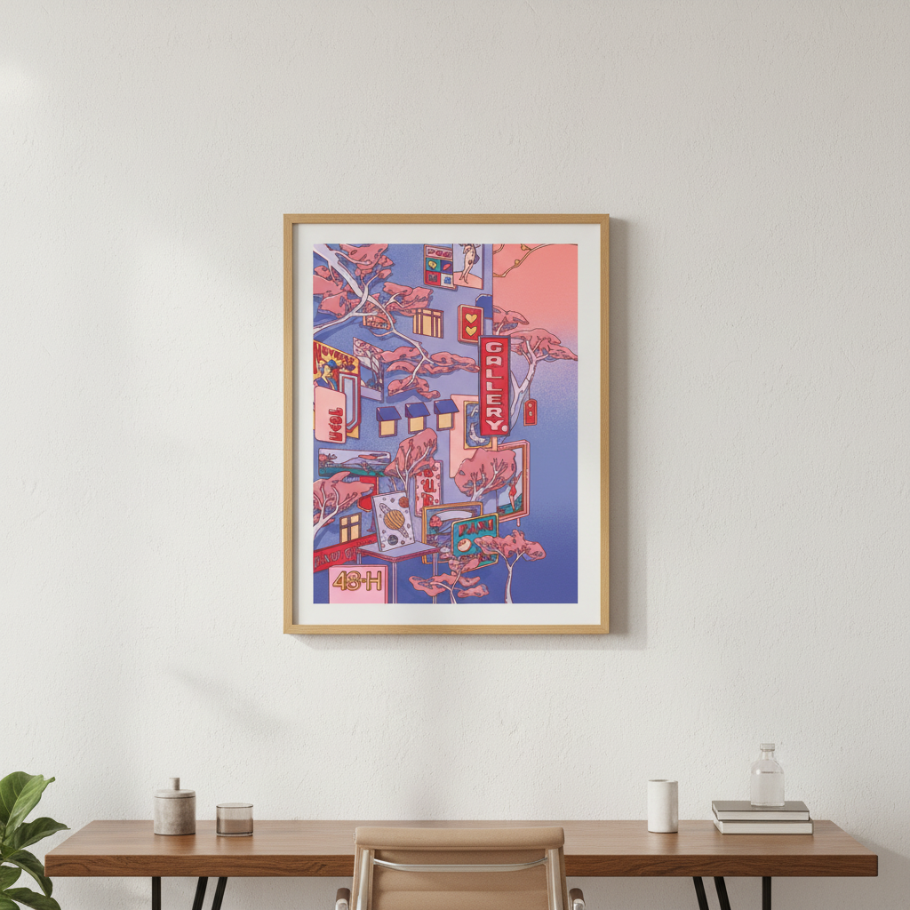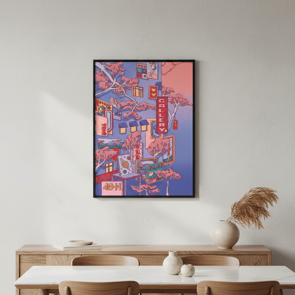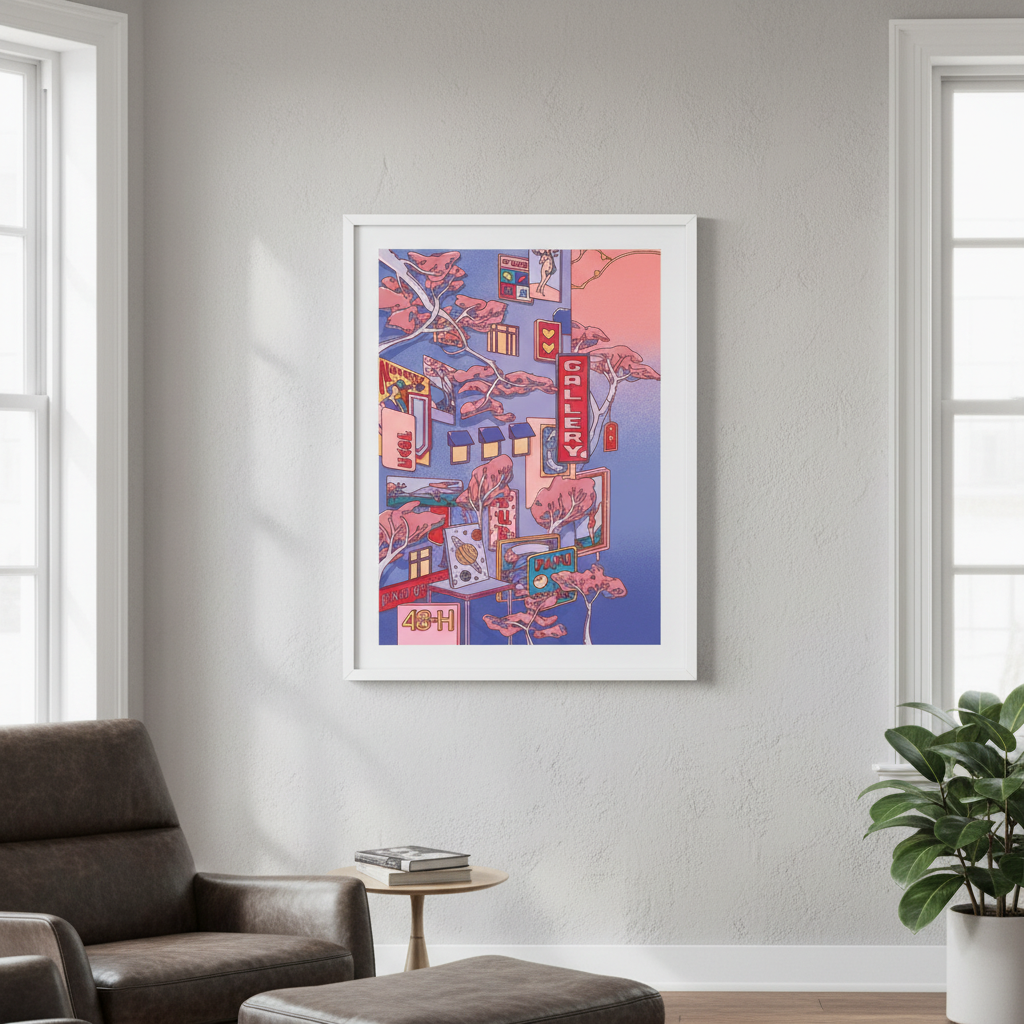 Sundays at the Sake Hotel I Blue captures a vibrant urban moment with masterful colour composition. Lauren Ly's illustration depicts a lively street scene alive with architectural detail—charming signage, verdant trees, and layered buildings rendered in warm, inviting tones against a striking blue backdrop. The interplay between the cool background and warm foreground elements creates visual depth and movement, drawing the viewer into this dynamic streetscape. Perfect for adding sophisticated artistic character to any interior space, this piece demonstrates contemporary illustration at its finest.