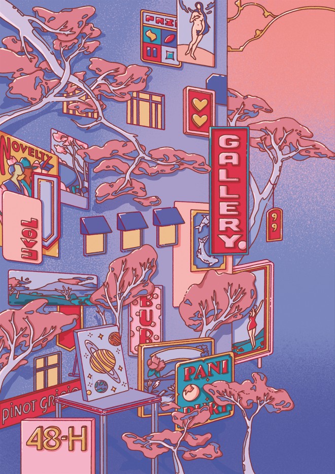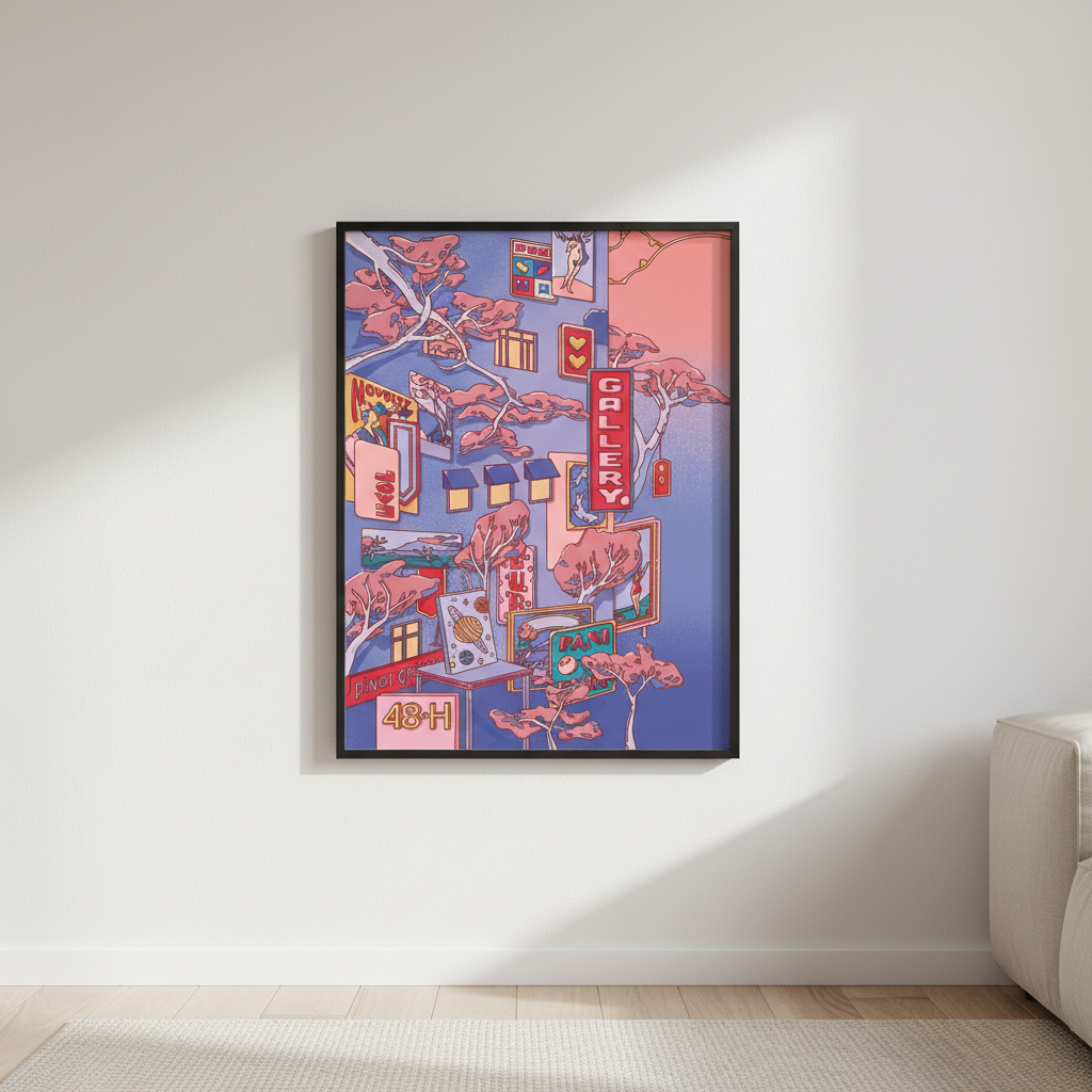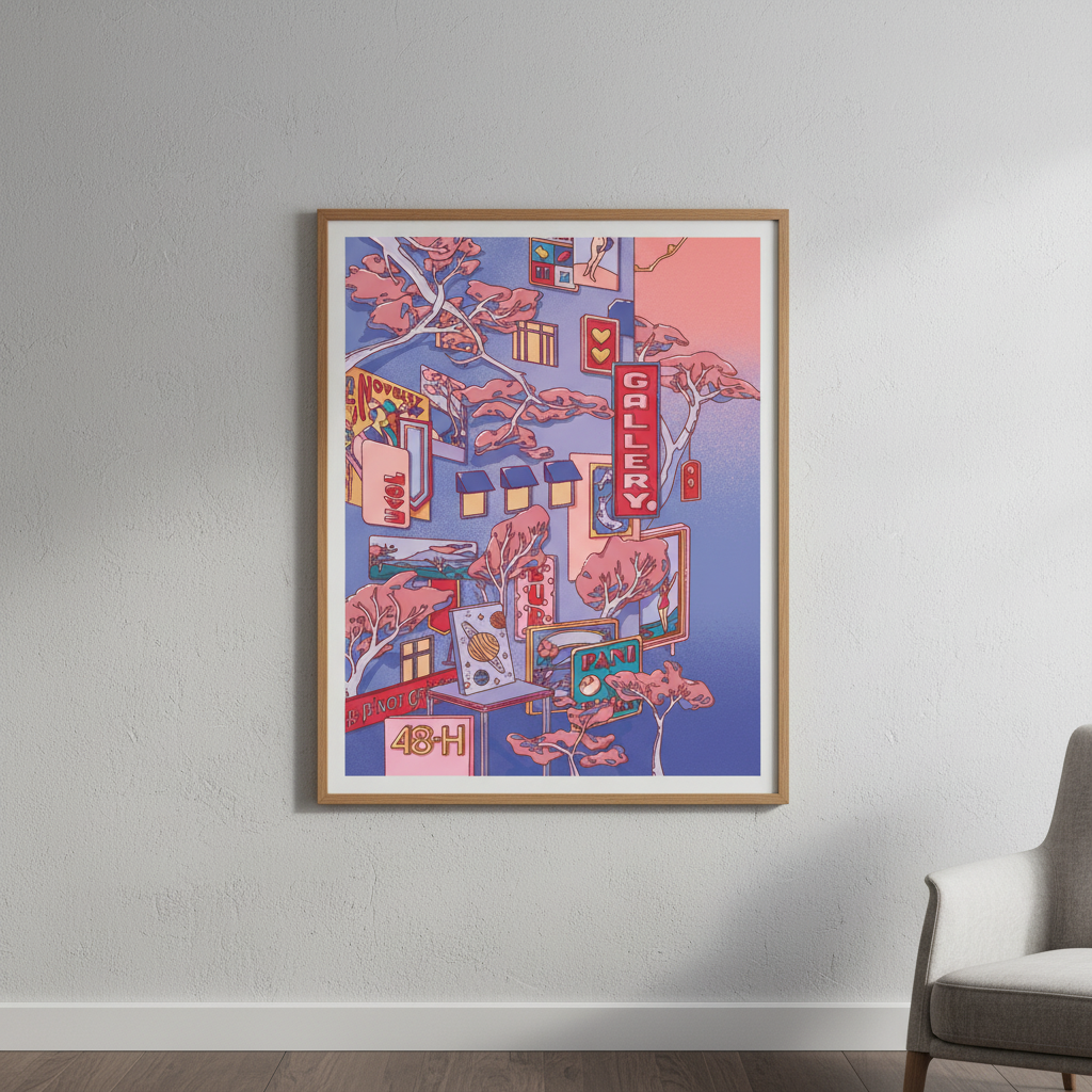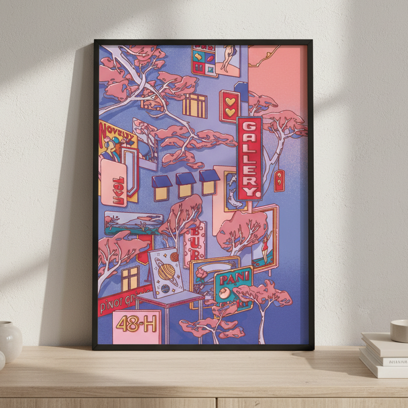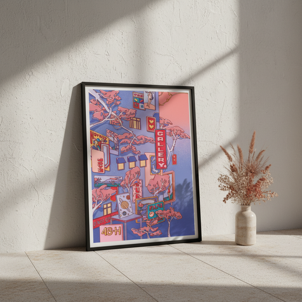 Sundays at the Sake Hotel I Blue captures a vibrant urban moment with masterful colour composition. Lauren Ly's illustration depicts a lively street scene alive with architectural detail—charming signage, verdant trees, and layered buildings rendered in warm, inviting tones against a striking blue backdrop. The interplay between the cool background and warm foreground elements creates visual depth and movement, drawing the viewer into this dynamic streetscape. Perfect for adding sophisticated artistic character to any interior space, this piece demonstrates contemporary illustration at its finest.