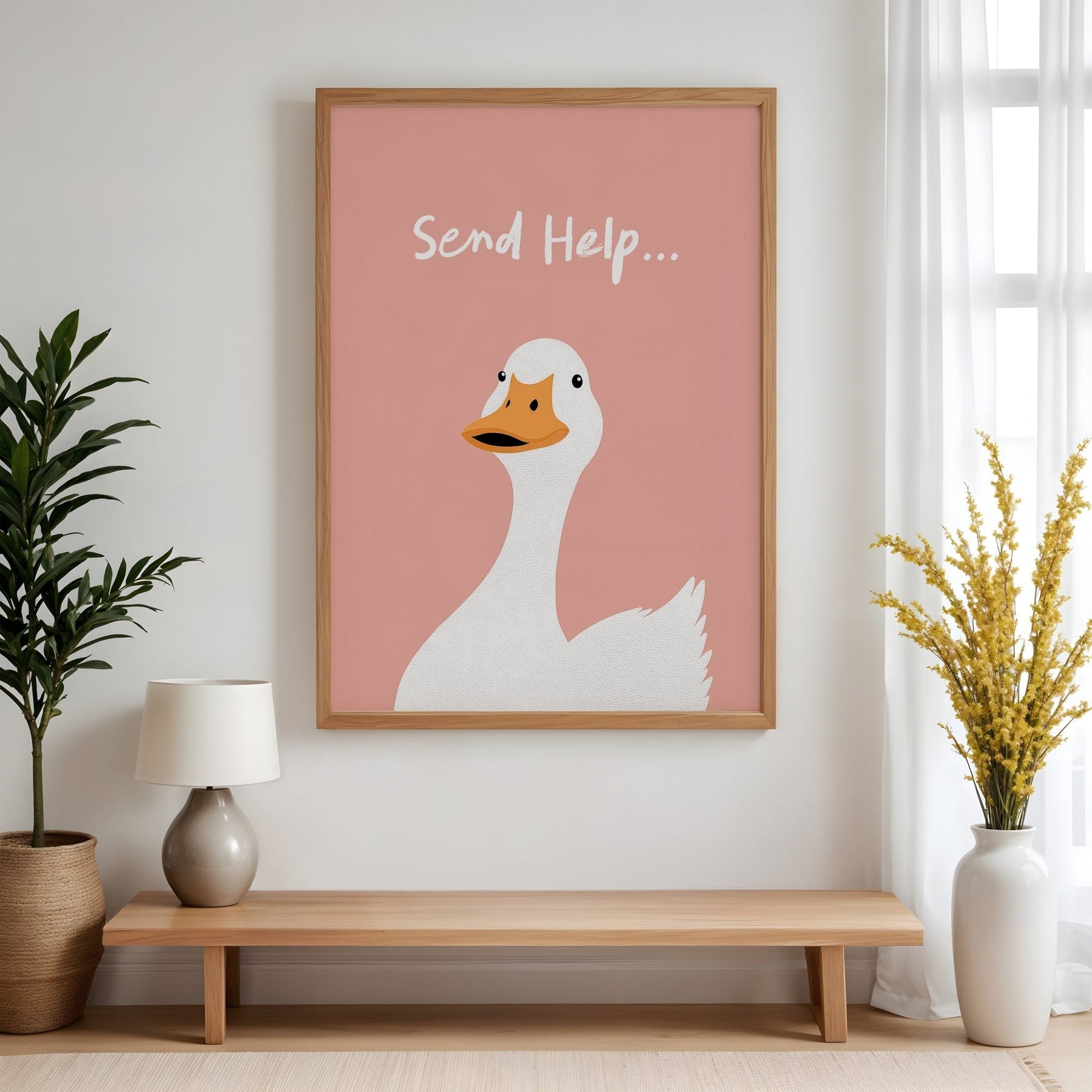 This quirky Send Help Pink Duck is here to add some fun to any room, whether it be your living room, kitchen, or bedroom! This playful poster is sure to bring a smile to your face. Help is on the way, in the form of a cute pink duck!