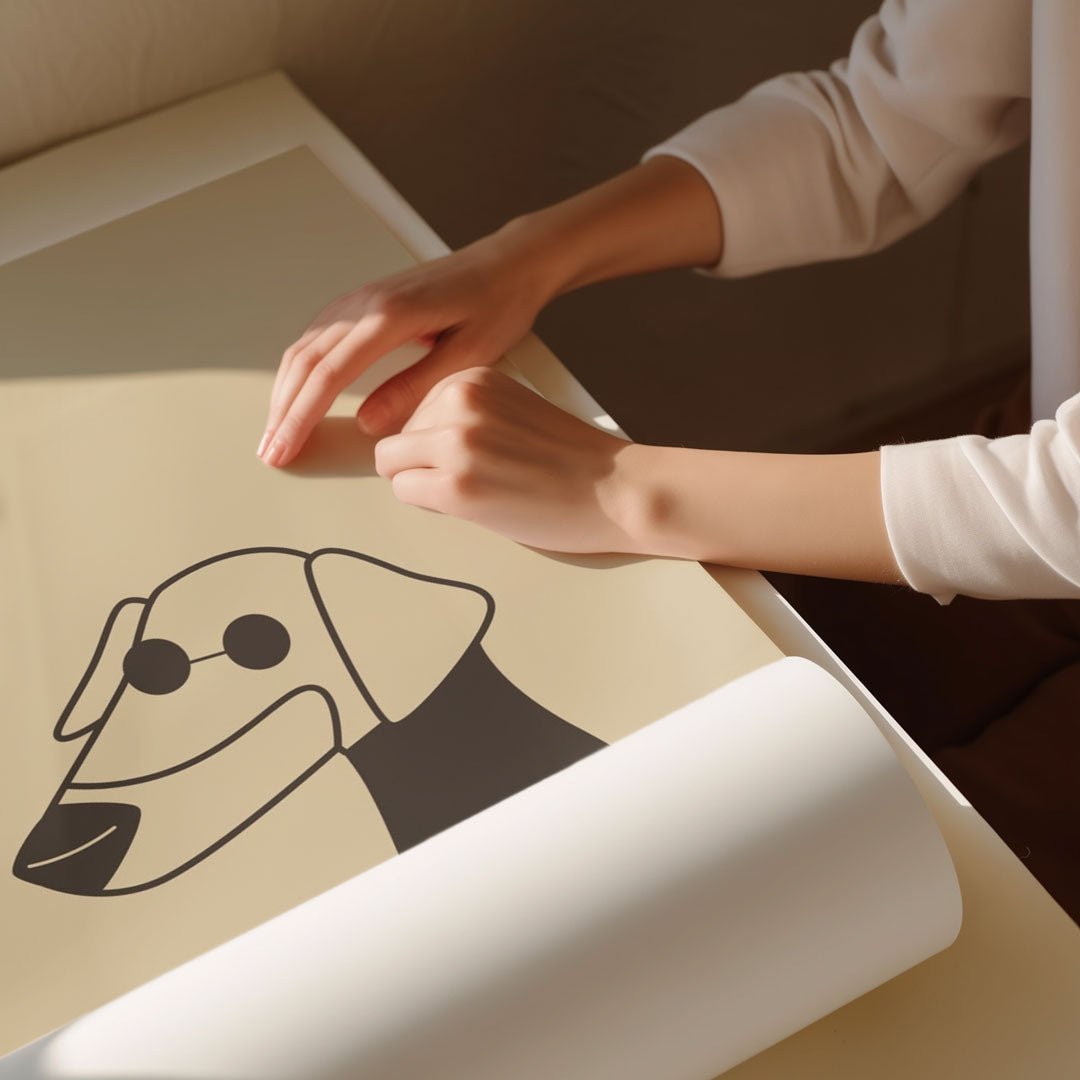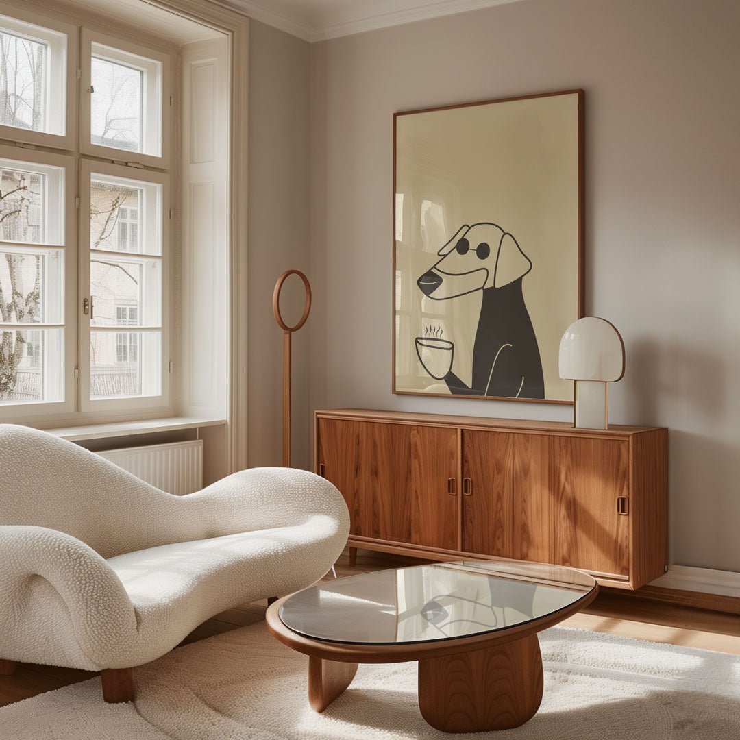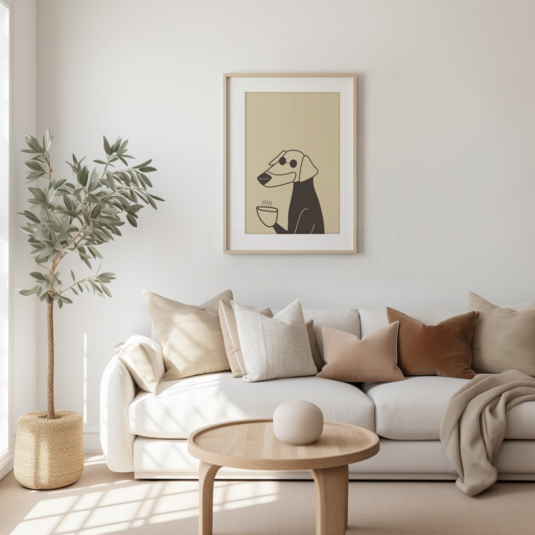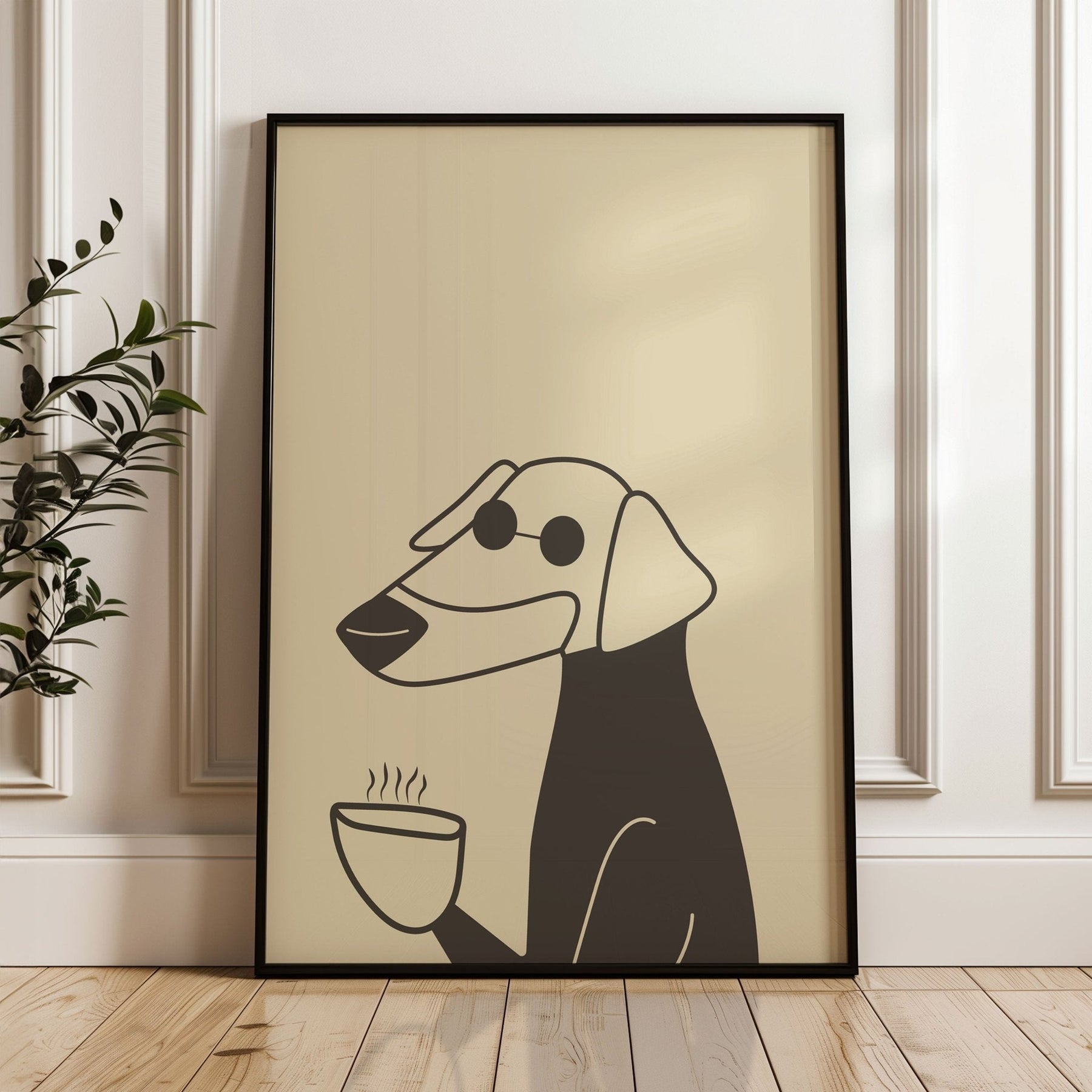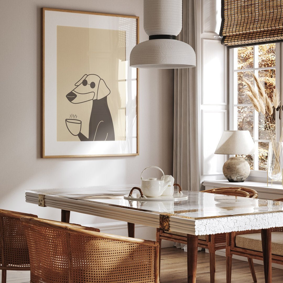 Introducing our captivating "Puppuccino Morning" wall art, a delightful addition to any space. This charming image showcases a stylish dog wearing sunglasses, savoring a cup of steaming coffee against a soothing beige background.