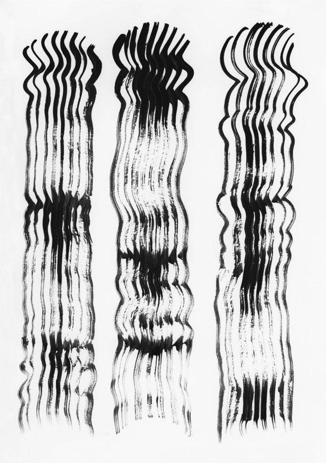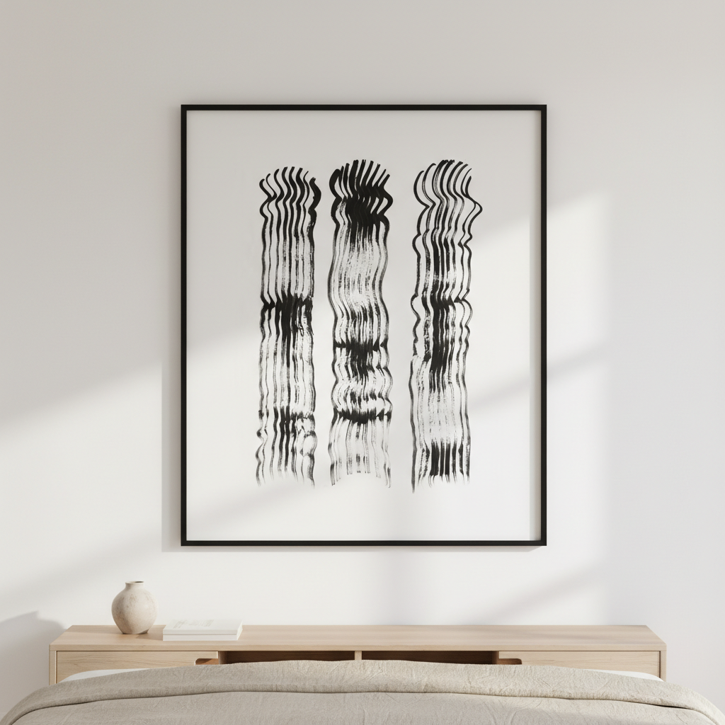 Minimalist meets moody with this striking abstract design. Three bold black wavy lines dance across a crisp white canvas, creating movement and intrigue in equal measure. Perfect for adding a touch of contemporary flair to any room, this piece proves that sometimes less really is more. A playful nod to modern art that doesn't take itself too seriously.