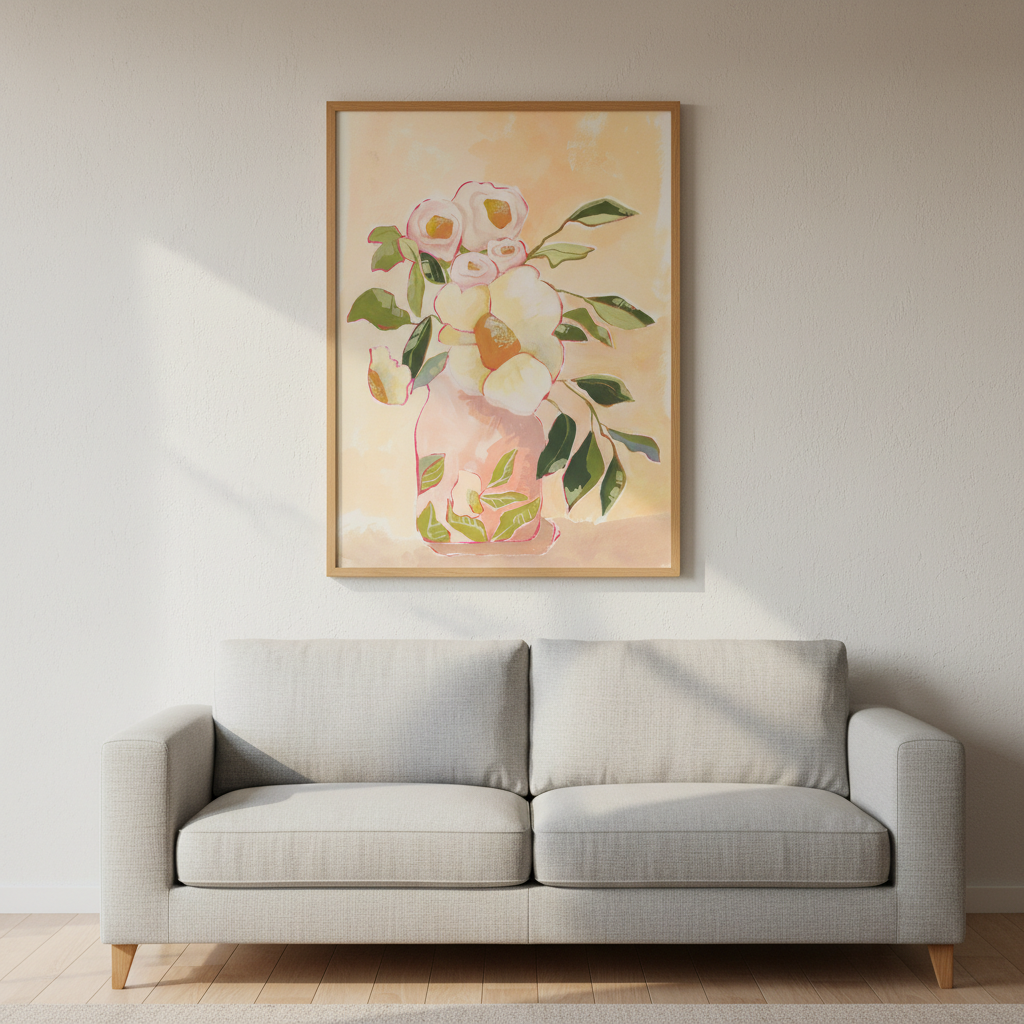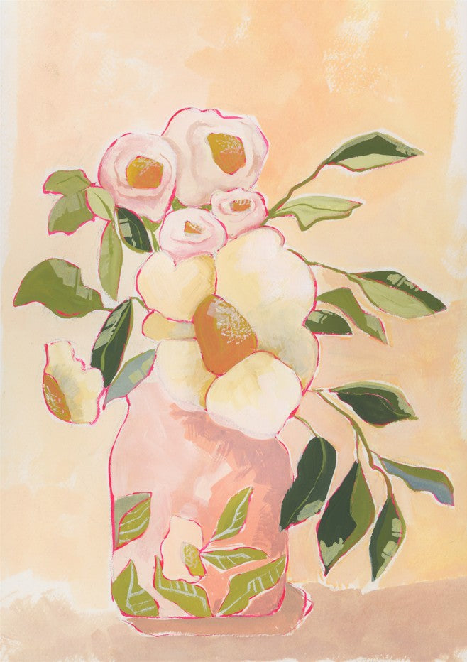 Bring a burst of botanical charm to your space with this delightful pink vase illustration. Featuring an elegant arrangement of blooms set against a soft, dreamy backdrop, this artwork captures the essence of fresh florals with a whimsical touch. Perfect for adding a pop of colour and personality to any room, whether displayed in your bedroom, living area, or creative workspace. A playful celebration of nature's beauty that brings joy and warmth to your walls every single day.