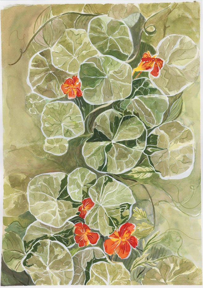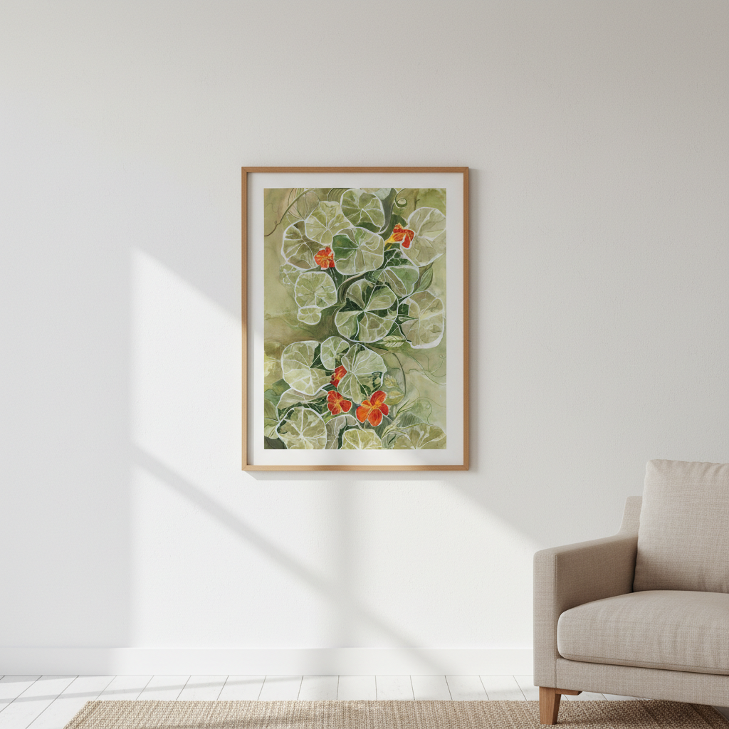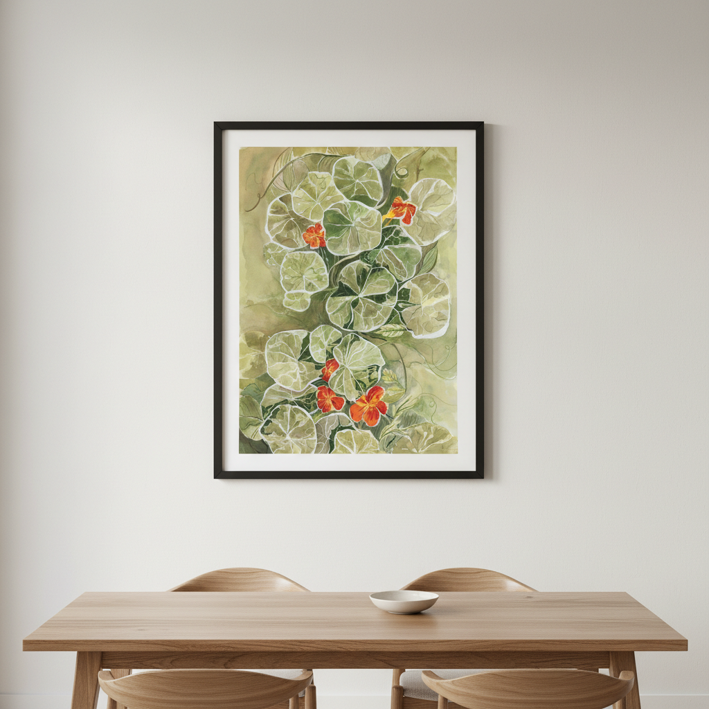 Bring botanical charm to your space with this delightful Nasturtium Tapestry by Lucrecia Caporale. Featuring vibrant orange flowers dancing among lush green leaves, this piece showcases a beautifully textured background that adds depth and visual interest. Perfect for adding a pop of colour and natural elegance to any room, this tapestry celebrates the cheerful spirit of nature with playful artistry. Transform your walls into a garden of joy!
