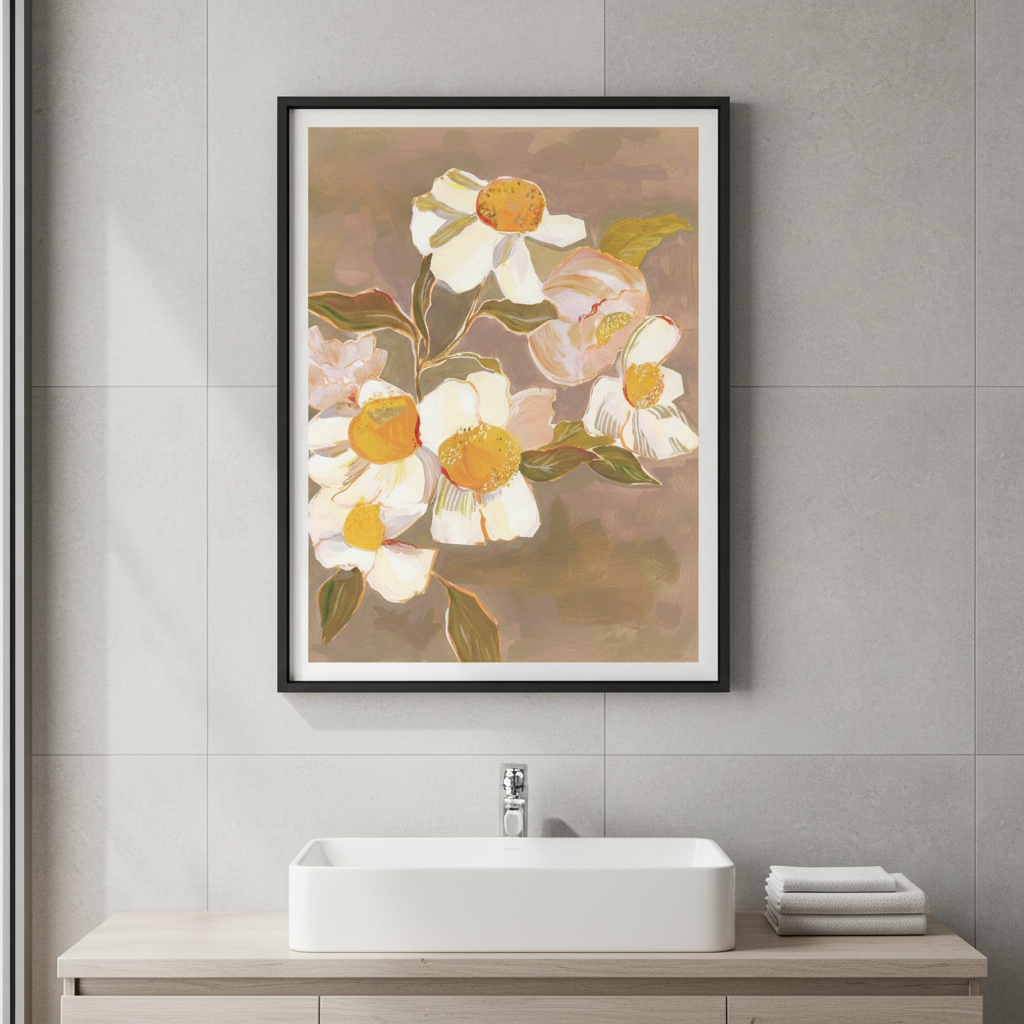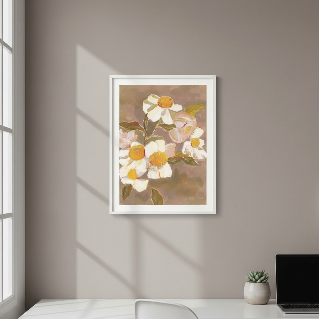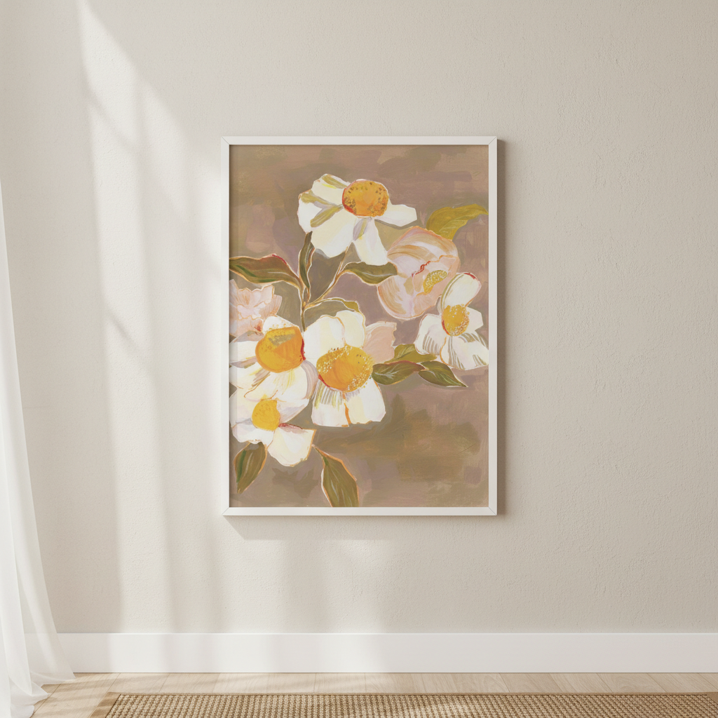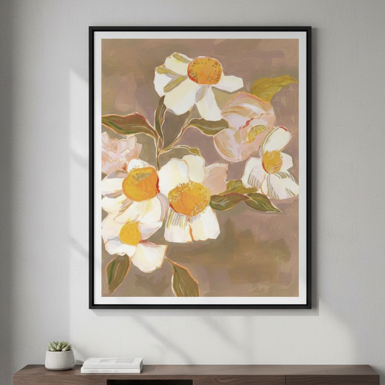 Summer Memories by Lucrecia Caporale captures the essence of botanical beauty through an artistic composition featuring delicate white-petaled flowers with luminous yellow centers set against a warm brown backdrop. This evocative piece combines naturalistic detail with a sophisticated colour palette, creating a timeless aesthetic that complements contemporary and traditional interiors alike. The interplay between the crisp white blooms and earthy tones establishes visual depth and warmth, making it an ideal choice for those seeking to introduce refined floral artistry into their space.