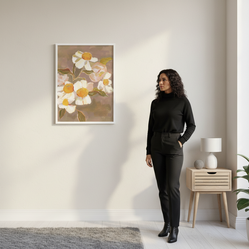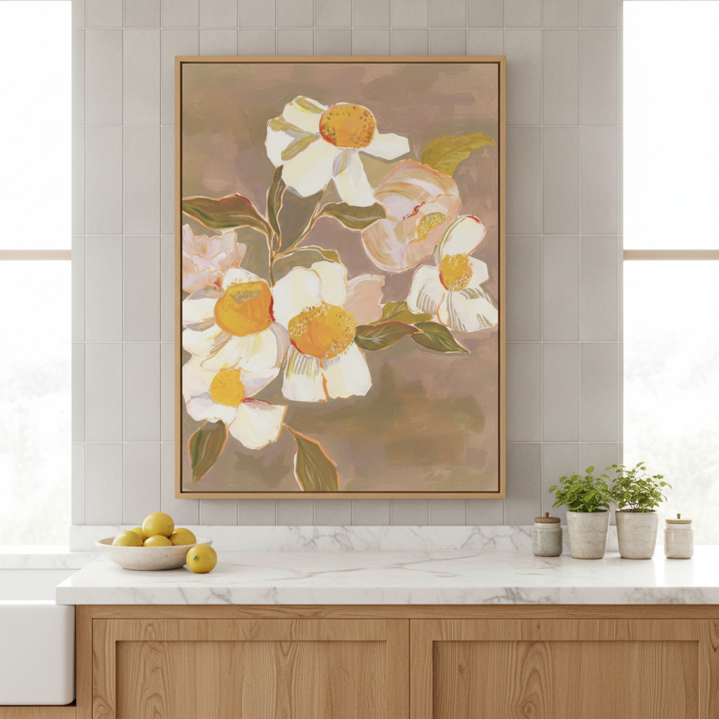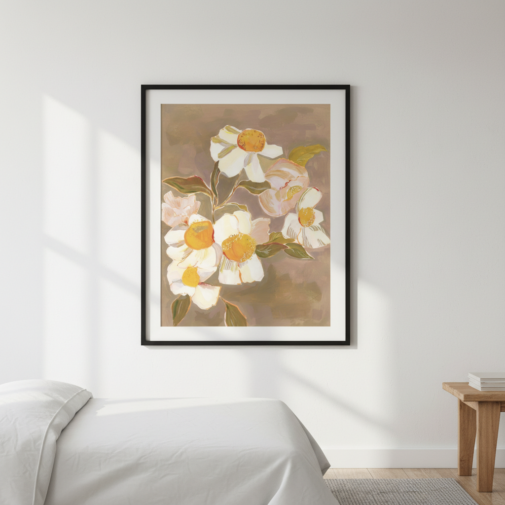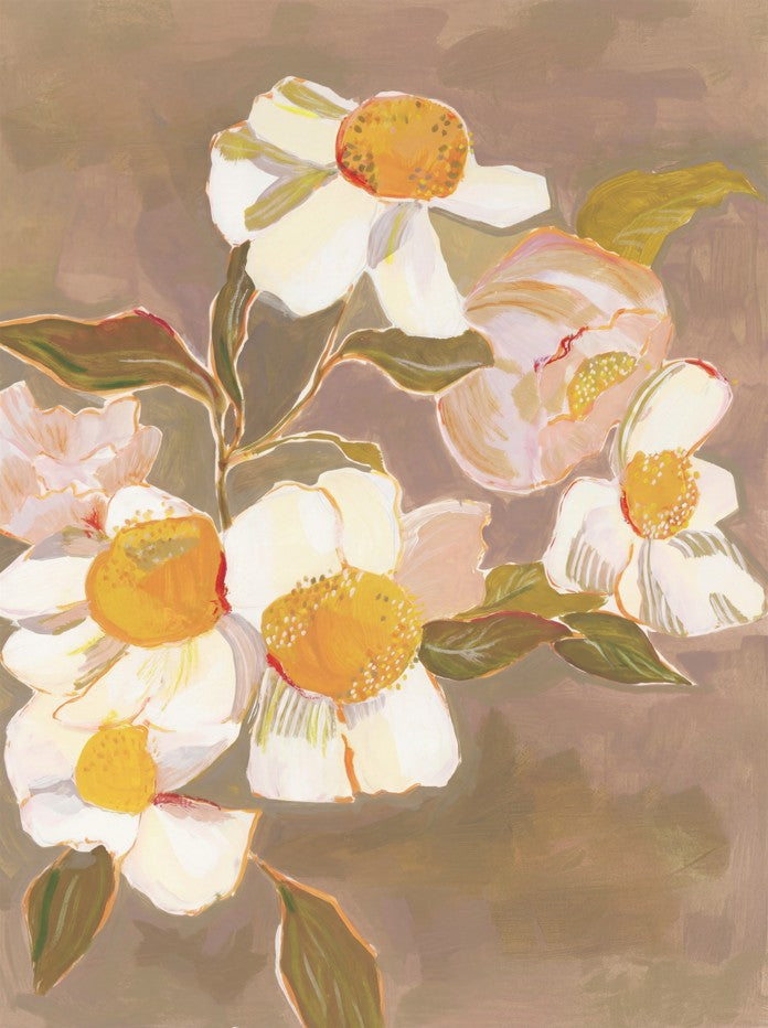 Summer Memories by Lucrecia Caporale captures the essence of botanical beauty through an artistic composition featuring delicate white-petaled flowers with luminous yellow centers set against a warm brown backdrop. This evocative piece combines naturalistic detail with a sophisticated colour palette, creating a timeless aesthetic that complements contemporary and traditional interiors alike. The interplay between the crisp white blooms and earthy tones establishes visual depth and warmth, making it an ideal choice for those seeking to introduce refined floral artistry into their space.