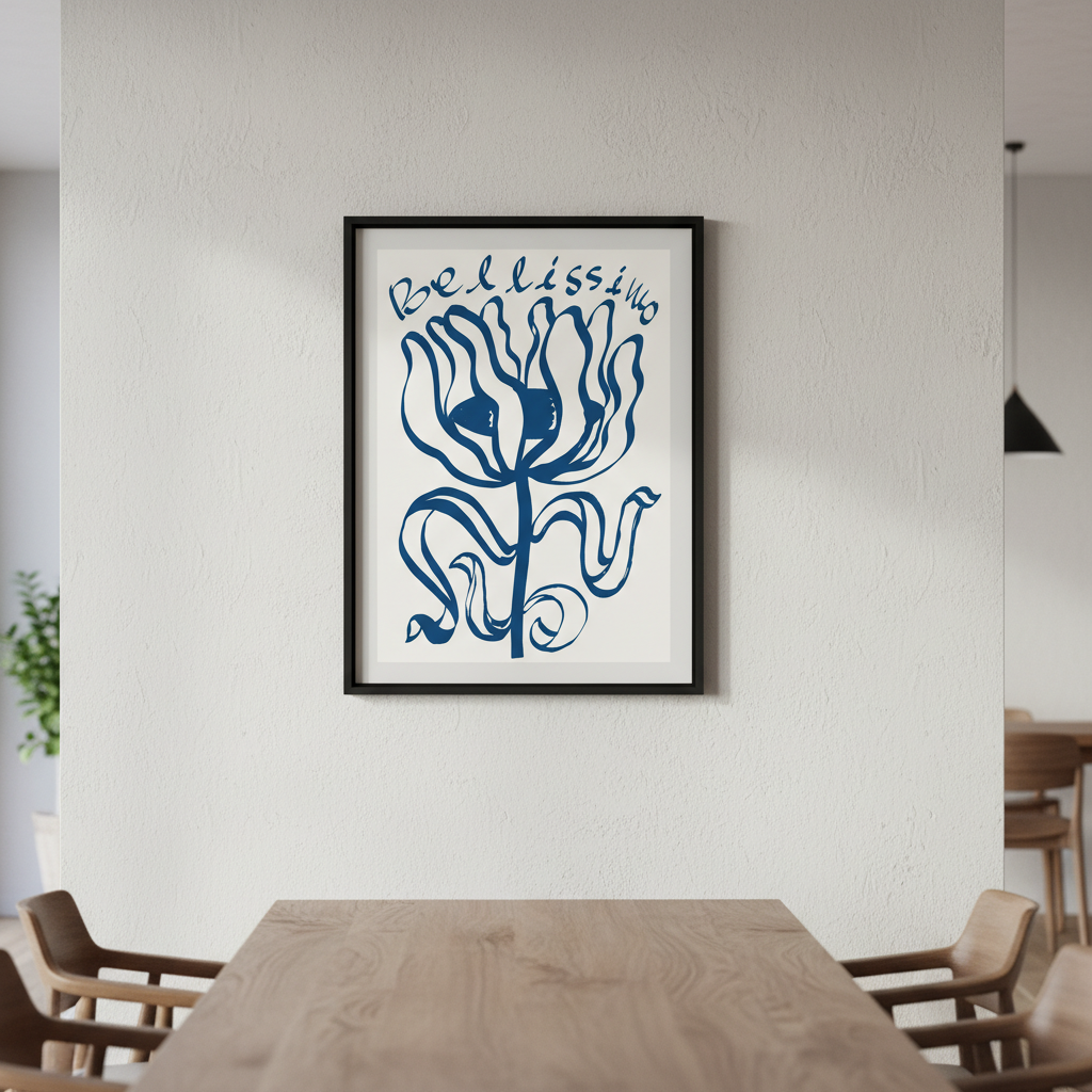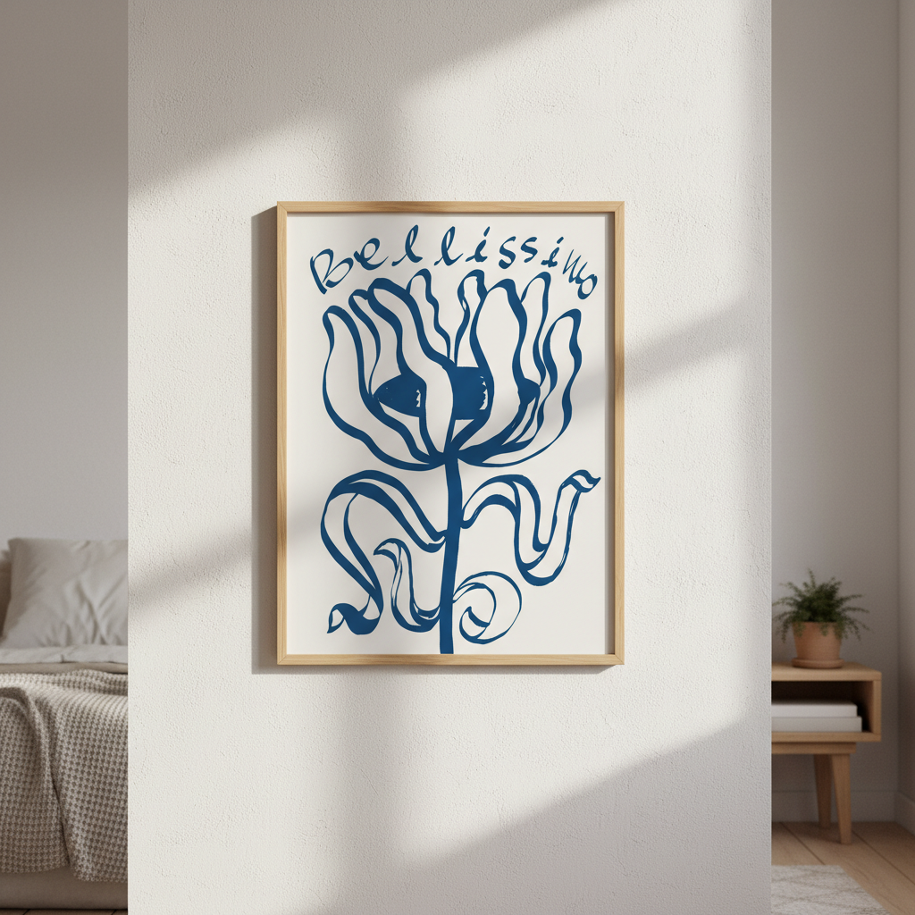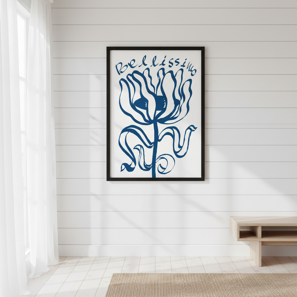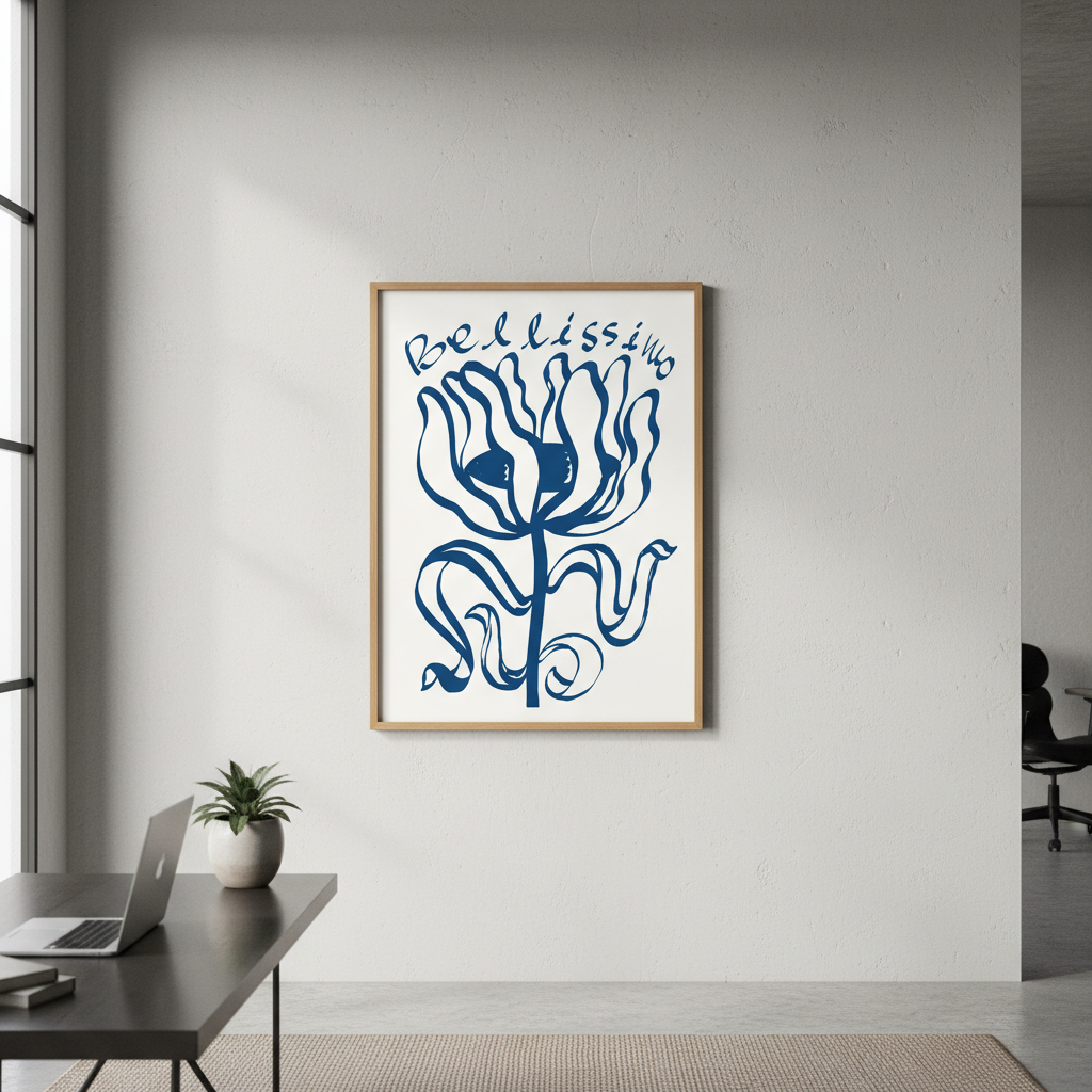 Elevate your space with this sophisticated wall art featuring an exquisite blue floral composition paired with elegant "Belissimo" typography. The crisp white background provides a clean, contemporary canvas that complements modern and traditional interiors alike. Perfect for bedrooms, living areas, or studies, this piece combines botanical beauty with refined lettering to create a statement that whispers rather than shouts. The balanced design ensures versatility—it works equally well as a standalone focal point or as part of a curated gallery wall arrangement.
