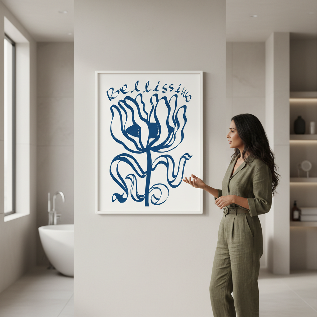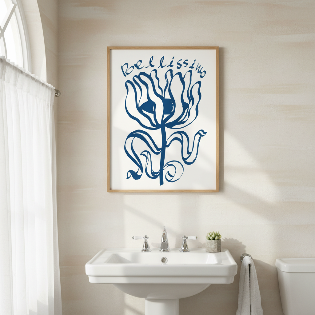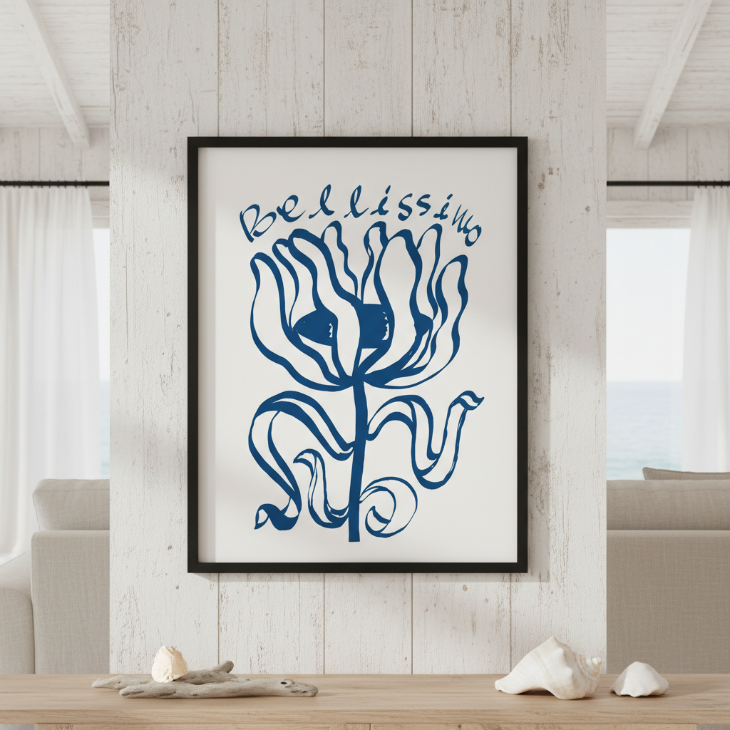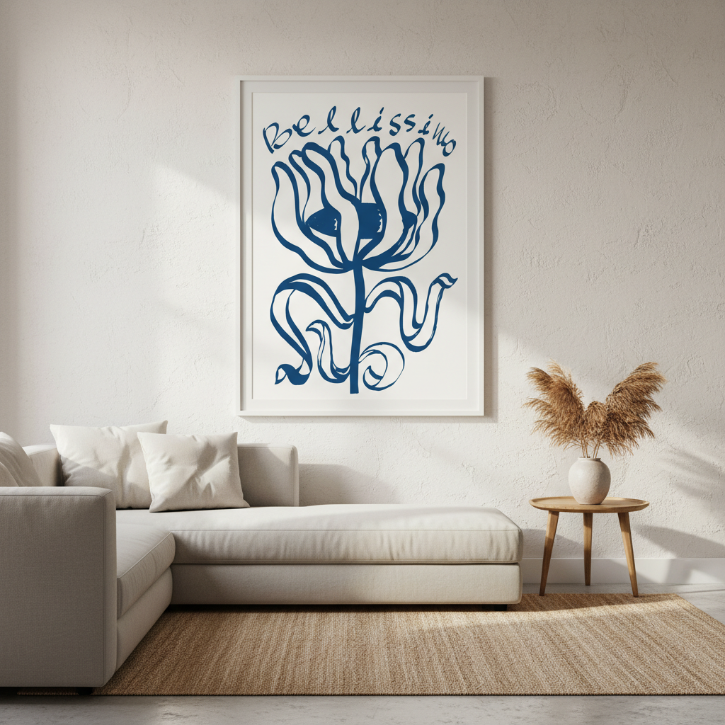 Elevate your space with this sophisticated wall art featuring an exquisite blue floral composition paired with elegant "Belissimo" typography. The crisp white background provides a clean, contemporary canvas that complements modern and traditional interiors alike. Perfect for bedrooms, living areas, or studies, this piece combines botanical beauty with refined lettering to create a statement that whispers rather than shouts. The balanced design ensures versatility—it works equally well as a standalone focal point or as part of a curated gallery wall arrangement.