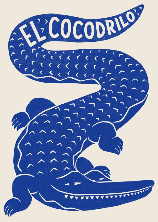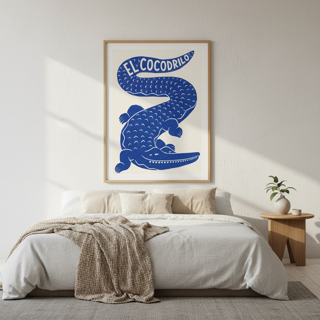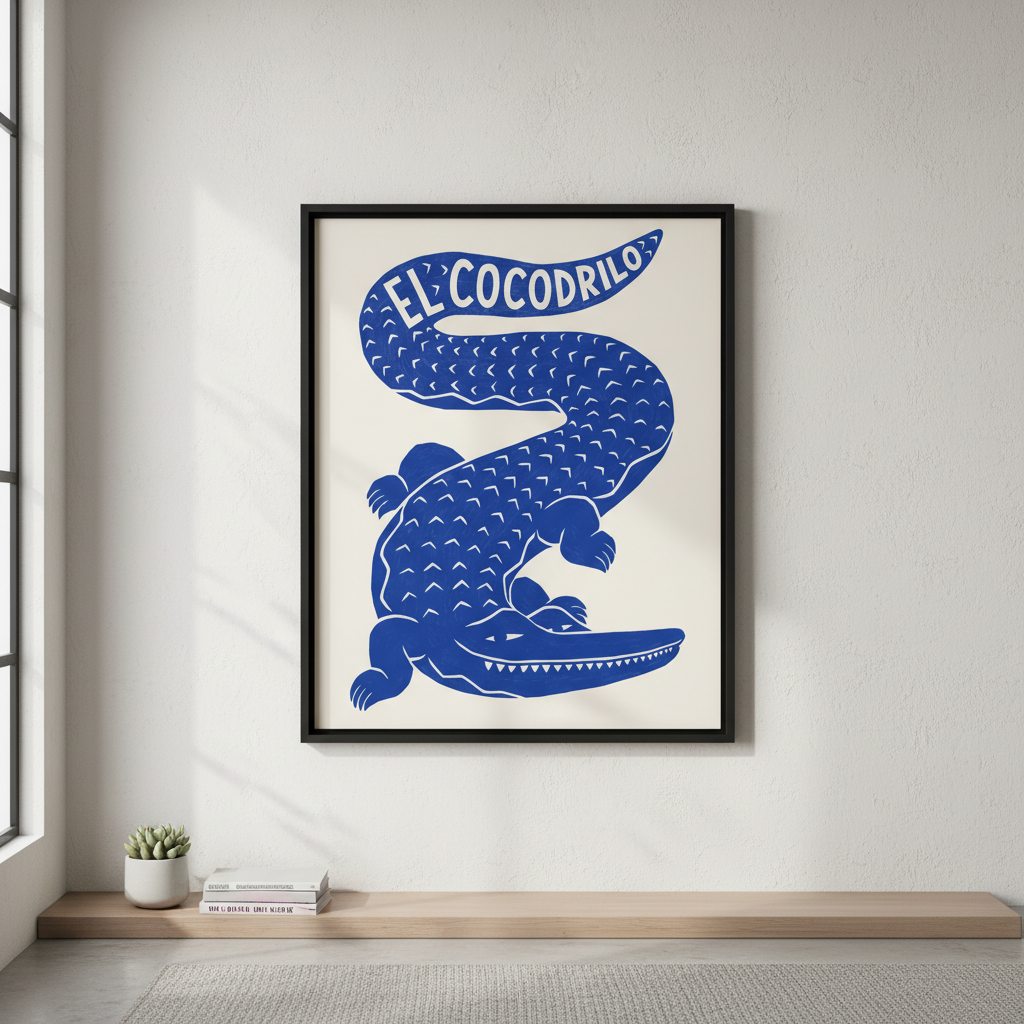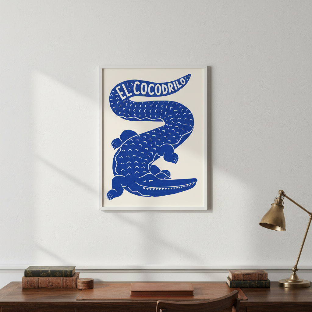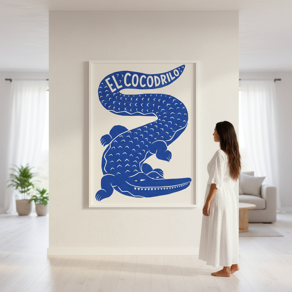 This striking illustration captures a vibrant blue crocodile rendered in bold, contemporary style against a warm beige backdrop. The Spanish text "El Cocodrilo" anchors the composition, creating a sophisticated piece that blends artistic flair with cultural reference. Manne Jalilian's distinctive approach transforms a classic subject into modern wall art, perfect for adding character to living spaces, nurseries, or creative studios. The colour contrast between the cool blue reptile and neutral background ensures visual impact while maintaining versatile decorating appeal.