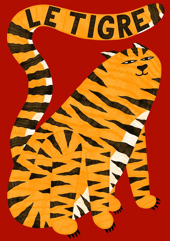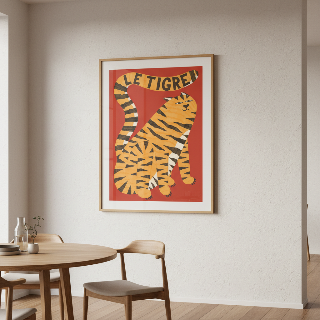 Le Tigre Red showcases a striking tiger illustration rendered with expert precision against a bold red background. This artwork by Manne Jalilian captures the animal's commanding presence through dynamic linework and careful attention to detail. The accompanying "Le Tigre" text adds a sophisticated French touch, elevating the piece beyond a simple animal study. Perfect for those seeking statement wall art that combines artistic merit with visual impact, this print brings gallery-quality aesthetics to any interior space.