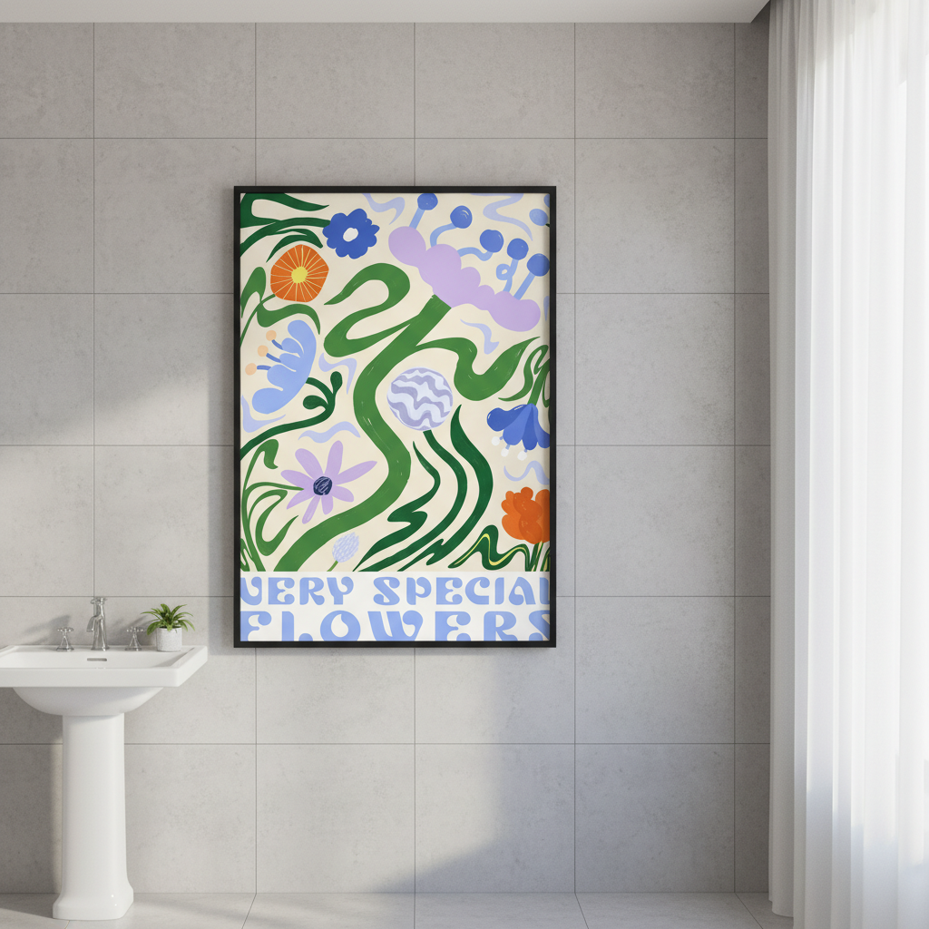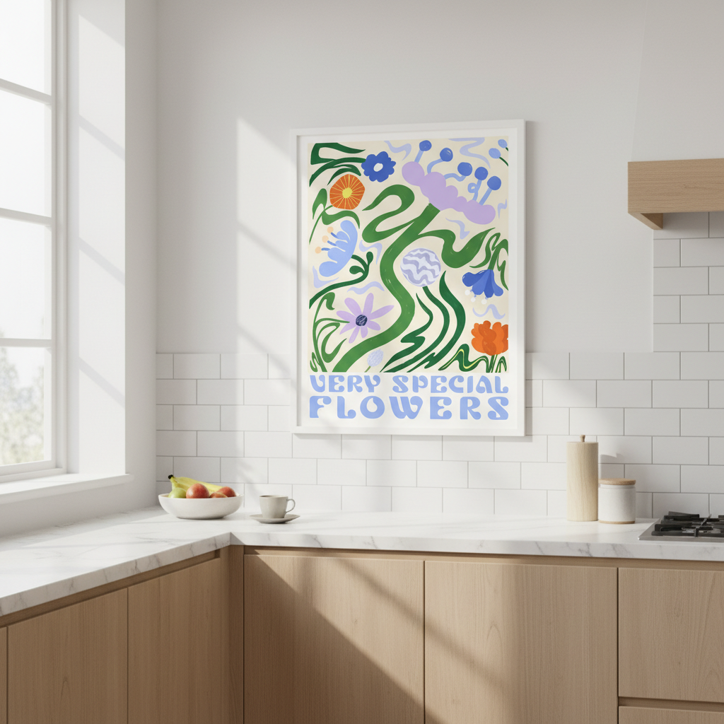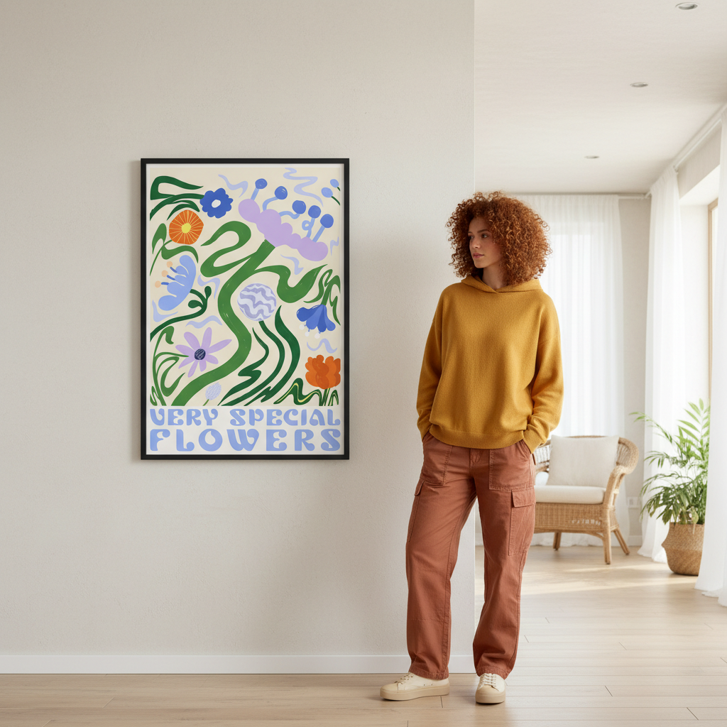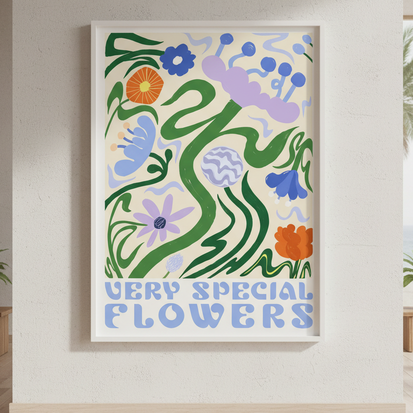 Transform your space with this striking art print featuring a vibrant floral composition set against a warm beige backdrop. The piece showcases an expertly curated arrangement of colorful blooms, complemented by the bold text "VERY SPECIAL FLOWERS" that adds contemporary character. Designed by Manne Jalilian, this work seamlessly blends botanical elegance with modern typography, making it an ideal statement piece for living rooms, bedrooms, or creative spaces. The neutral background ensures versatility, allowing the vivid florals to command attention while maintaining sophisticated restraint. Perfect for those seeking to elevate their interior with artistic flair and colour.