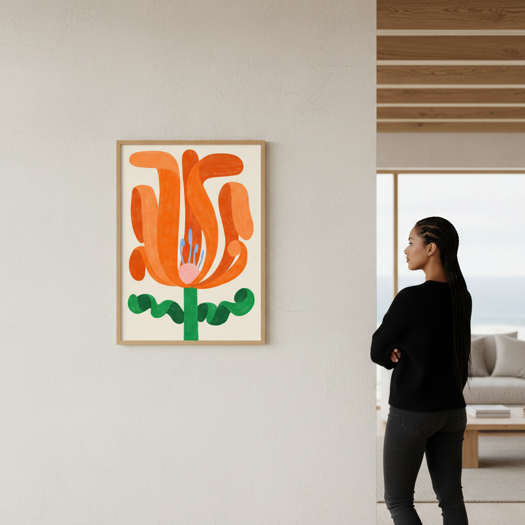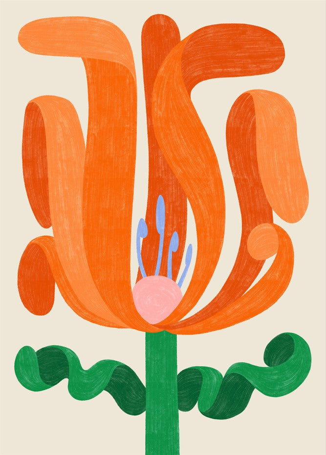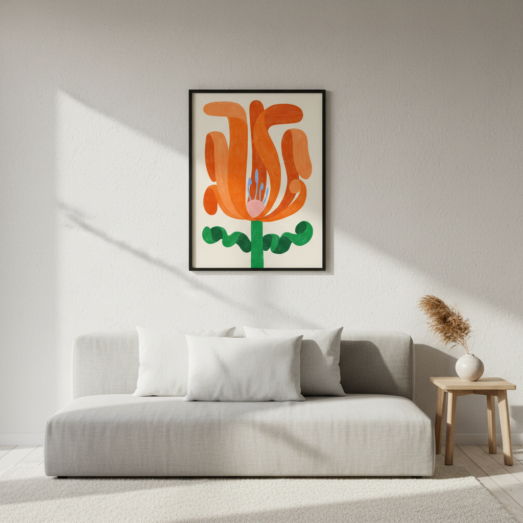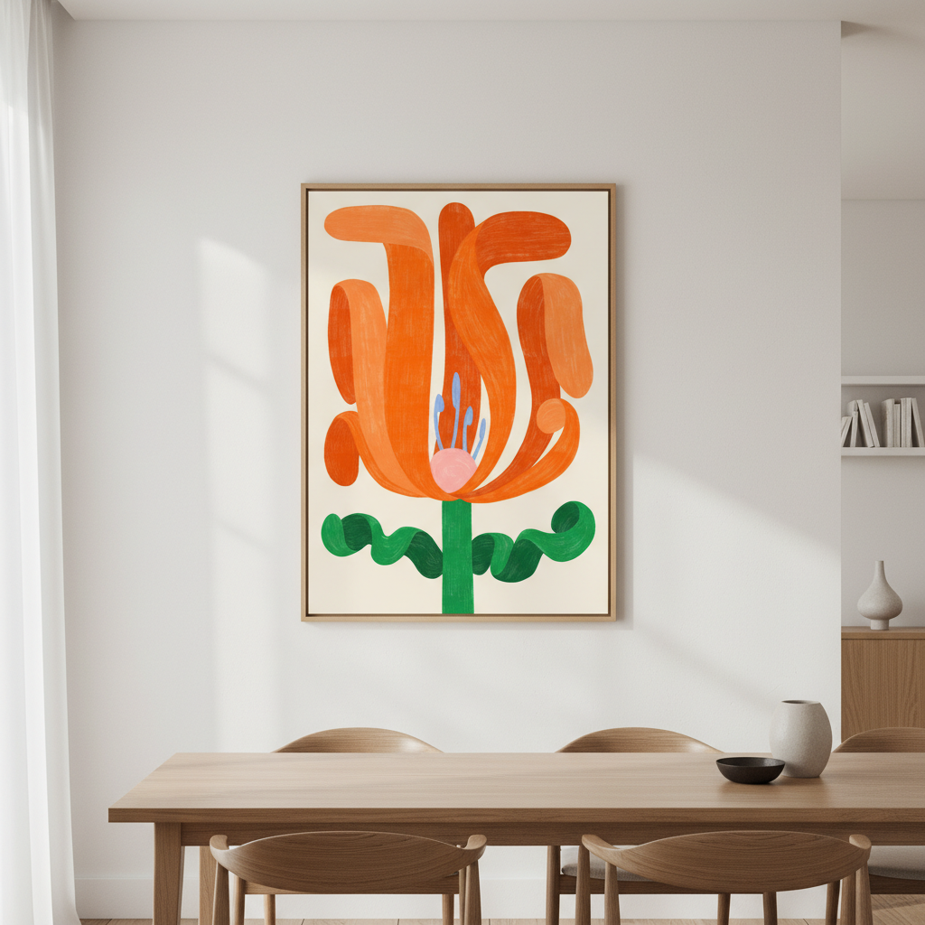 Wildflower by Manne Jalilian captures the essence of botanical elegance through abstract interpretation. This striking composition features a vibrant orange bloom rendered in fluid, expressive strokes, complemented by a graceful green stem against a serene beige backdrop. The artist's sophisticated approach transforms a simple floral subject into a contemporary art piece that brings warmth and organic beauty to any interior space. Perfect for those seeking modern wall art with timeless appeal.