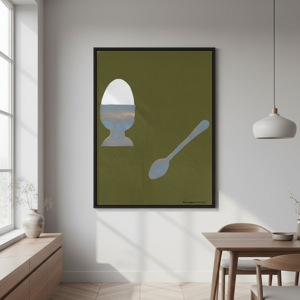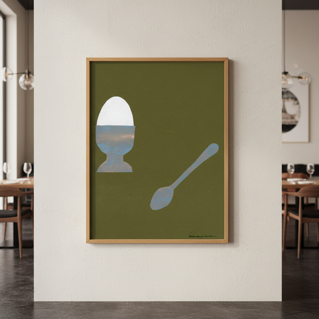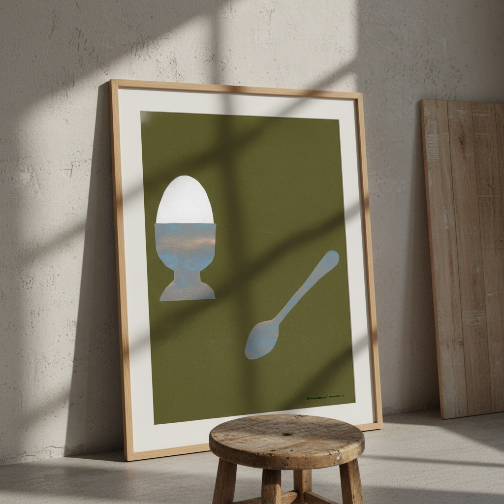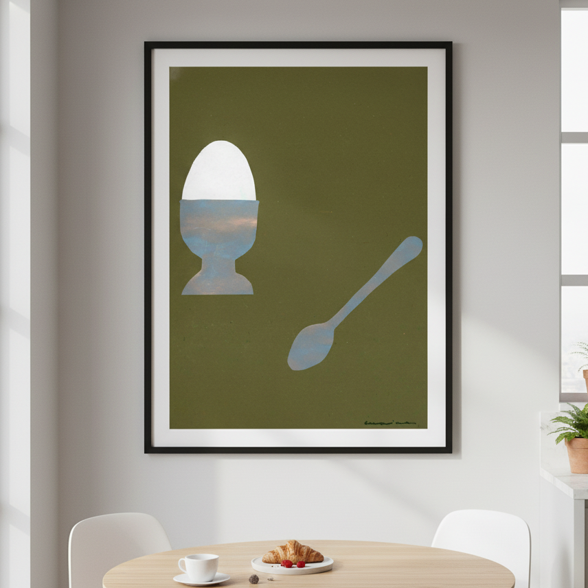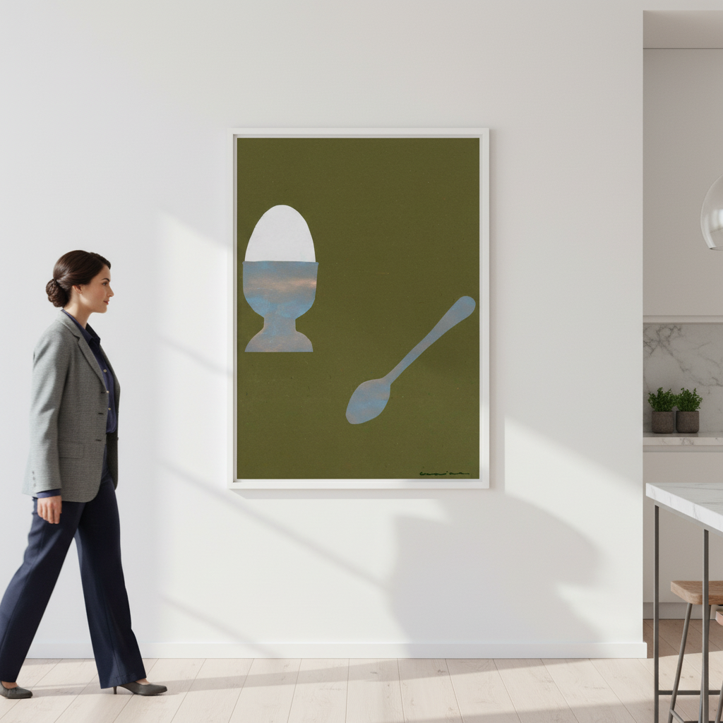 Huevo by Marina García Fernández captures the quiet elegance of a morning ritual. This striking composition features a perfectly poached egg nestled in a ceramic eggcup, accompanied by a delicate spoon, set against a serene green backdrop. The artwork celebrates the intersection of culinary simplicity and refined design, transforming an everyday moment into a contemplative visual statement. Marina Garcia Fernandez's masterful use of colour and form elevates the ordinary into something genuinely remarkable, making this piece an ideal choice for those who appreciate understated sophistication in their interior spaces.
