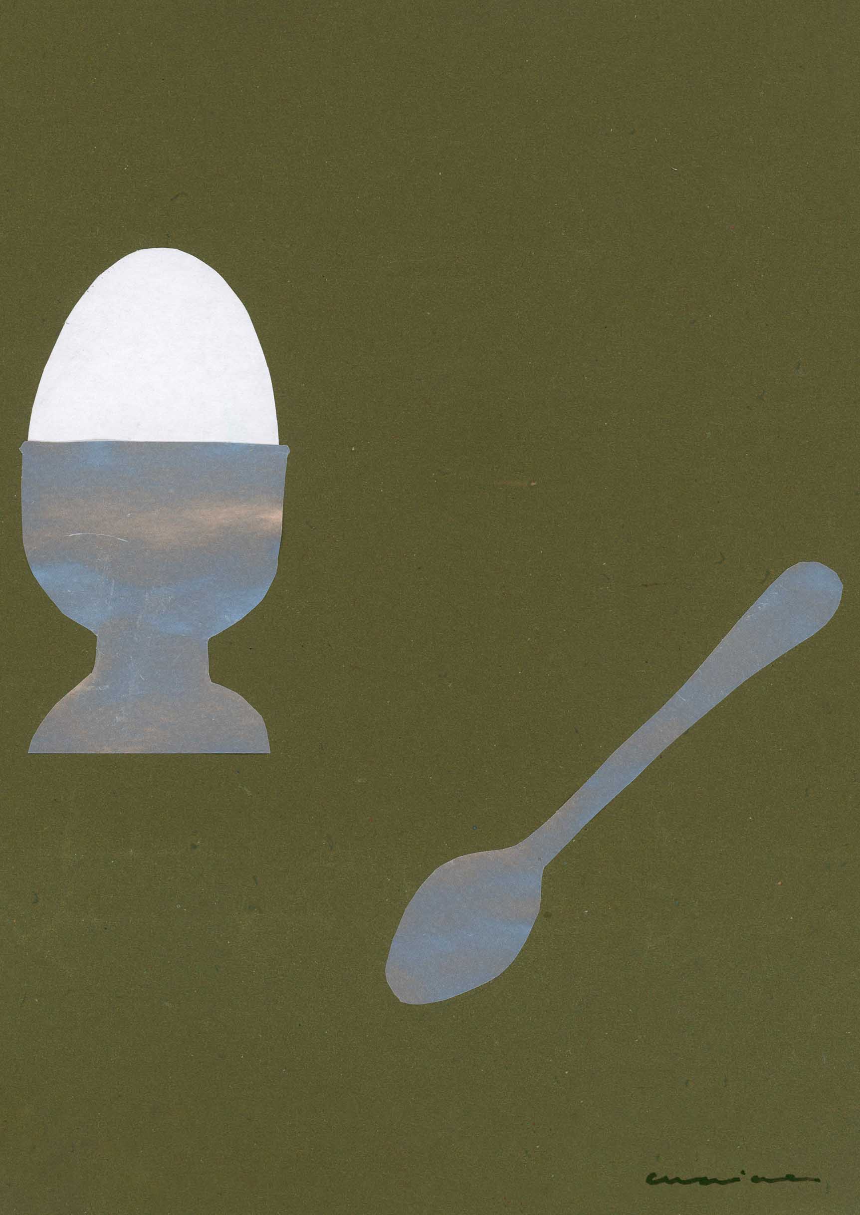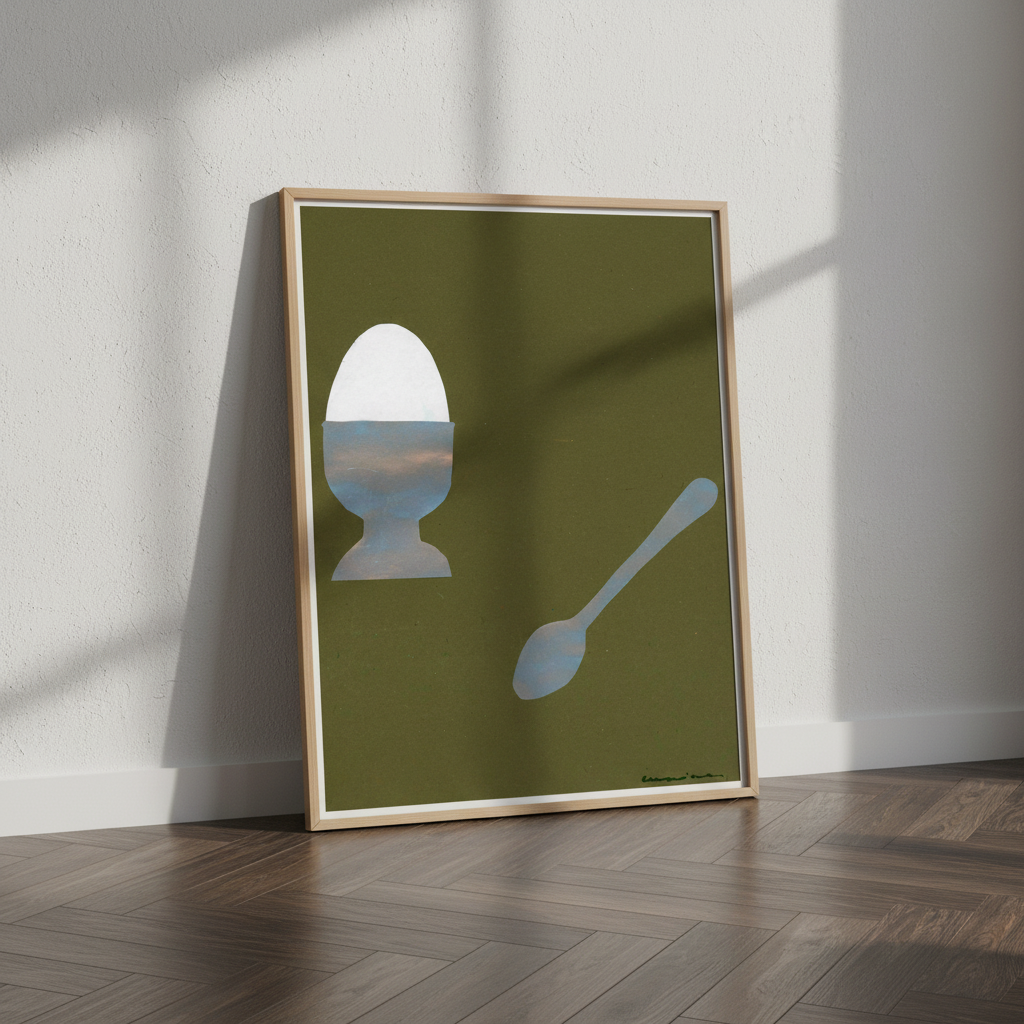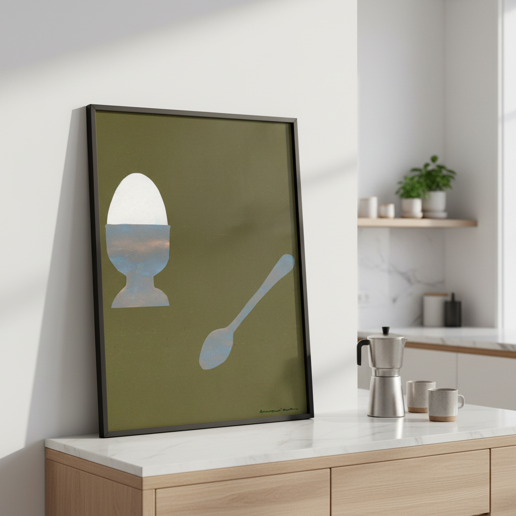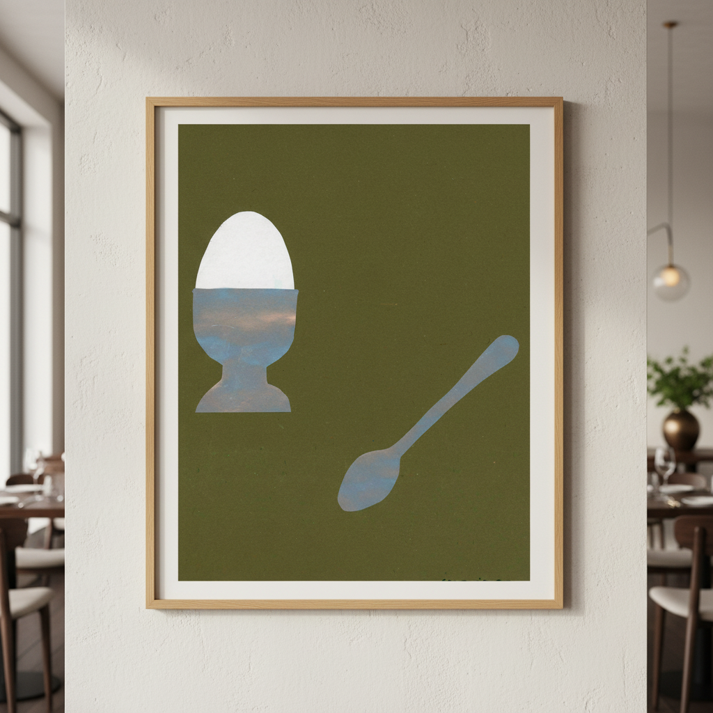 Huevo by Marina García Fernández captures the quiet elegance of a morning ritual. This striking composition features a perfectly poached egg nestled in a ceramic eggcup, accompanied by a delicate spoon, set against a serene green backdrop. The artwork celebrates the intersection of culinary simplicity and refined design, transforming an everyday moment into a contemplative visual statement. Marina Garcia Fernandez's masterful use of colour and form elevates the ordinary into something genuinely remarkable, making this piece an ideal choice for those who appreciate understated sophistication in their interior spaces.