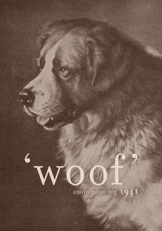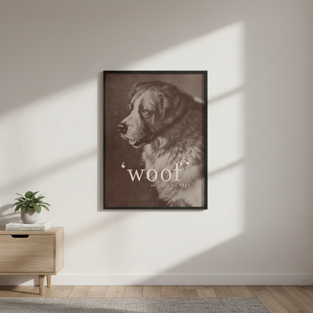 Celebrate man's best friend with this charming vintage-style portrait featuring a delightful dog and the cheeky text "woof" against a warm brown backdrop. Inspired by classic mid-century artwork, this piece credits "anonymous dog 1941" with a nod to timeless canine charm. Perfect for dog lovers and art enthusiasts alike, it brings nostalgic character and whimsical humour to any room. A playful tribute to our four-legged companions that's sure to spark smiles and conversations.