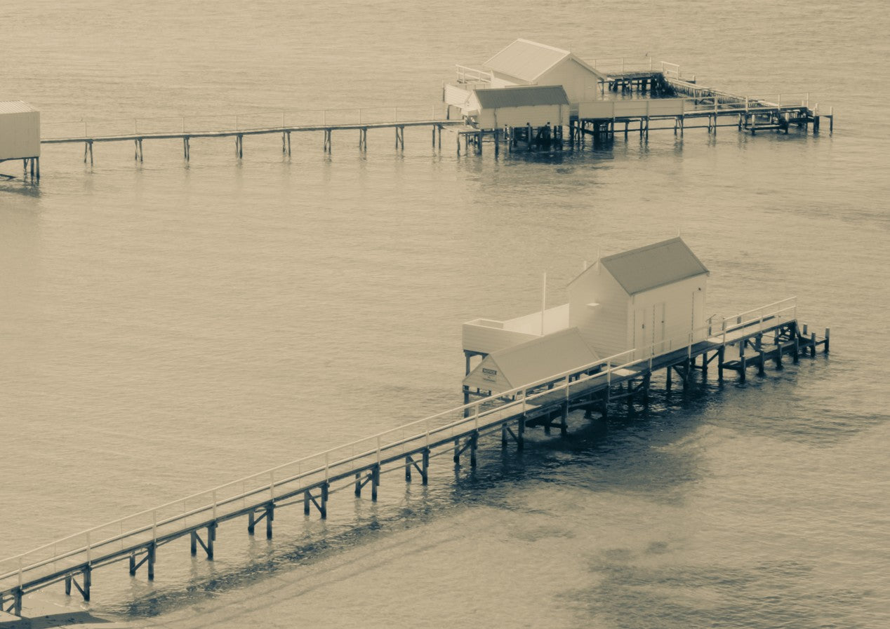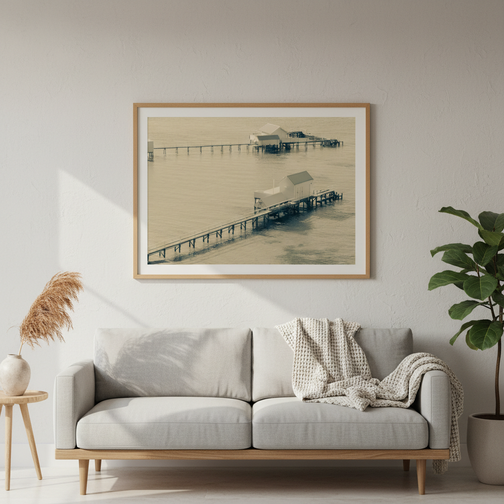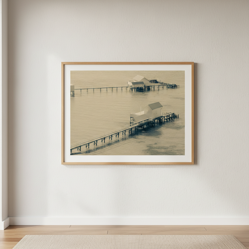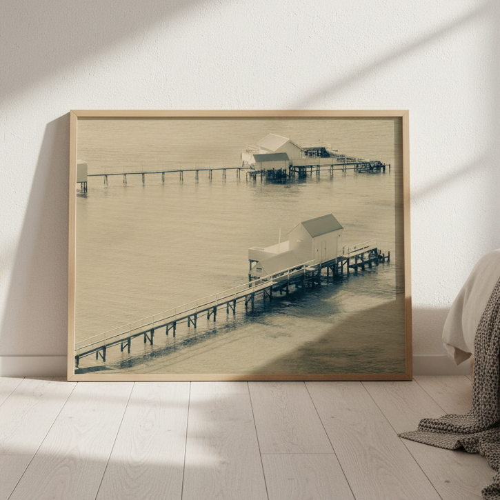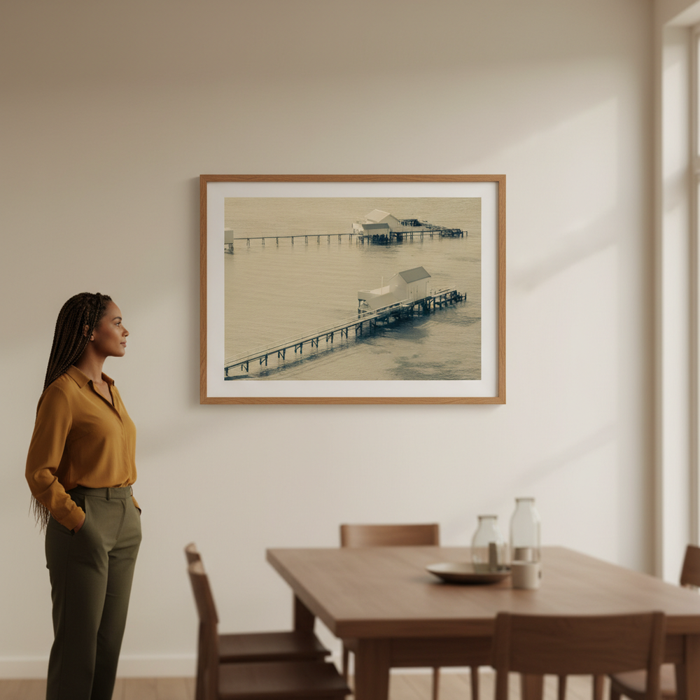 Capture the serene beauty of a long wooden pier stretching into calm waters, with charming buildings nestled at its end. This stunning artwork brings coastal tranquility into your space.