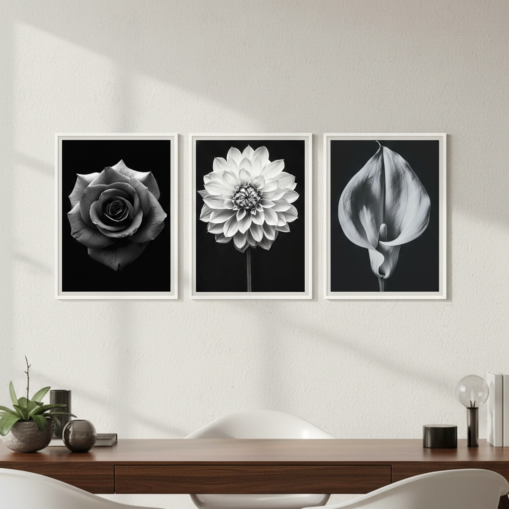 Three in Bloom by Peter Attard showcases three iconic flowers rendered in striking black and white photography. This curated set captures the delicate intricacy of a rose, the geometric complexity of a dahlia, and the elegant simplicity of a calla lily. Each photograph demonstrates masterful composition and tonal range, highlighting the natural architecture of these botanical subjects. Perfect for creating a sophisticated gallery wall or adding refined botanical artistry to any interior space.