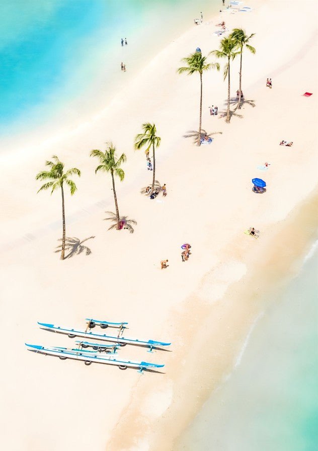 Shoreline Sentinels captures a striking aerial perspective of a vibrant beach scene, showcasing palm trees, beachgoers, and surfboards scattered across the sand and water. This compelling composition by Richard Podgurski transforms an everyday coastal moment into a dynamic visual narrative, revealing patterns and relationships visible only from above. The interplay of figures, natural elements, and recreational equipment creates depth and movement, making it an engaging focal point for any space celebrating coastal culture and contemporary landscape photography.