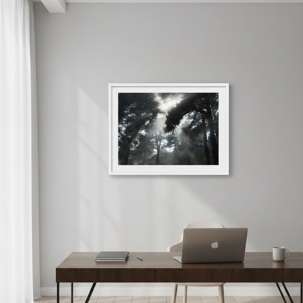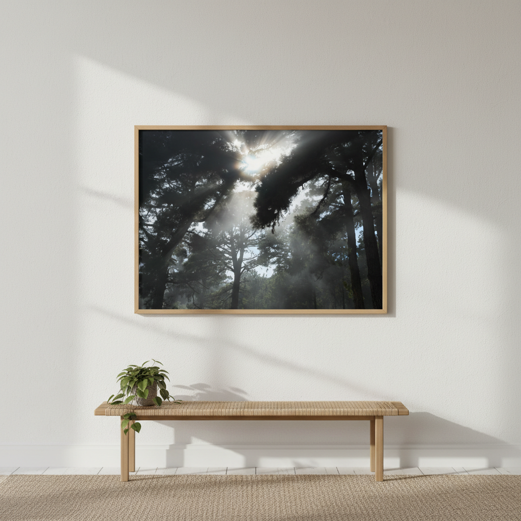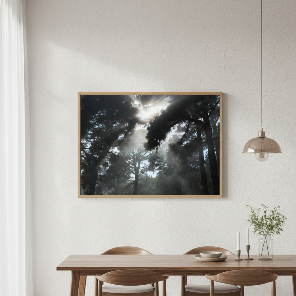 Capture the serene beauty of nature with this evocative photography by Robin Skjoldborg. Soft sunlight diffuses through a misty forest canopy, creating an atmospheric interplay of light and shadow that draws the viewer into a tranquil woodland scene. The delicate rendering of fog-filtered rays conveys a sense of calm and contemplation, making it an ideal choice for spaces seeking understated elegance and natural sophistication. Perfect for creating a focal point that invites quiet reflection.