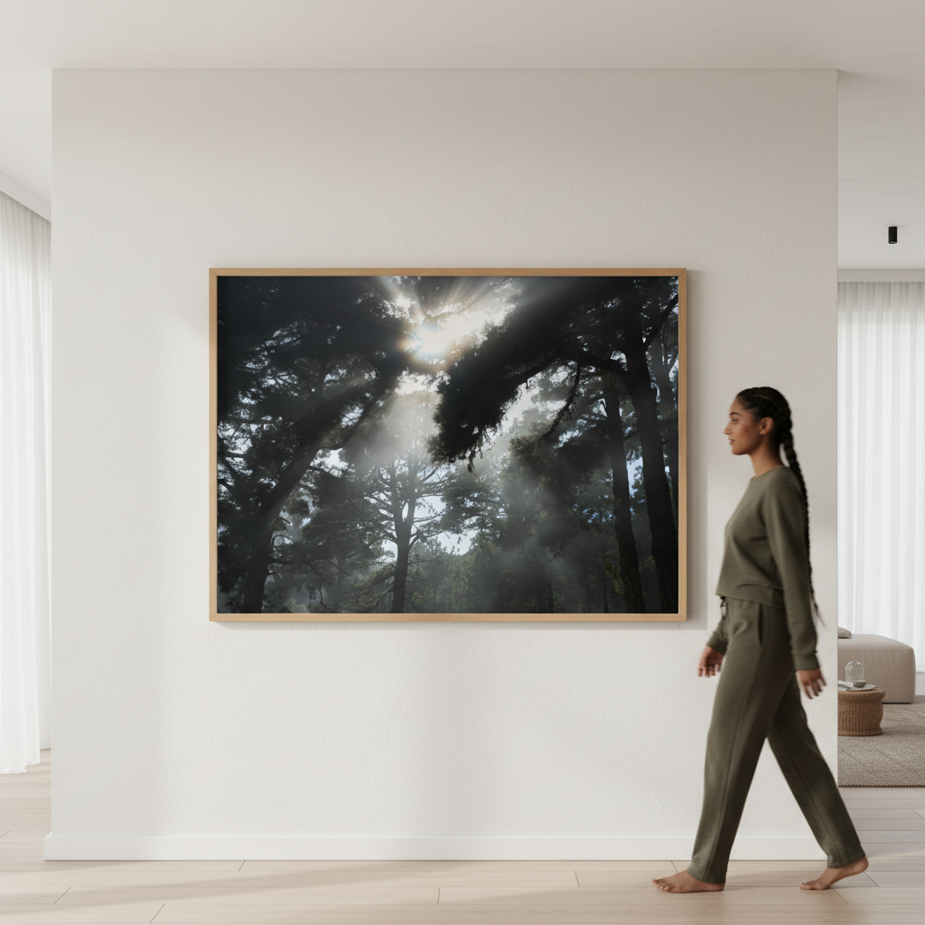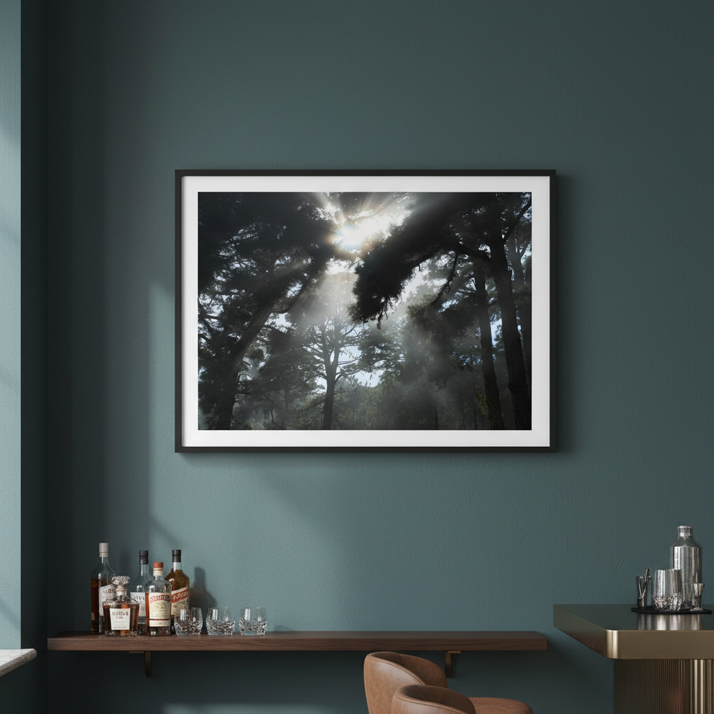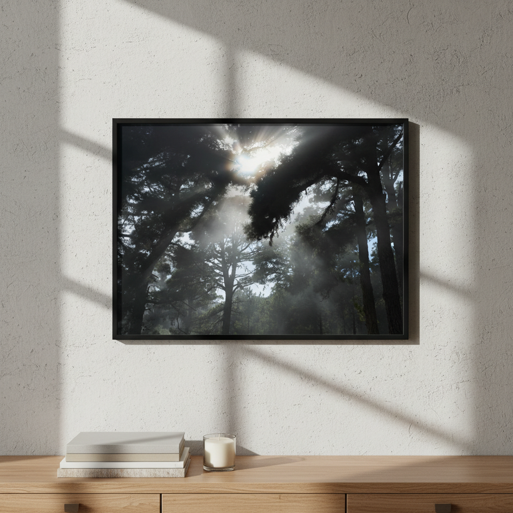Capture the serene beauty of nature with this evocative photography by Robin Skjoldborg. Soft sunlight diffuses through a misty forest canopy, creating an atmospheric interplay of light and shadow that draws the viewer into a tranquil woodland scene. The delicate rendering of fog-filtered rays conveys a sense of calm and contemplation, making it an ideal choice for spaces seeking understated elegance and natural sophistication. Perfect for creating a focal point that invites quiet reflection.