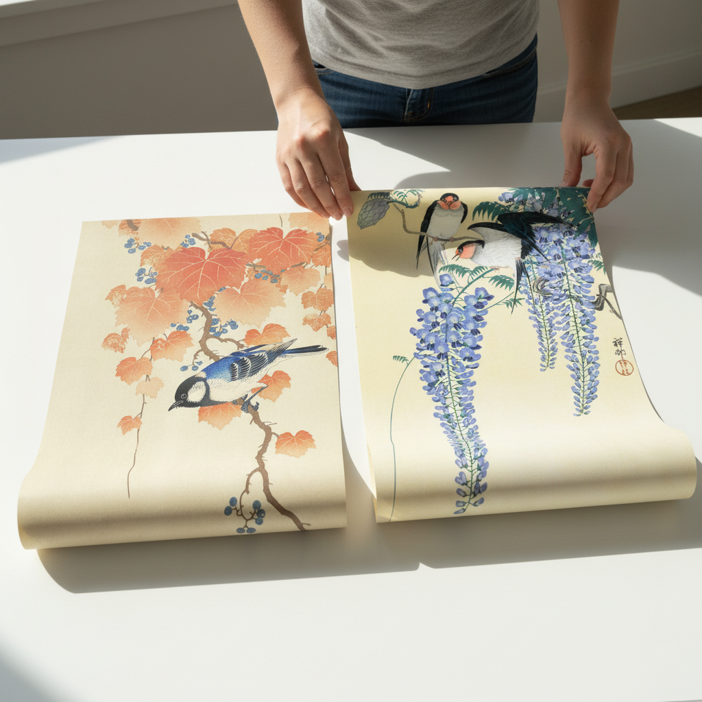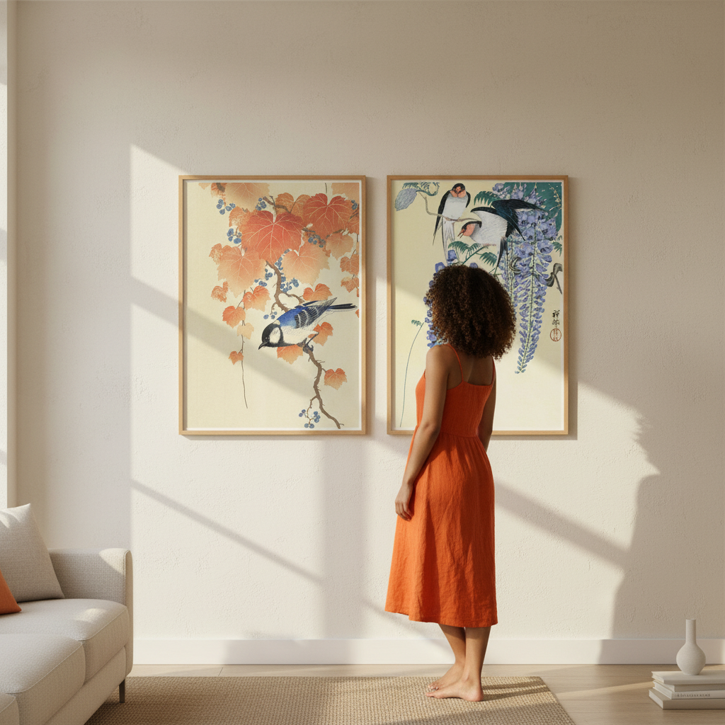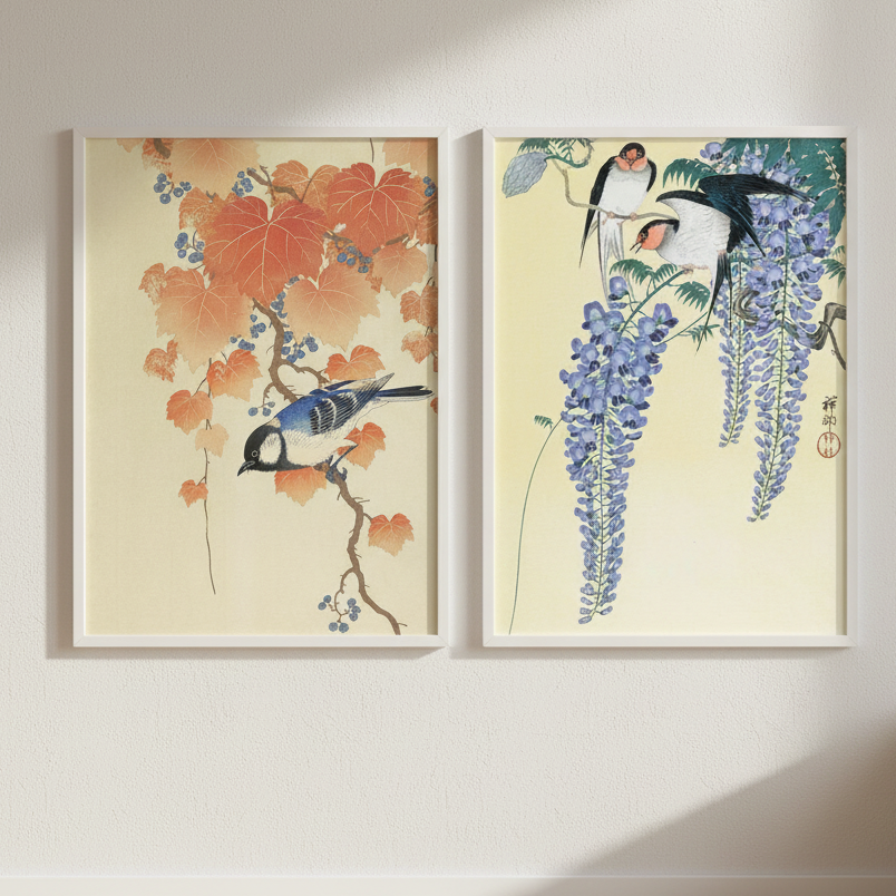 Discover the serene beauty of Japanese woodblock artistry with this exquisite set of two prints by the master Ohara Koson. The first features a bird gracefully perched on an autumn branch adorned with seasonal leaves and berries against a warm beige backdrop, capturing the essence of fall's fleeting elegance. The second showcases traditional Japanese craftsmanship with two birds nestled among delicate wisteria flowers, exemplifying the refined aesthetic of Meiji-era printmaking. Each piece demonstrates Koson's exceptional skill in rendering natural subjects with botanical precision and atmospheric subtlety. Perfect for collectors and enthusiasts of Japanese art, these prints bring timeless sophistication and cultural heritage to any interior space.