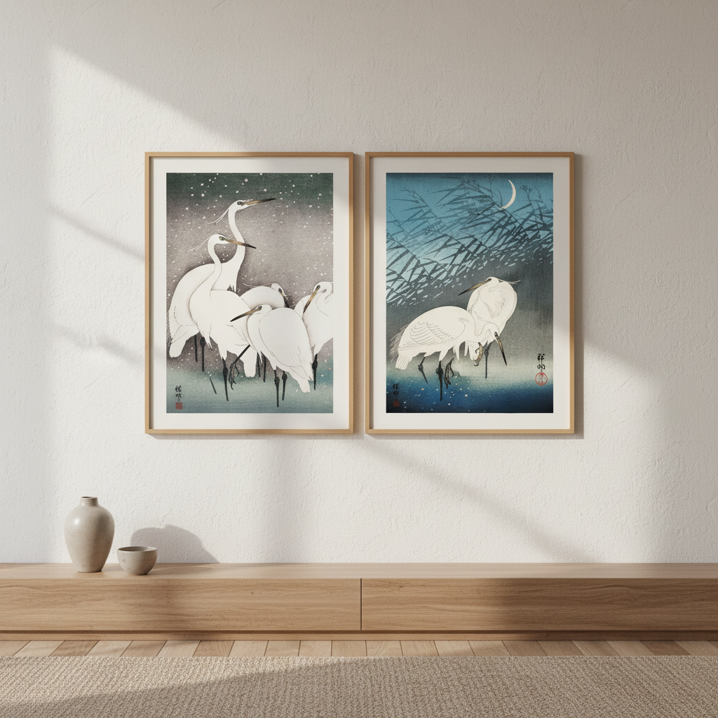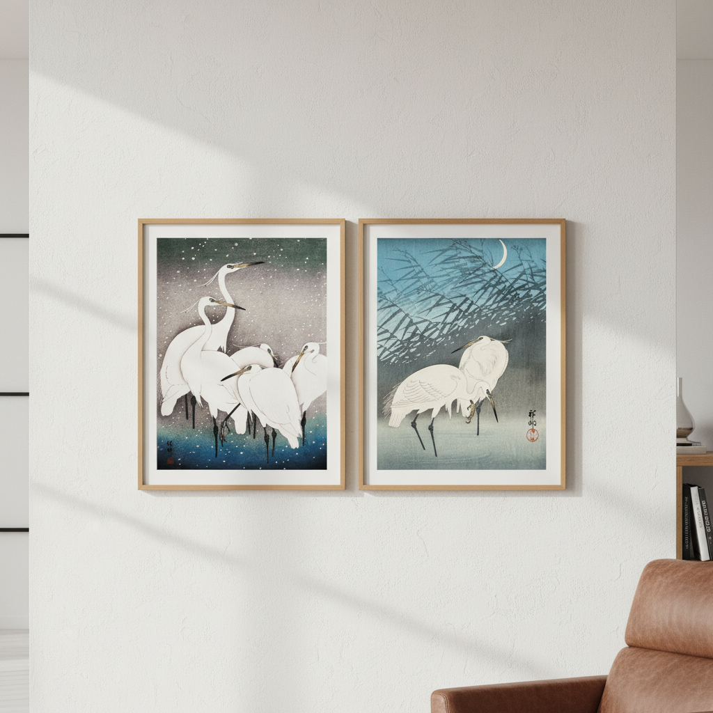 Egret Japanese Birds Woodblock Prints Set of 2 by Ohara Koson